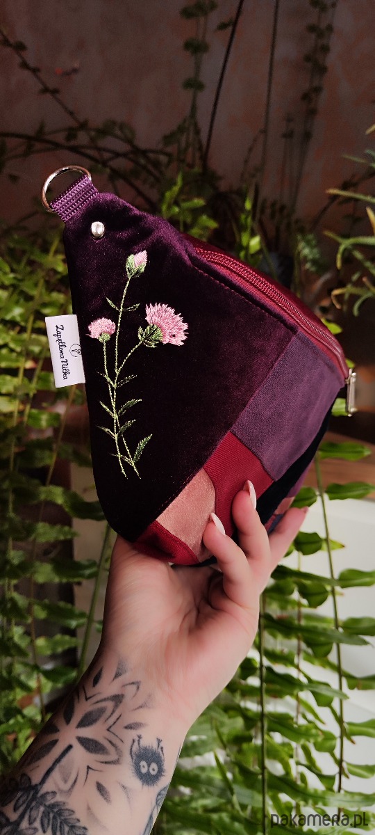 Nerka XXL UNIKAT- tylko 1 sztuka! Uszyta ze skrawków tkanin pochodzących z innych projektów, żeby nie marnować. Po boku nerki dekoracyjny haft goździków. Regulowany pasek nośny z możliwością wymiany (nerka posiada po bokach 2 metalowe półkola, które umożliwiają szybkie zapinanie/ wymianę paska np. na inny kolor). Wymiary: 32cmx18cmx7cm (klapa) .W środku kieszonka zapinana na zamek oraz kieszonka przegródka. Obwód paska wraz z nerką ma wymiary: minimum 95cm obwód, max 140cm obwód (jeśli interesuje Cię inny obwód lub inny kolor paska napisz do mnie wiadomość).