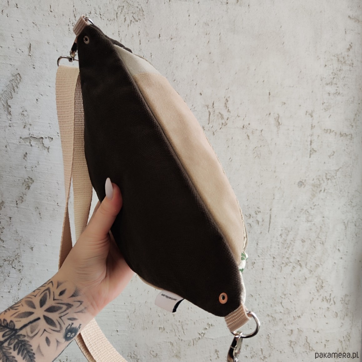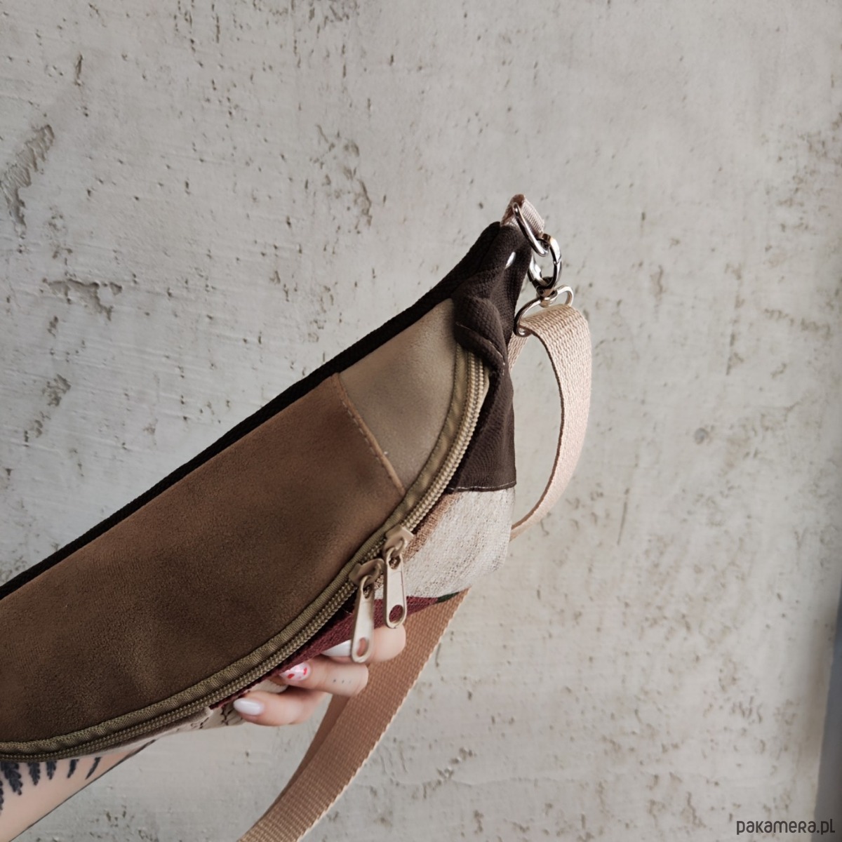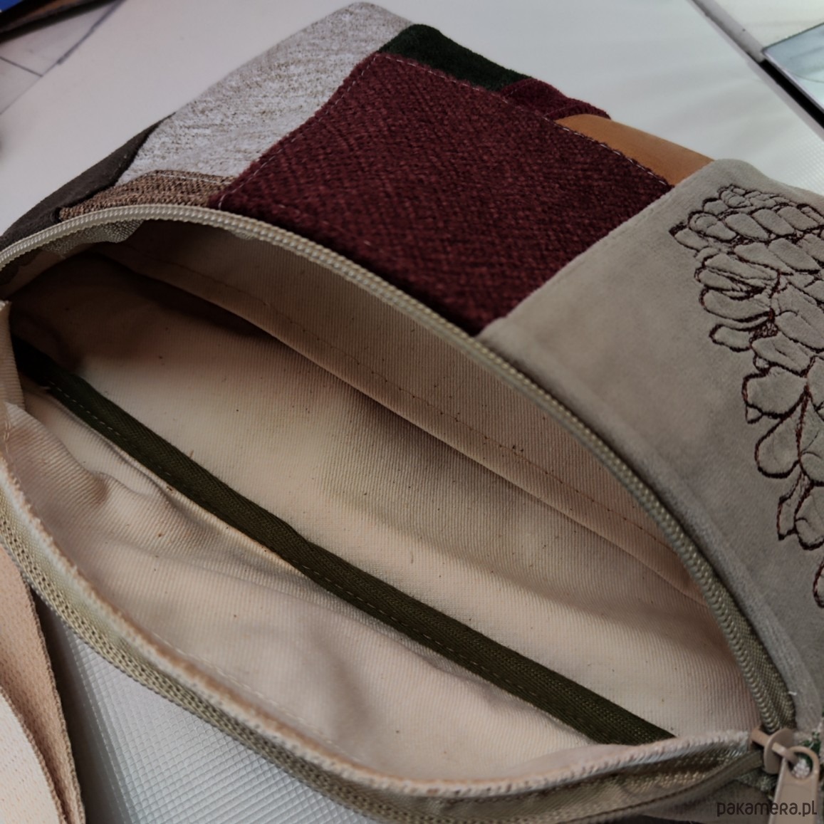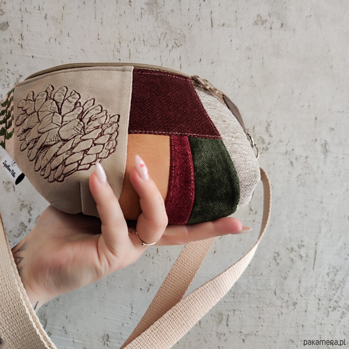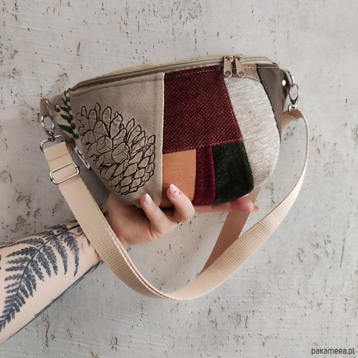 Nerka XXL unikat, tylko jedna sztuka! Nerka stworzona z końcówek tkanin żeby nie marnować, zero waste patchwork. Na przodzie nerki element ozdobny w formie haftu szyszki. Wymiary nerki 32cmx17cmx7cm(klapa). Wewnątrz wszyta beżowa bawełniana gruba podszewka, wewnątrz nerki również znajduje się kieszonka przegródka. W komplecie do nerki regulowany pasek szeroki na 2,5 cm z grubej bawełny w kolorze beżowym.