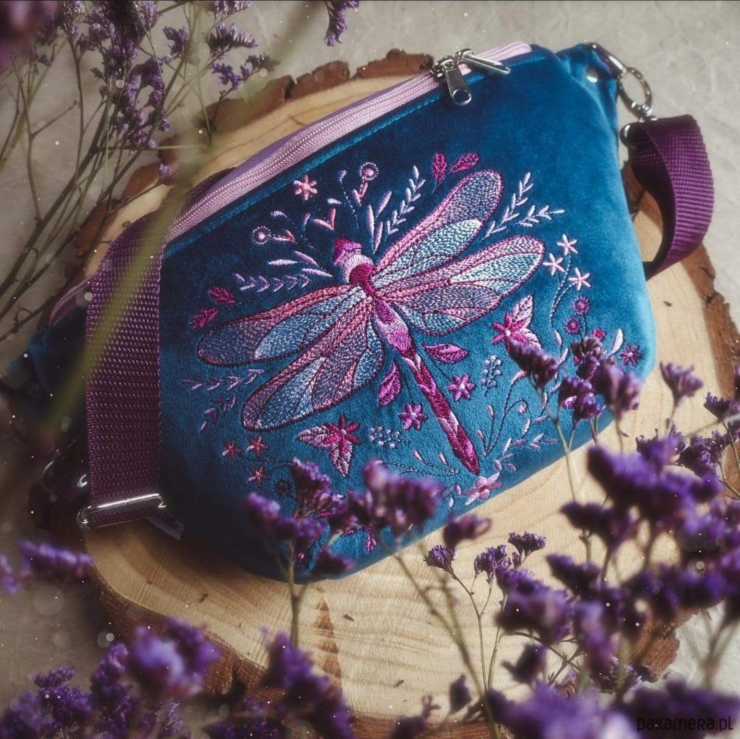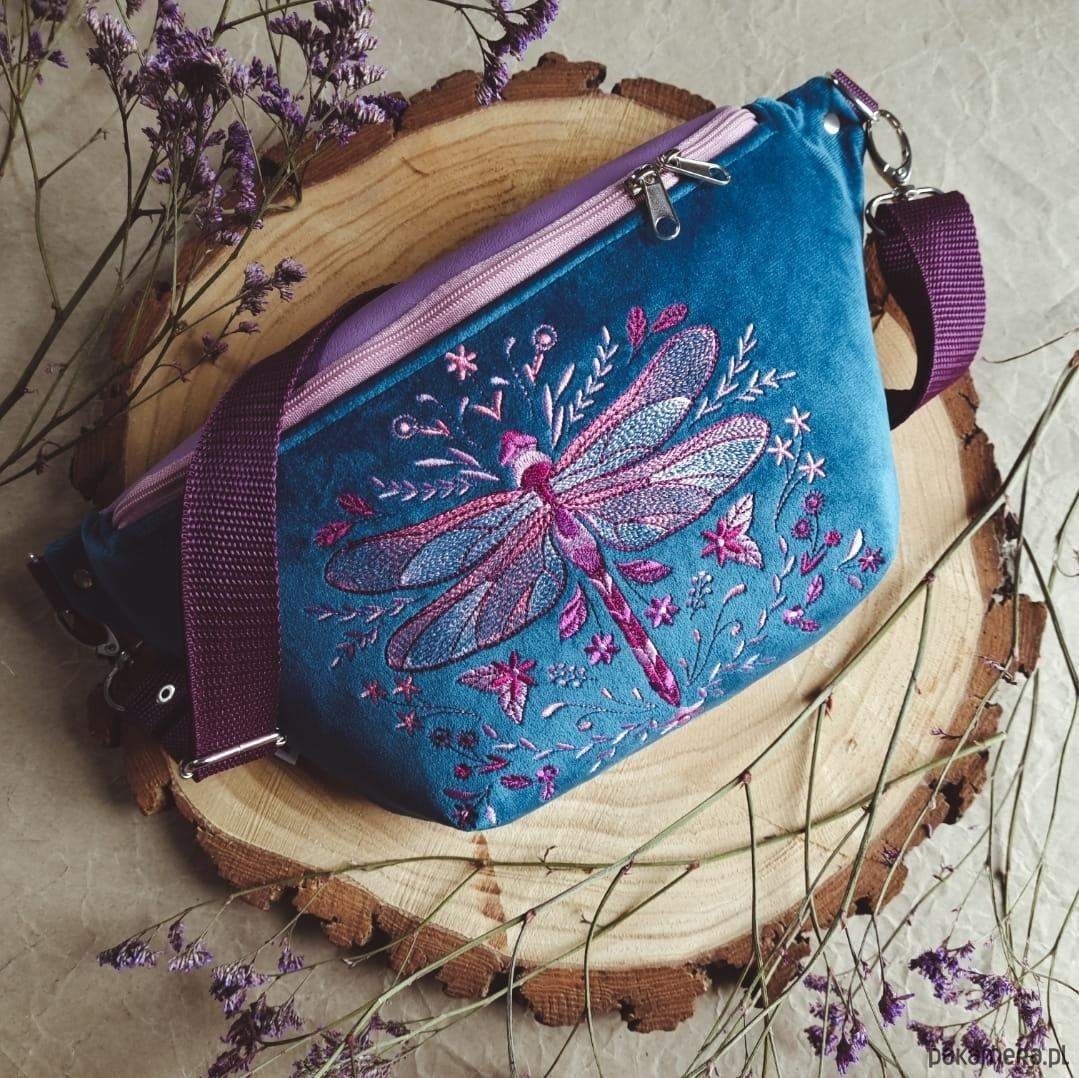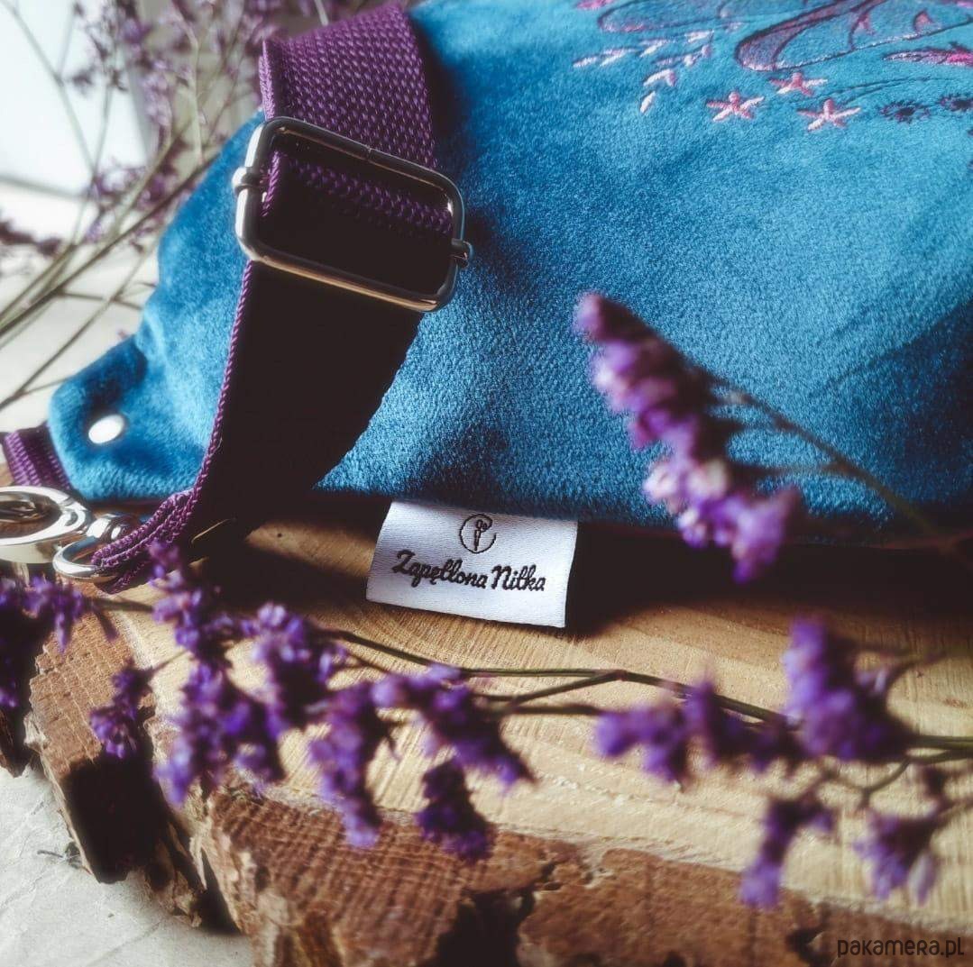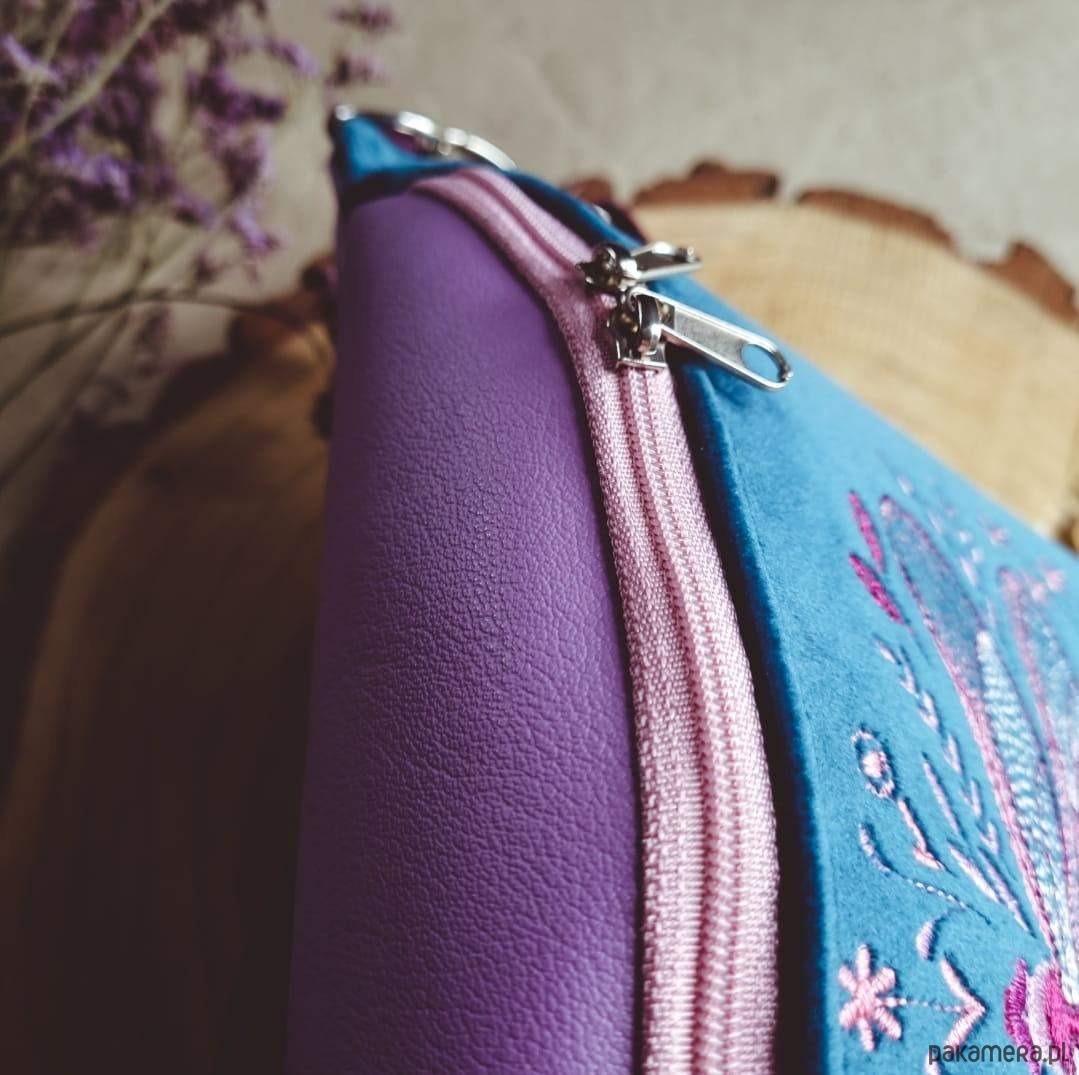 - nerka uszyta z aksamitu kolor turkusowy ( przód nerki), eko skóry lawendowej (tył i klapa nerki) oraz bawełny (podszewka). Możliwość zamiany elementów eko skóry na aksamit taki jak przód nerki