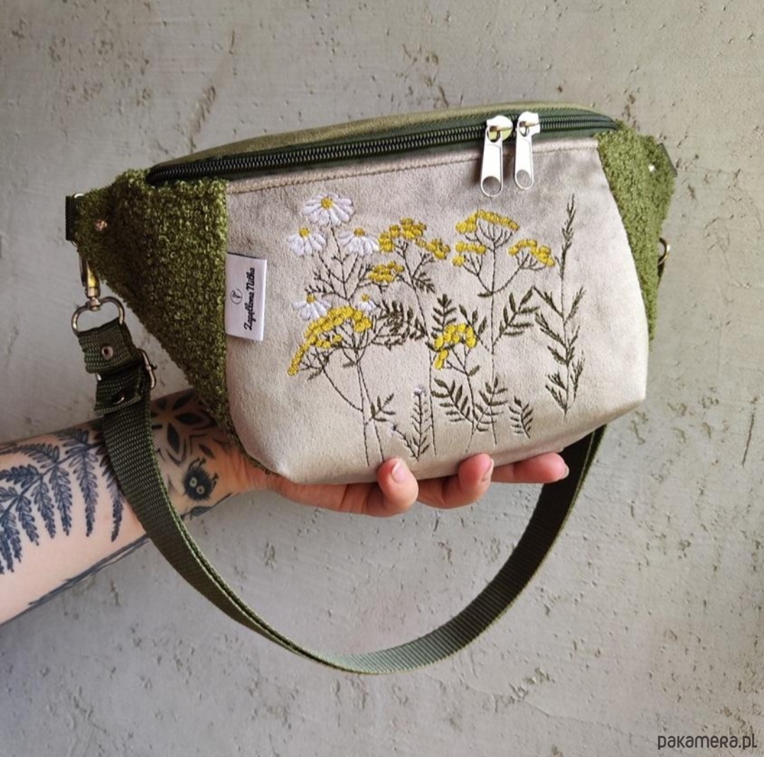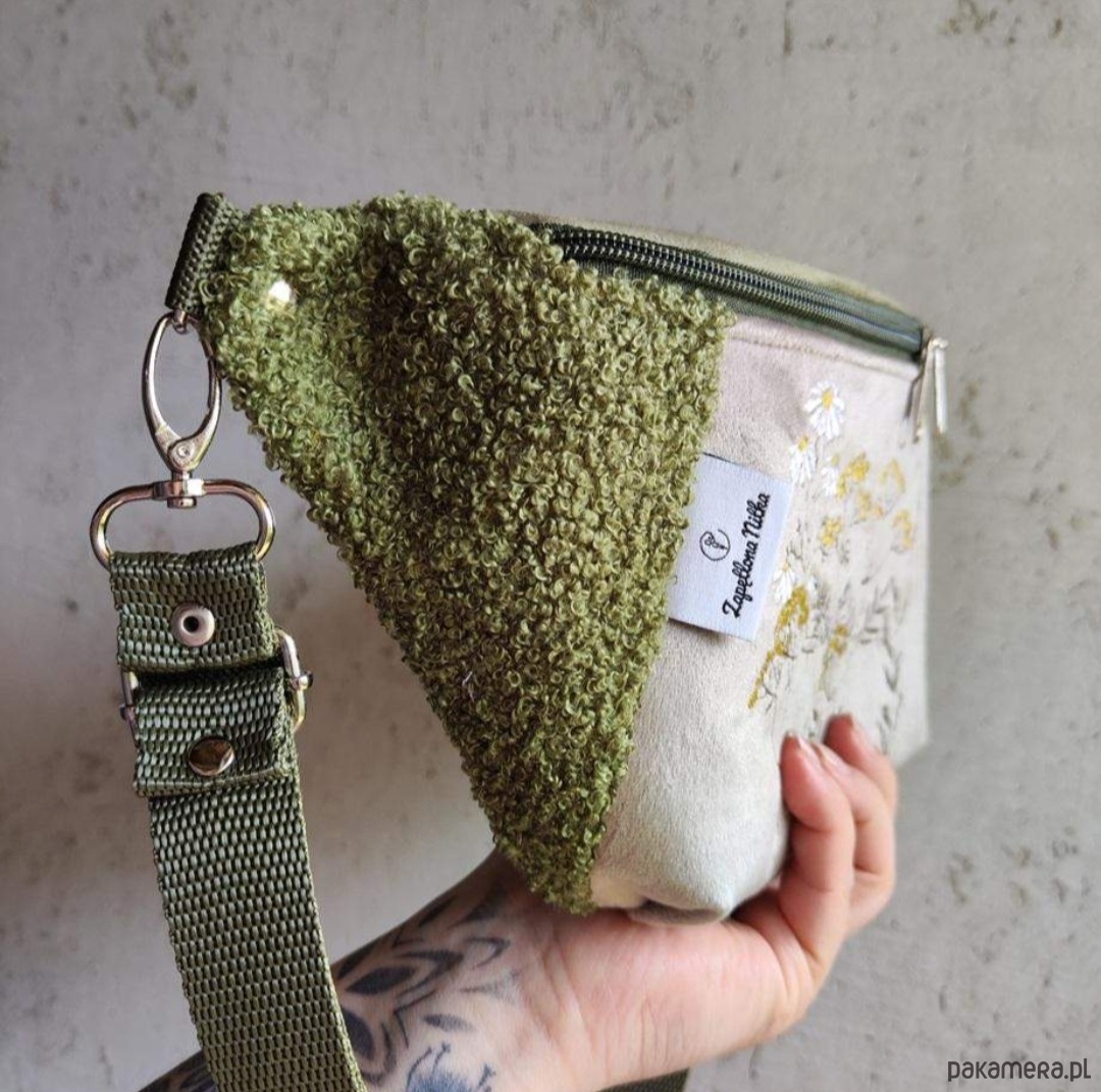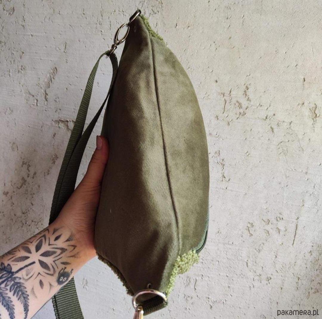 Nerka uszyta z aksamitu beżowo szarego, aksamitu khaki, tkaniny baranek w kolorze zielonym khaki oraz bawełny (podszewka). Regulowany pasek nośny z możliwością wymiany (nerka posiada po bokach 2 metalowe półkola, które umożliwiają szybkie zapinanie/ wymianę paska np. na inny kolor). Wymiary: 32cmx18cmx7cm(klapa). Kieszonka w formie przegródki na tylnej ściance (środek nerki). Obwód paska wraz z nerką ma wymiary: minimum 95cm obwód, max 140cm obwód (jeśli interesuje Cię inny obwód lub inny kolor paska napisz do mnie wiadomość). Na przodzie haft komputerowy.