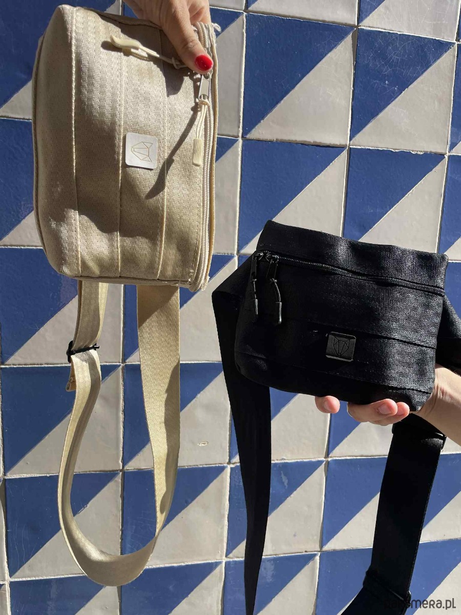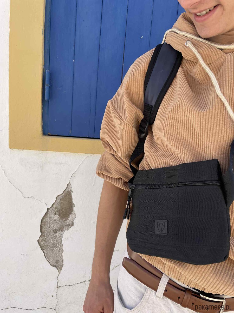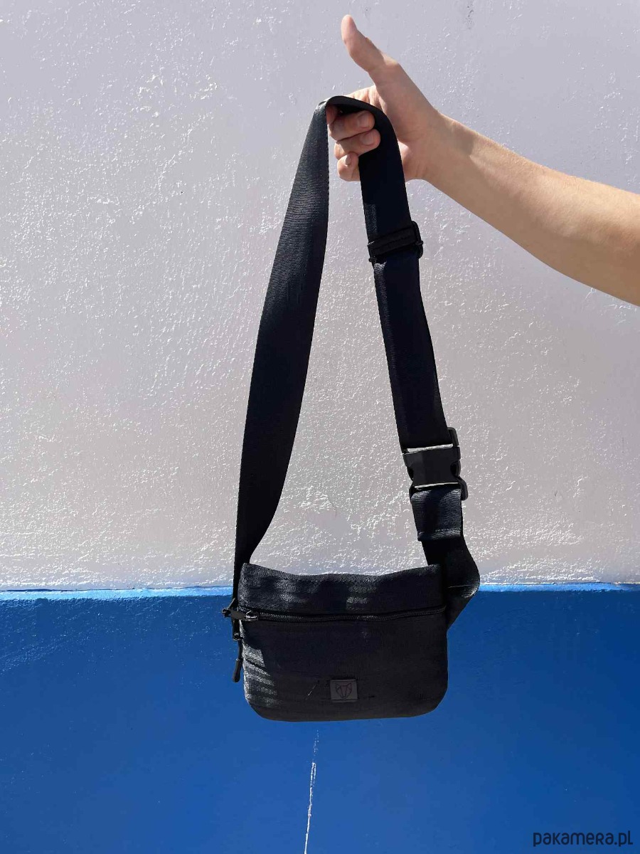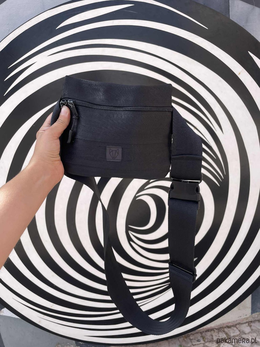 Czarna torebka/nerka średniej wielkości wykonana z samochodowych pasów bezpieczeństwa.