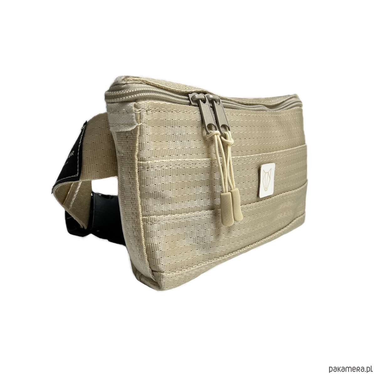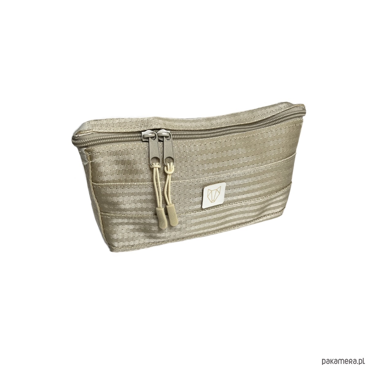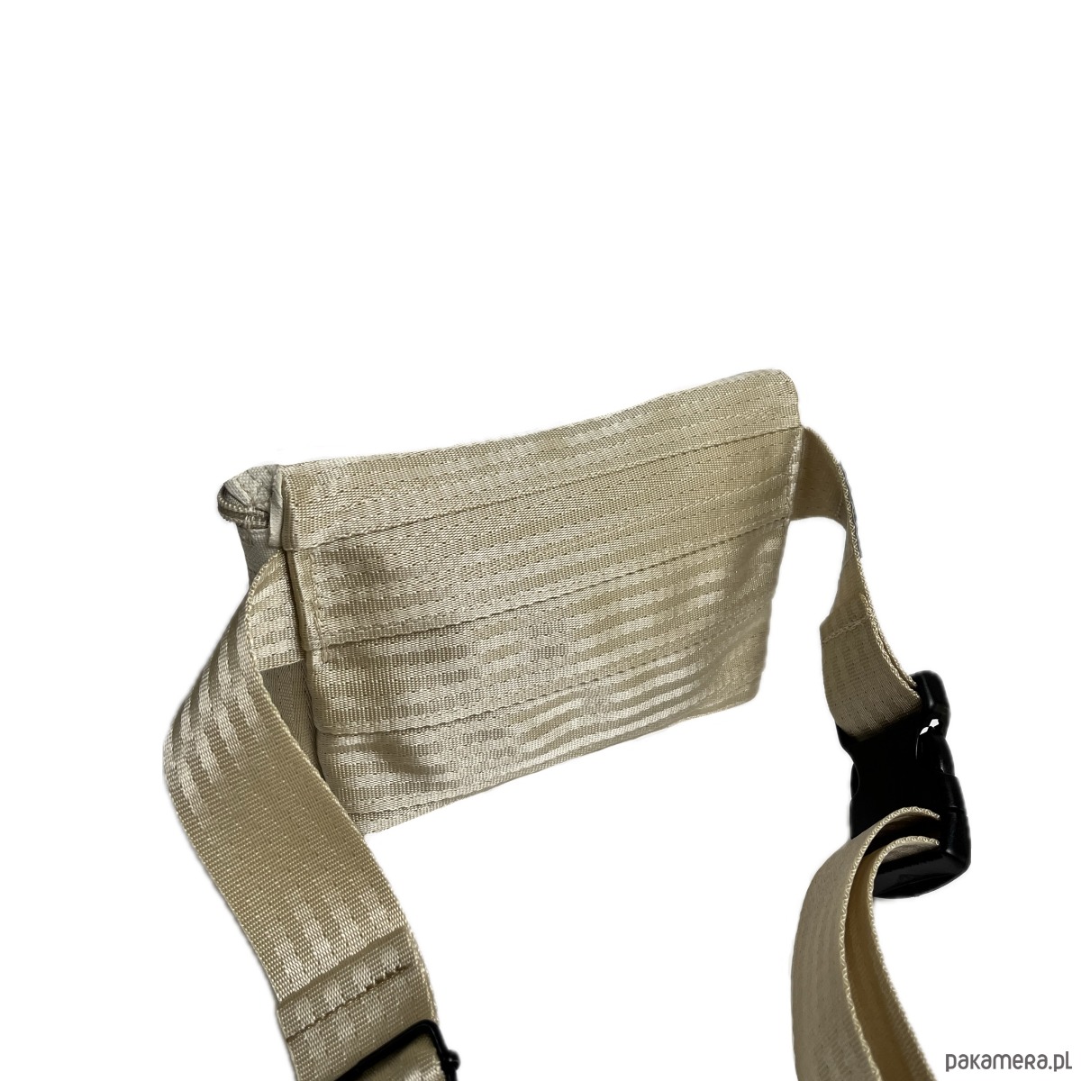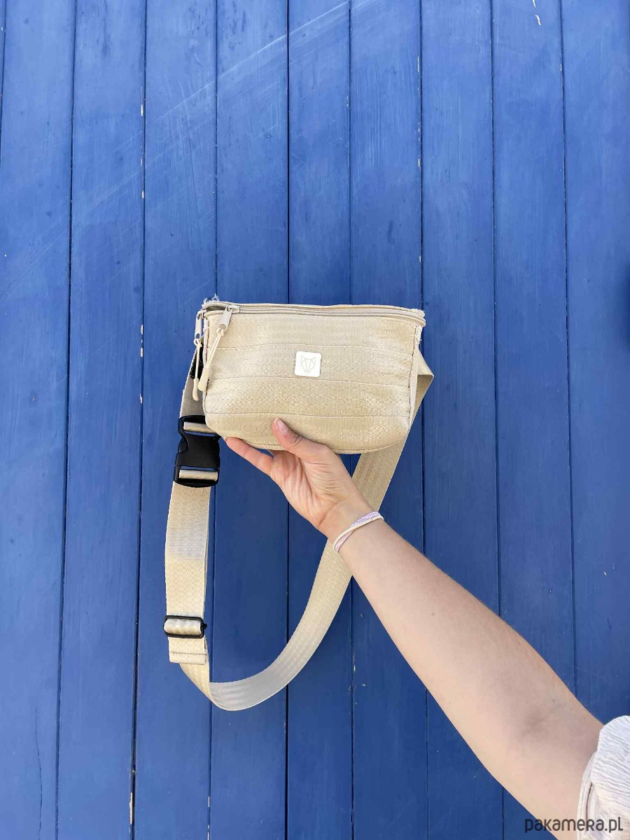 Beżowa torebka/nerka średniej wielkości wykonana z samochodowych pasów bezpieczeństwa.