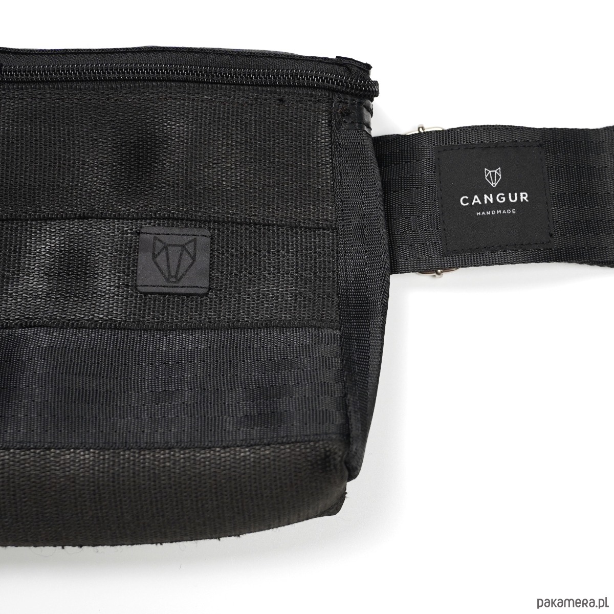 Czarna torebka/nerka średniej wielkości wykonana z samochodowych pasów bezpieczeństwa.