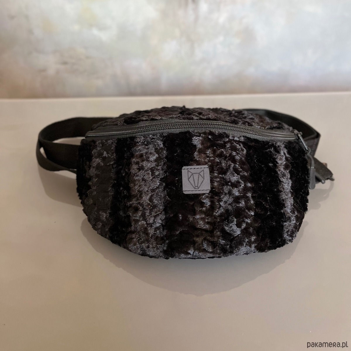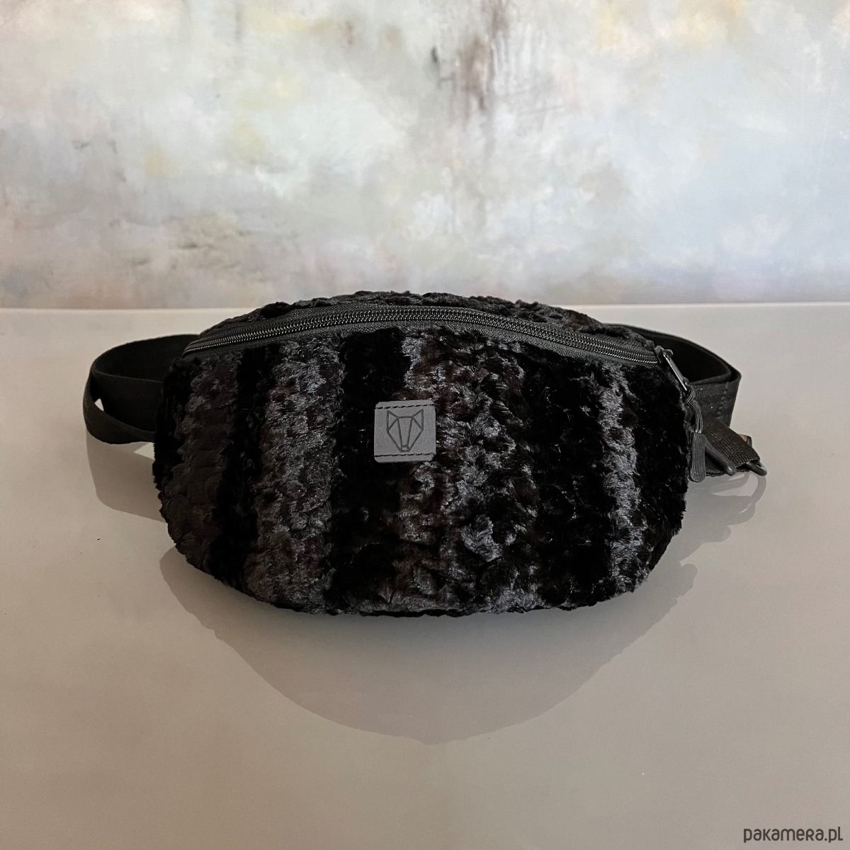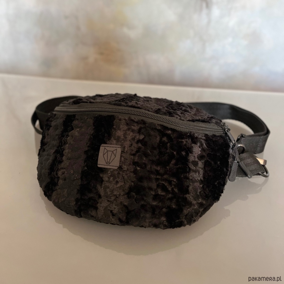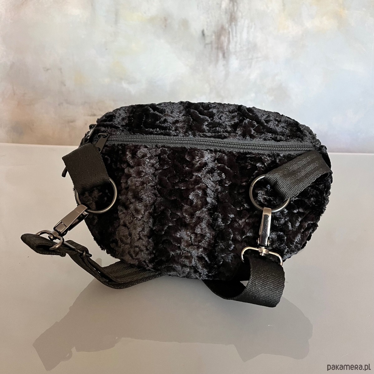 Czarna średniej wielkości torba na ramię/nerka wykonana ręcznie z eko futra stylizowanego na karakuły, tkaniny oxford typu kodura oraz pasów samochodowych. Zapinana na zamek, posiada regulowany pasek( max 120cm), możesz ją nosić tak jak lubisz przez ramię lub na pasku. Na zewnątrz tylna kieszeń zapinana na zamek.
