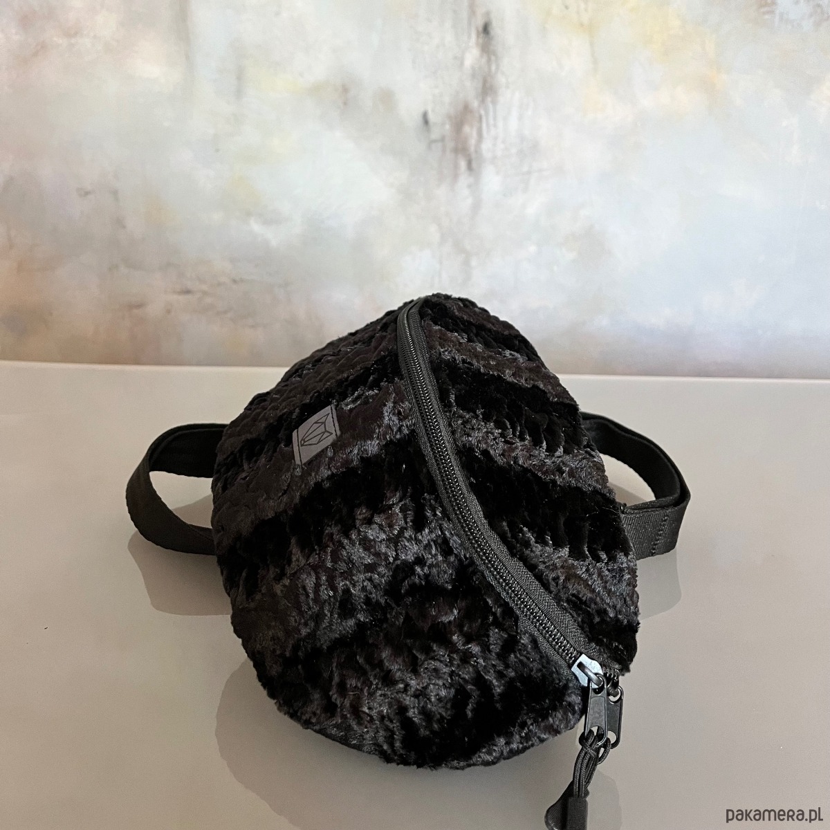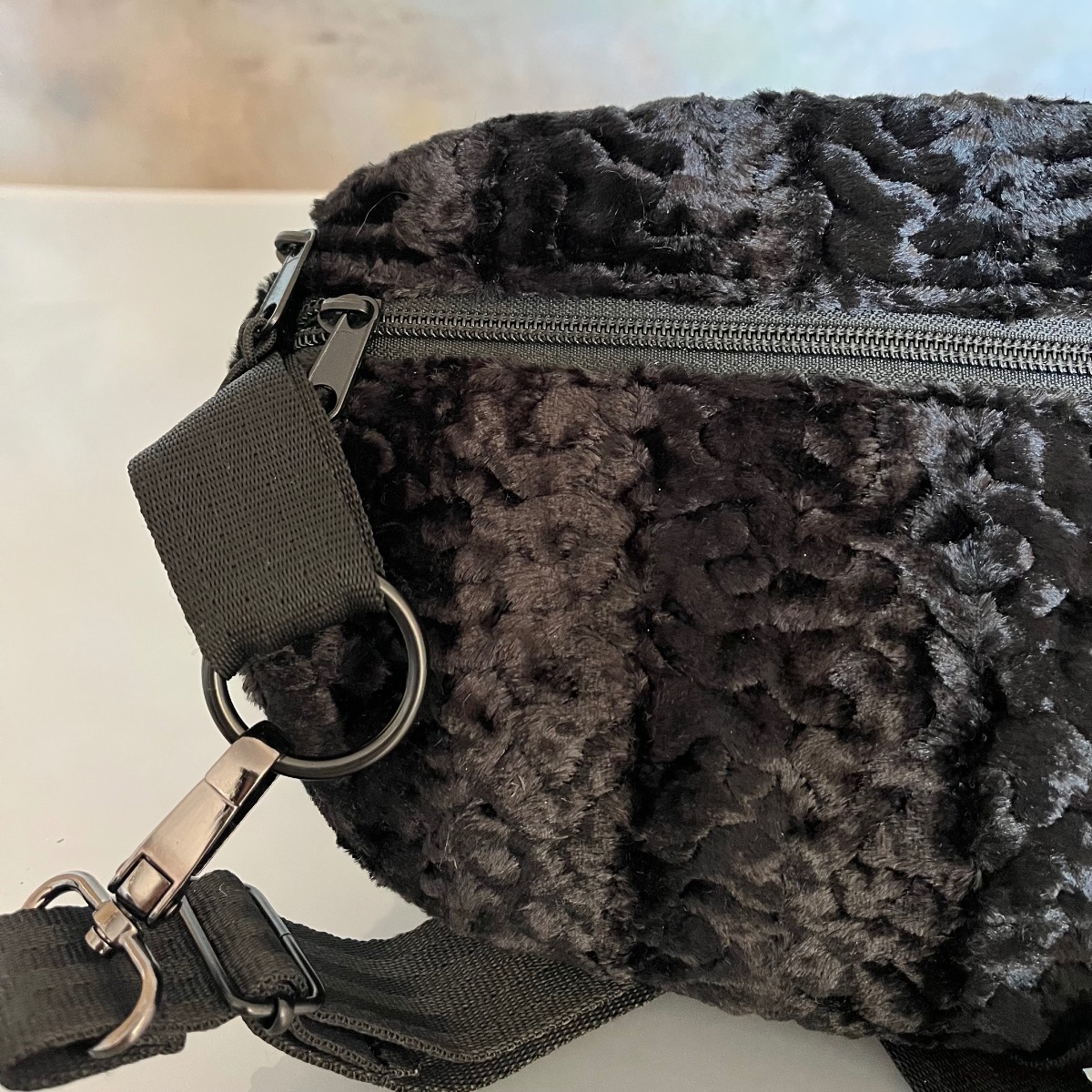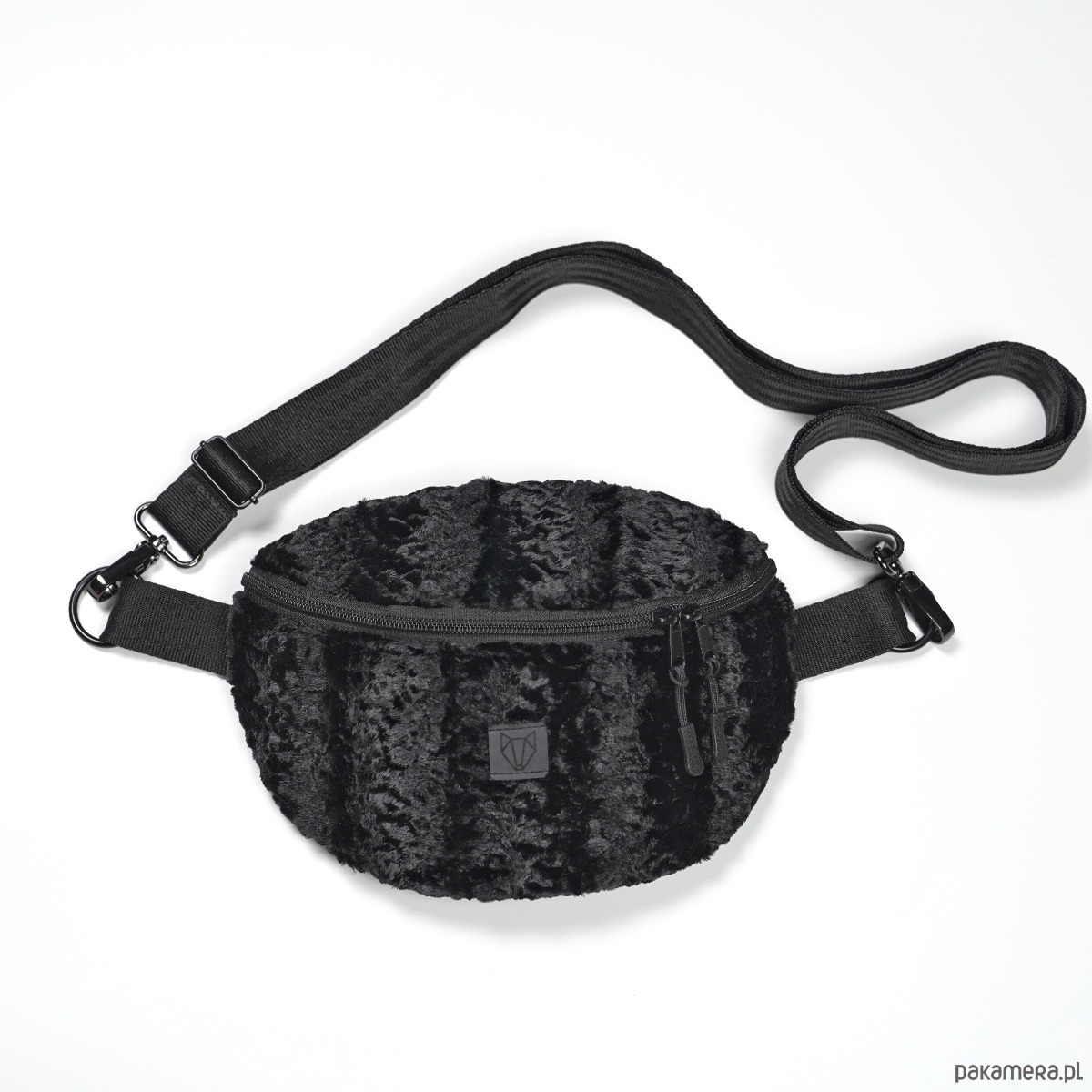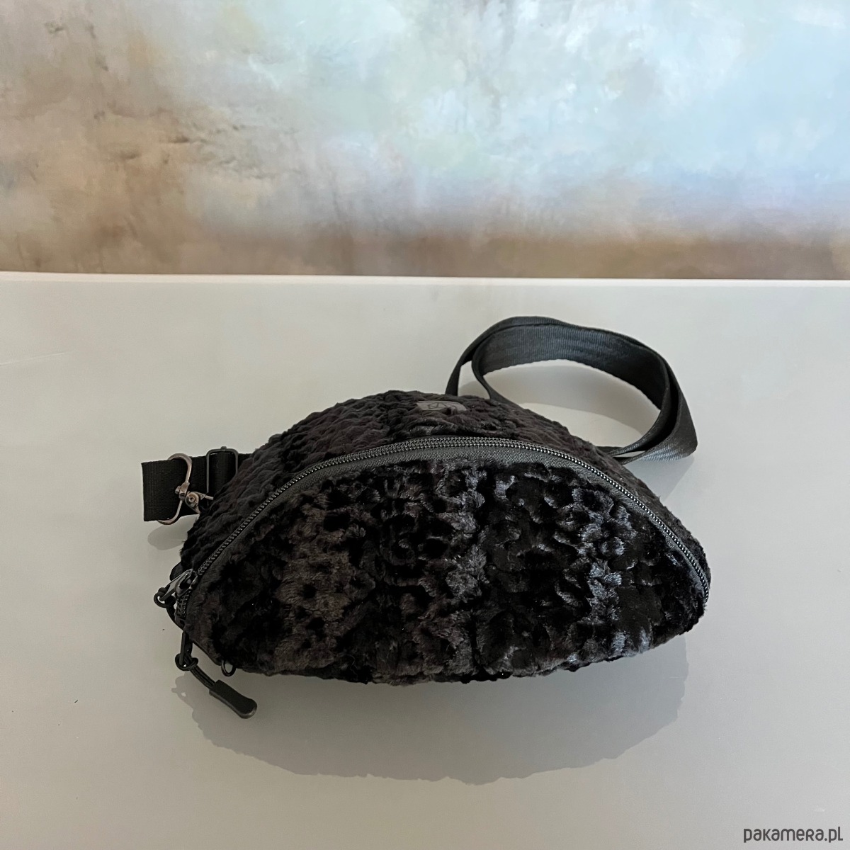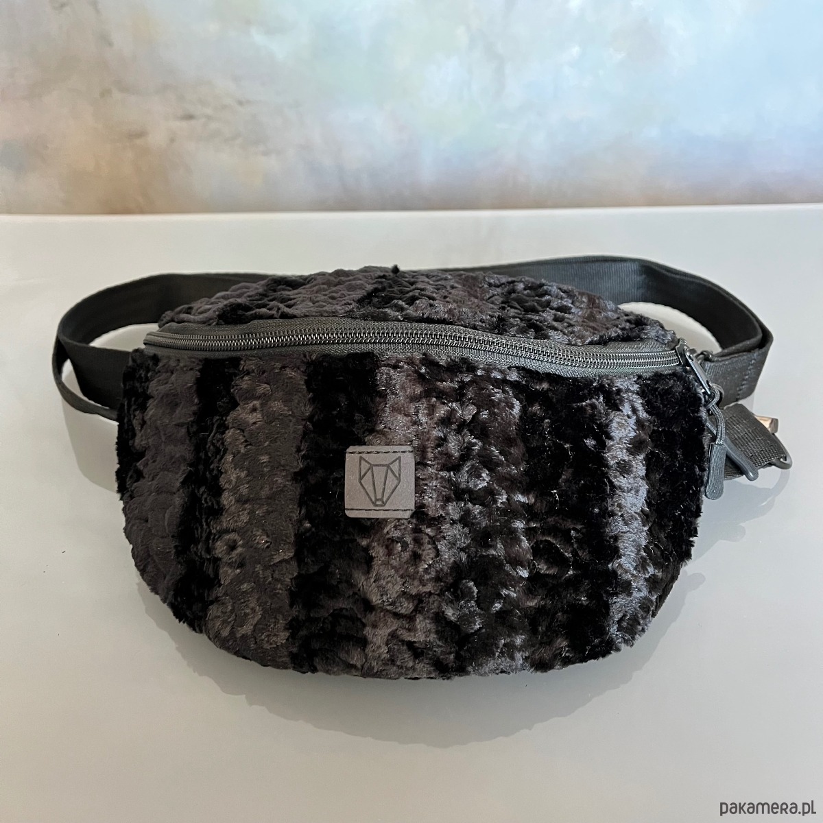 Czarna średniej wielkości torba na ramię/nerka wykonana ręcznie z eko futra stylizowanego na karakuły, tkaniny oxford typu kodura oraz pasów samochodowych. Zapinana na zamek, posiada regulowany pasek( max 120cm), możesz ją nosić tak jak lubisz przez ramię lub na pasku. Na zewnątrz tylna kieszeń zapinana na zamek.