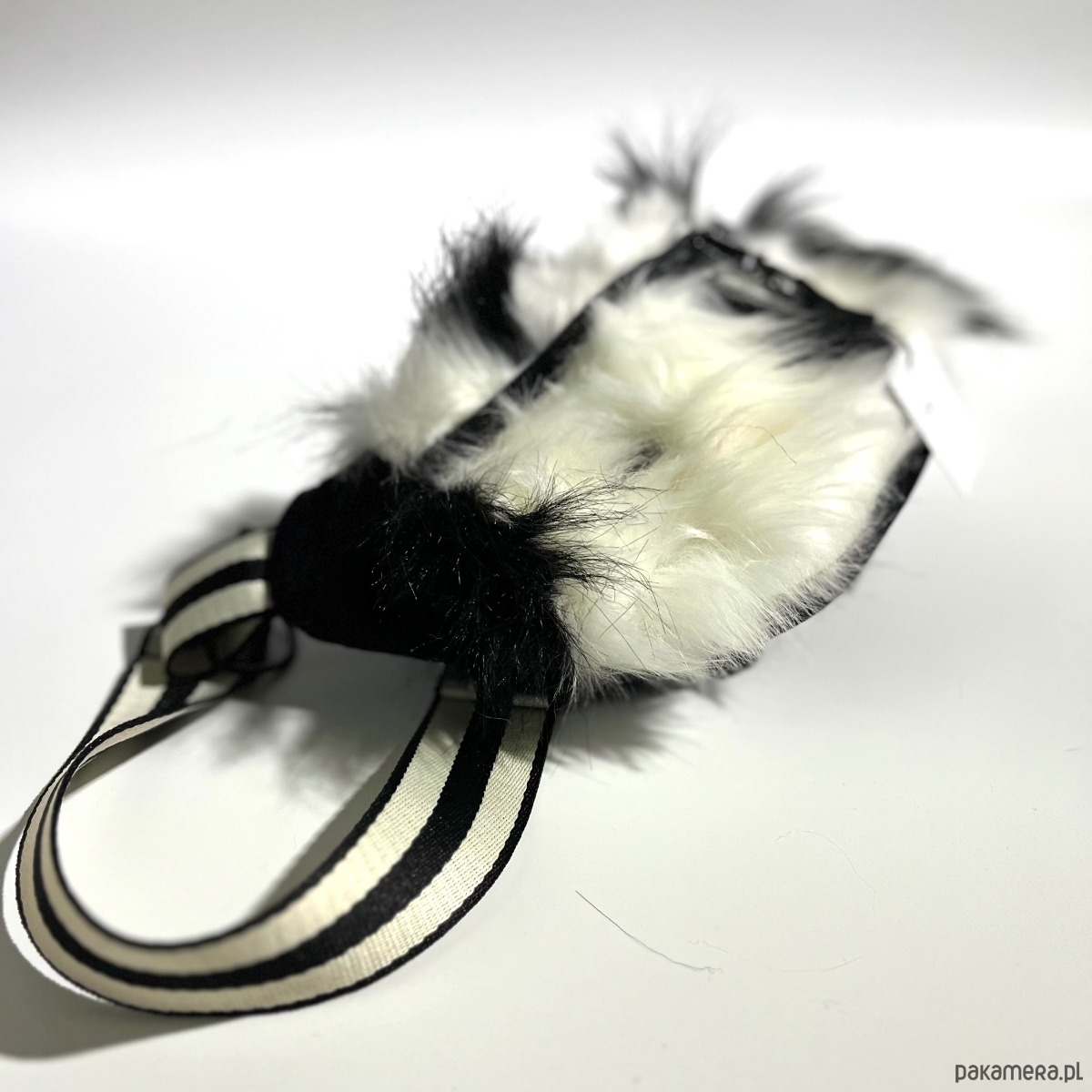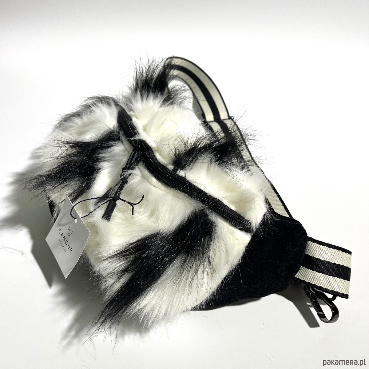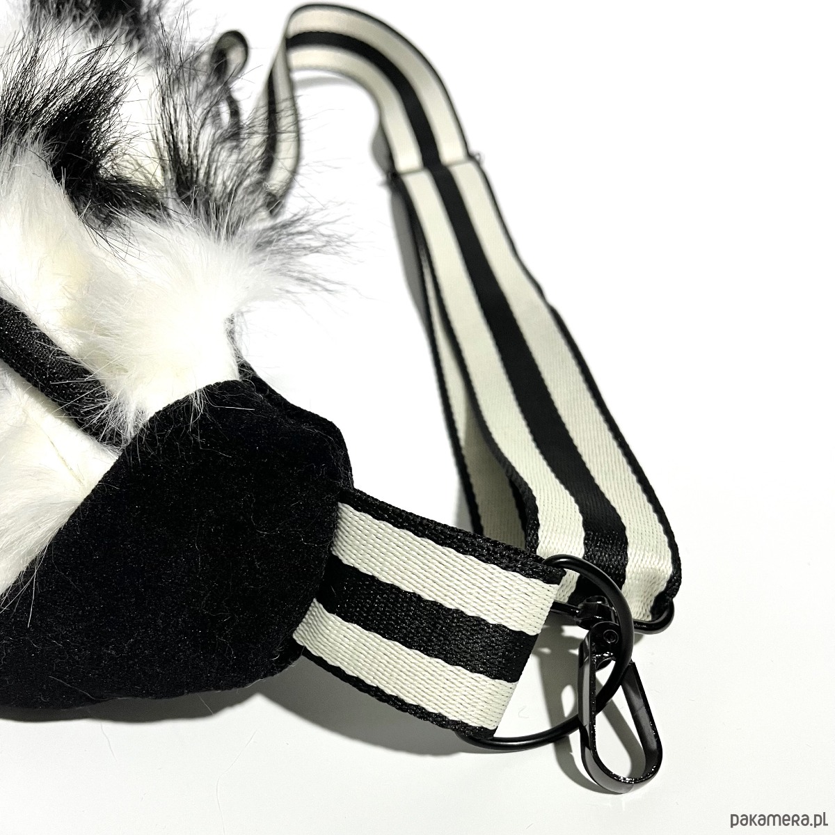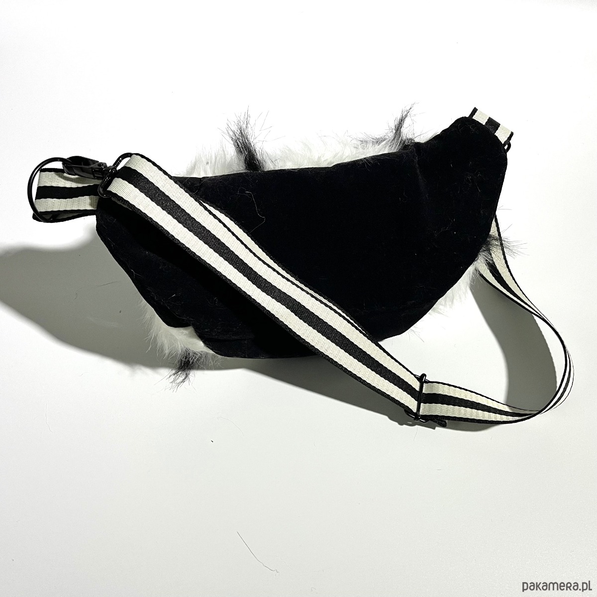 Futerkowa duża nerka, w całości wykonana z poddanych upcyklingowi materiałom – dając nowe życie wyrzuconym materiałom i zamieniając je w nowoczesną i ekologiczną torebkę. Wykorzystałam do jej uszycia pozostałych po realizacji projektu scenografii - sztuczne futro w kolorze biało czarnym oraz czarny aksamit.