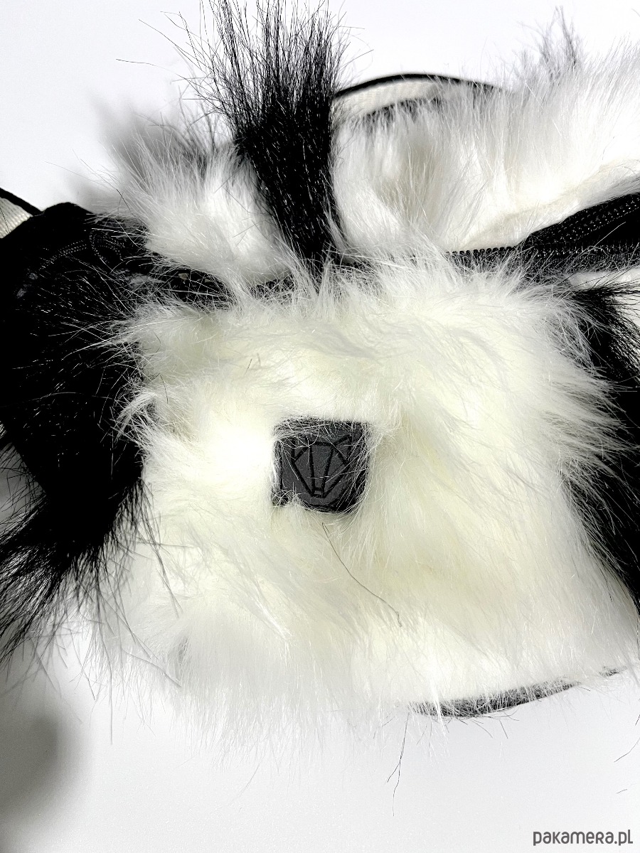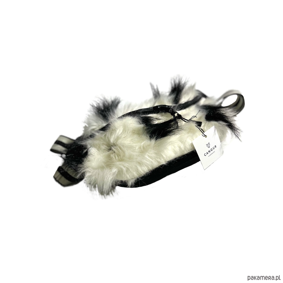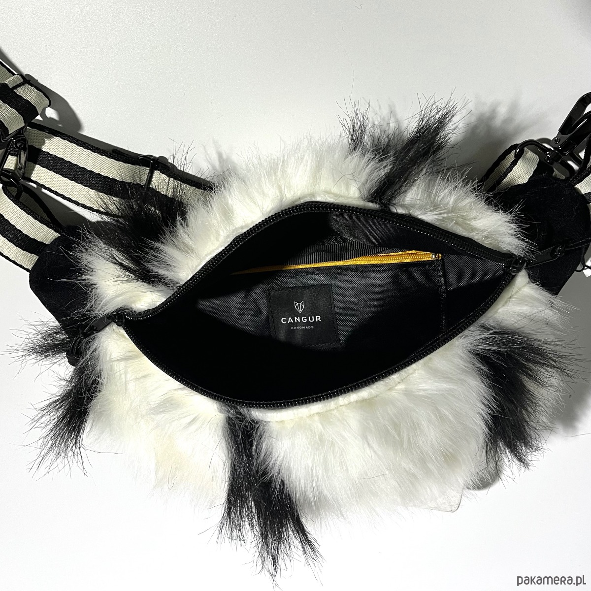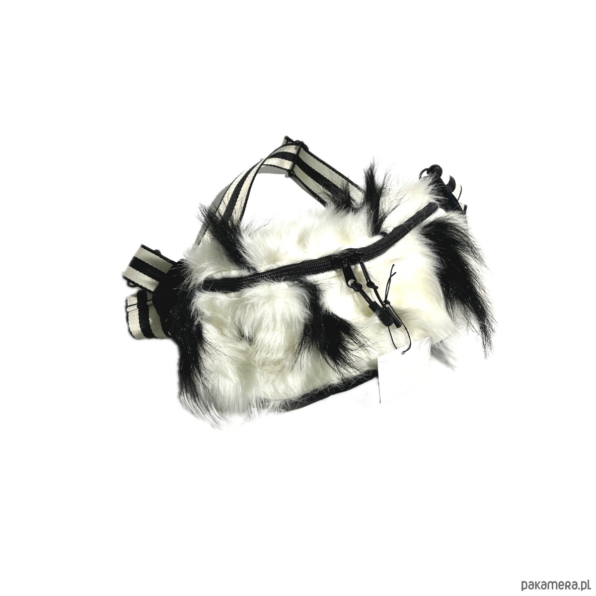 Futerkowa duża nerka, w całości wykonana z poddanych upcyklingowi materiałom – dając nowe życie wyrzuconym materiałom i zamieniając je w nowoczesną i ekologiczną torebkę. Wykorzystałam do jej uszycia pozostałych po realizacji projektu scenografii - sztuczne futro w kolorze biało czarnym oraz czarny aksamit.