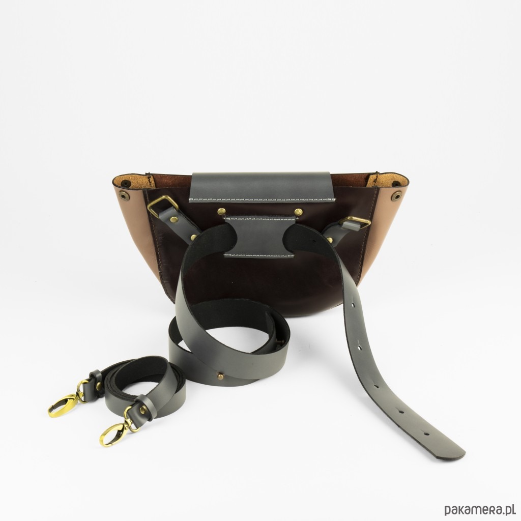 Mała torebka zmieniająca się w Nerkę wykonana z czterech rodzajów skóry naturalnej. Zapinana na klapkę z dwoma magnesami, wykończoną okrągłymi skórzanymi aplikacjami. W środku ręcznie tłoczona skórzana metka. Z boku torby znajdują się zatrzaski, dzięki którym można nadać jej bardziej tradycyjny, ponadczasowy kształt. Z tyłu przymocowane są uchwyty do długiego, klasycznego paska, służącego do noszenia torebki przez ramię. Między nimi przyszyta jest szlufka do szerszego, zapinanego na knopiki pasa. Dzięki niej torbę można nosić także jako Nerkę – w pasie, lub przez ramię. Torebka wyposażona jest w dodatkową saszetkę, zapinaną na suwak w kolorze złotym. Usztywnione dno. Uszyta i wykończona ręcznie w Warszawie.