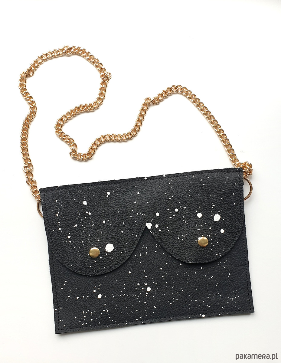 Skórzana nerka w kolorze czarnym nakrapiana bardzo trwałą, białą farbą do skóry.