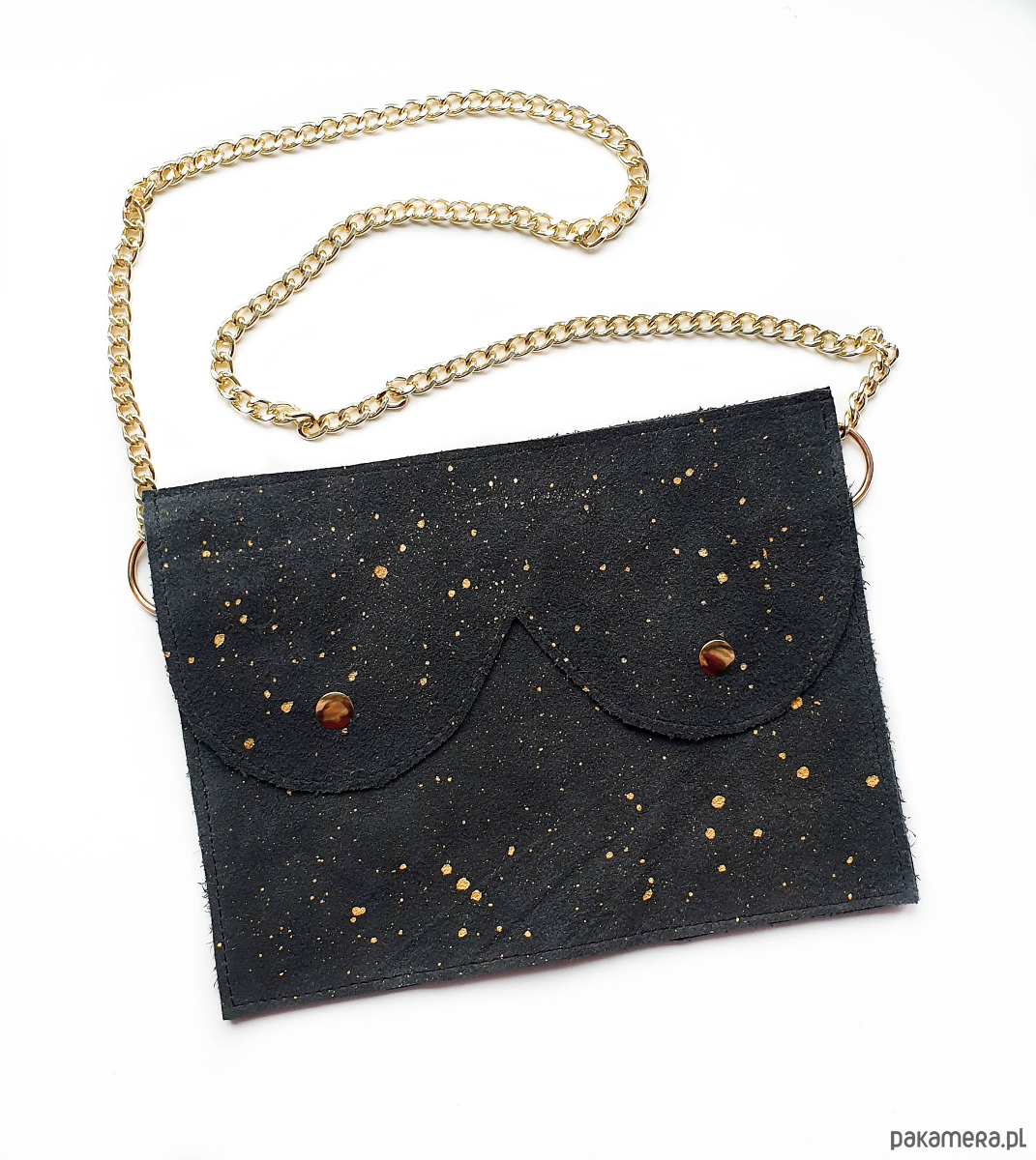 Skórzana, zamszowa nerka w kolorze czarnym nakrapiana bardzo trwałą, złotą farbą do skóry.