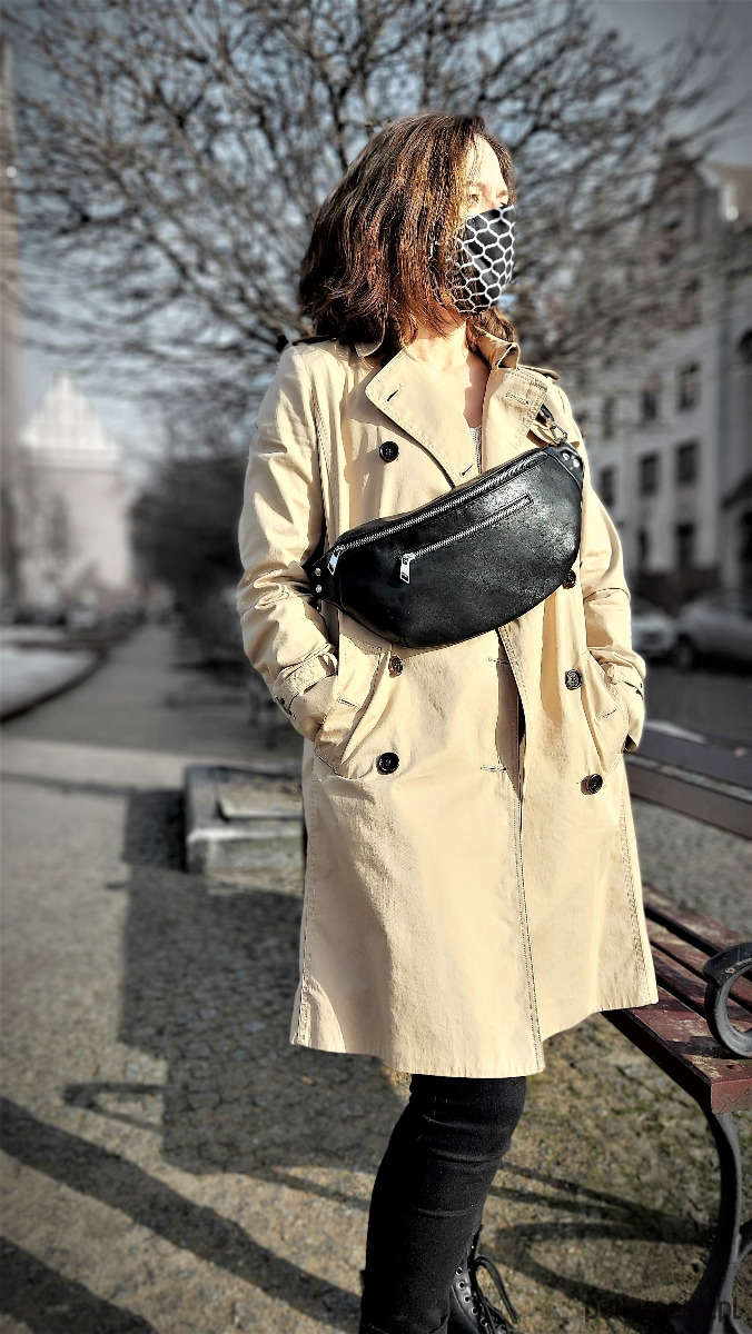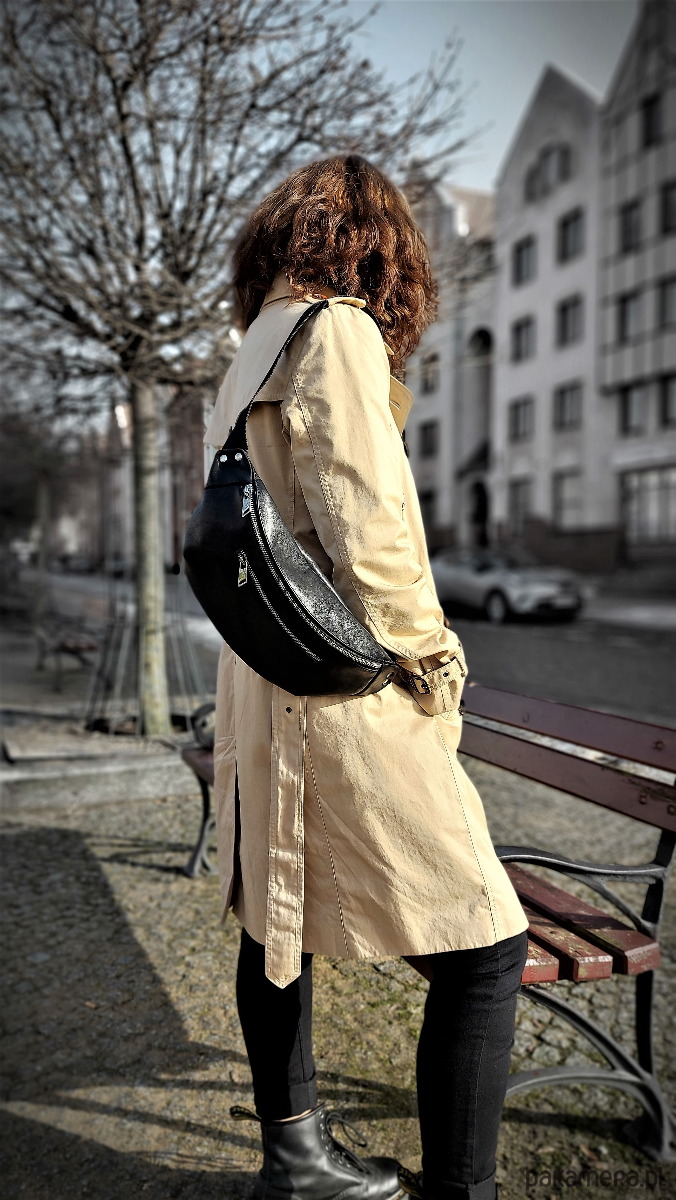 Oryginalna torebka nerka do noszenia przez ramię wykonana z naturalnej gładkiej czarnej skóry. Parciany 4cm pasek regulowany wykończony karabińczykami. Duża pojemna, spokojnie pomieści dokumenty, portfel, klucze, telefon i wiele innych rzeczy. Nasza nerka to propozycja uniwersalna nadająca się dla ludzi aktywnych, na wypady i spacery jak również do pracy i na uczelnię.