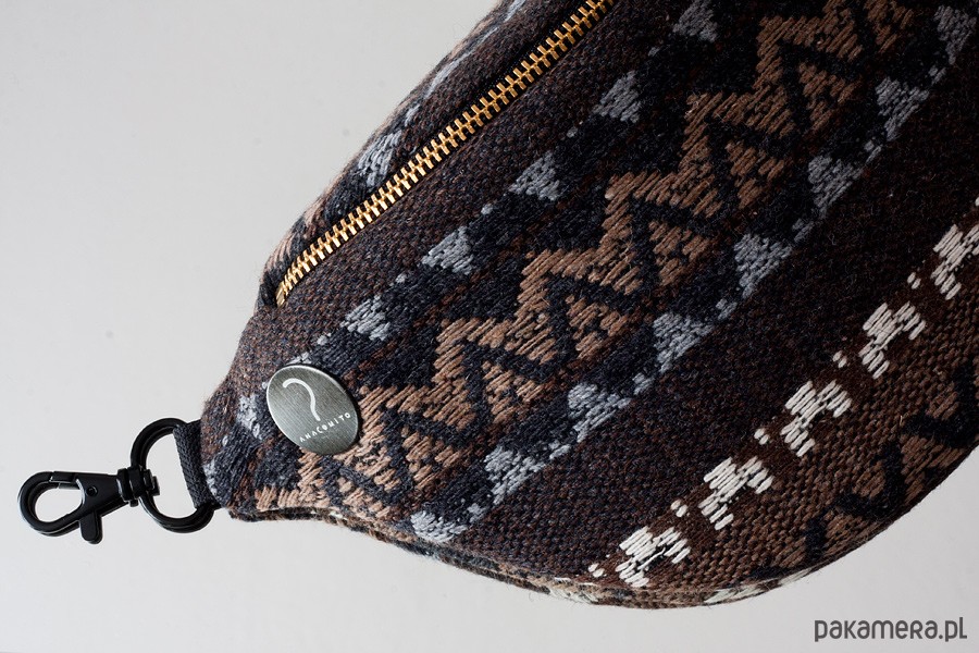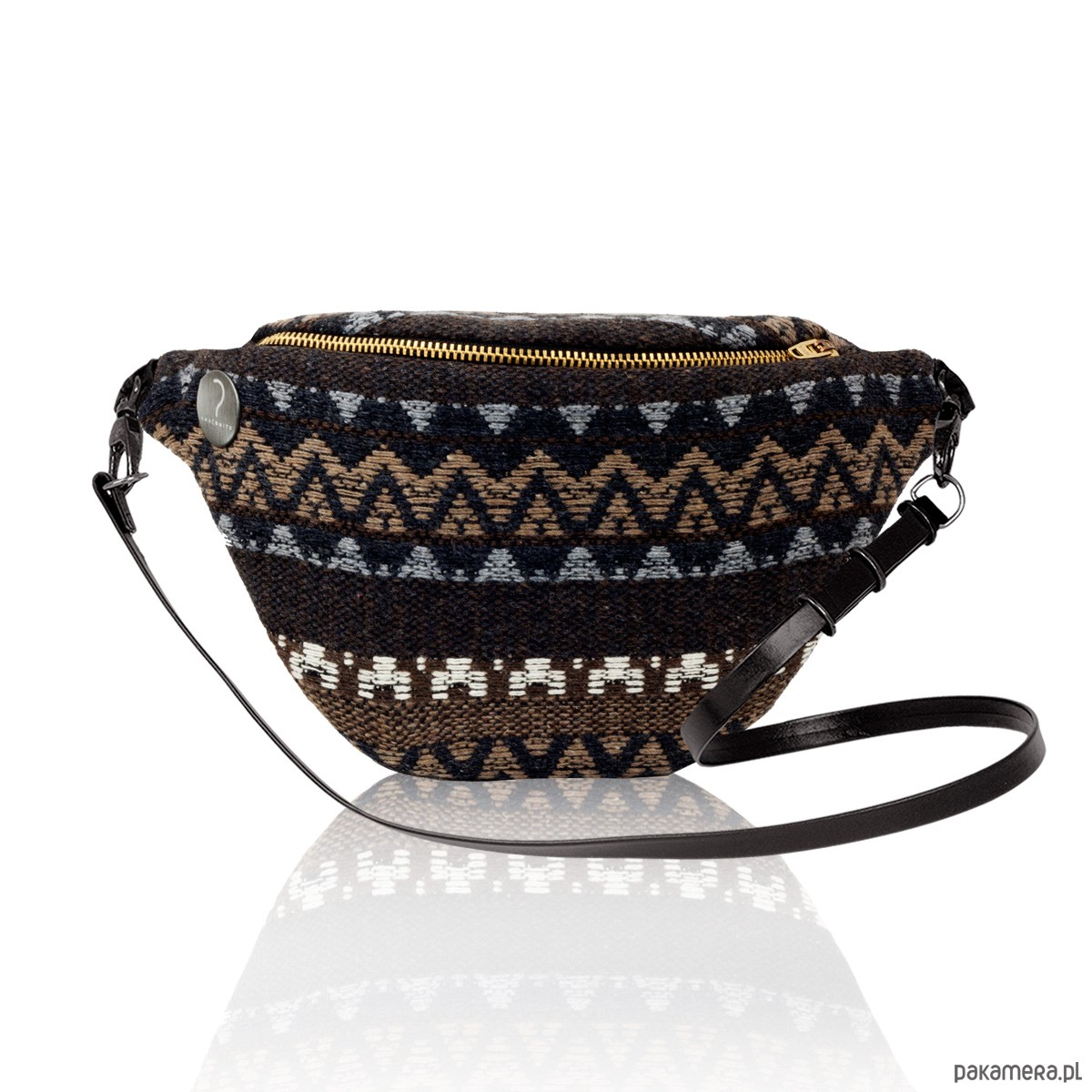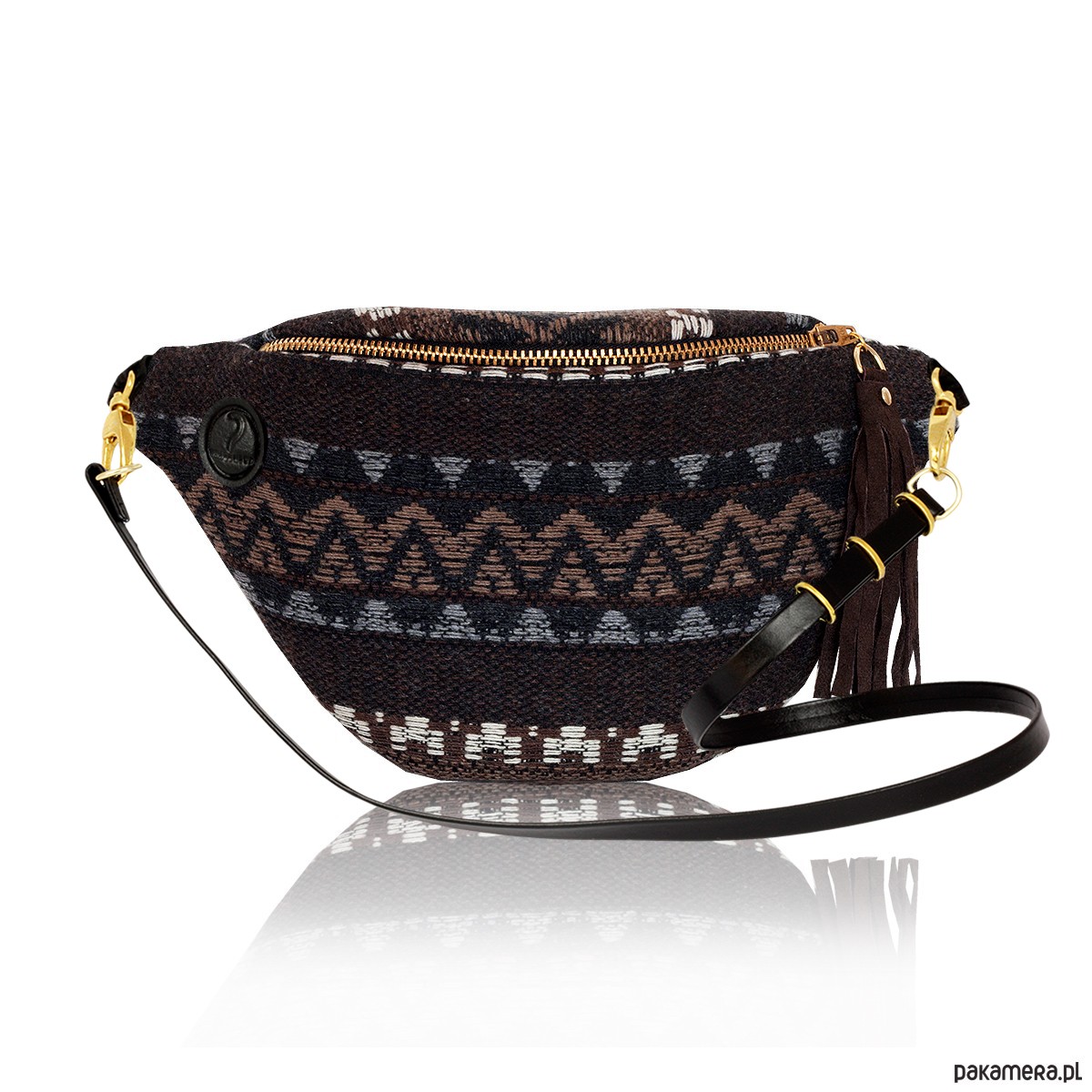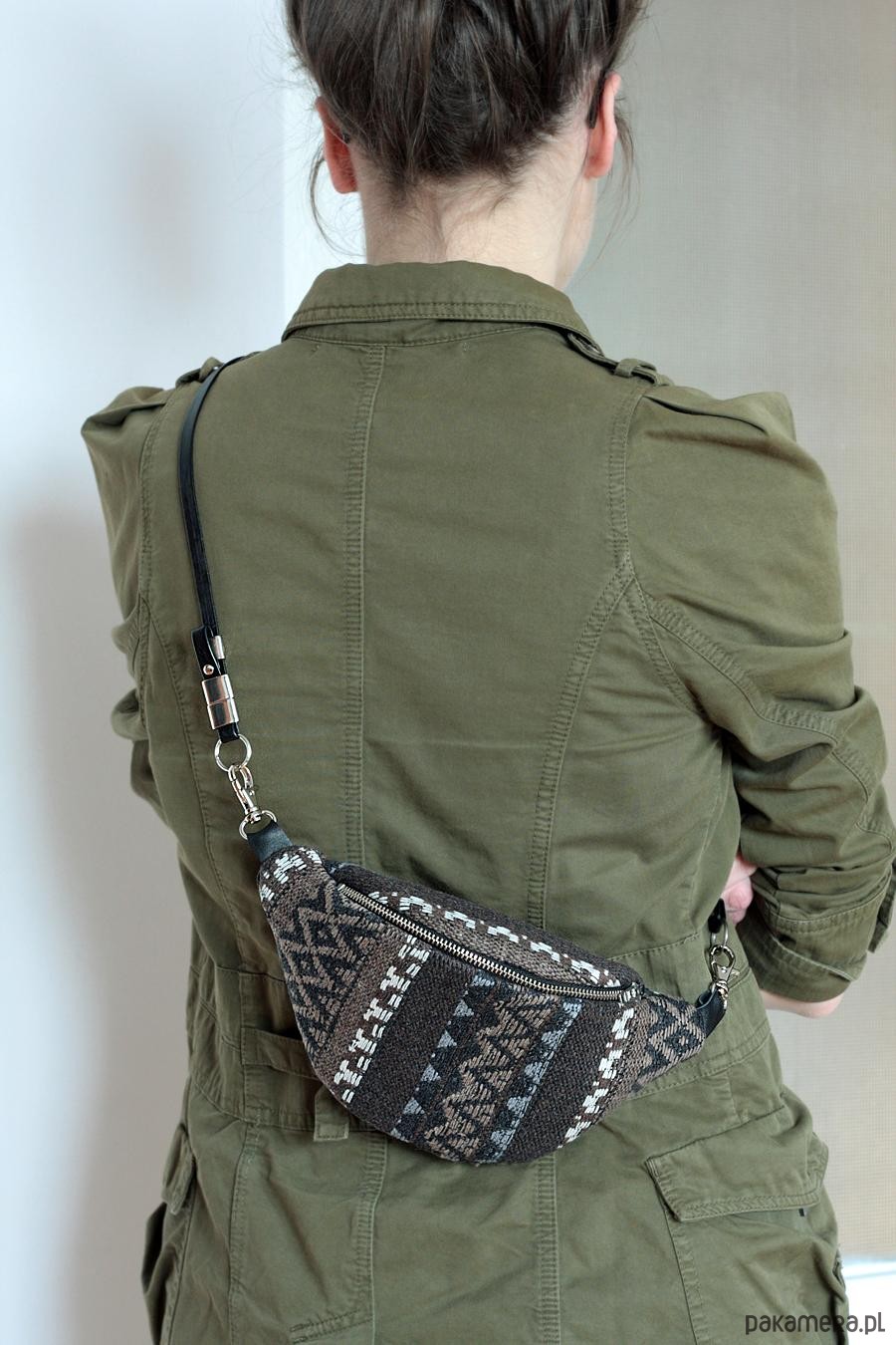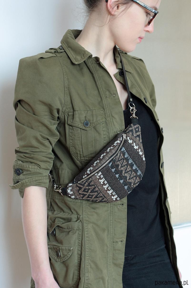 Torebka na pasek, czyli nerka, wykonana z materiału o grubym splocie, tkanego w efektowny etniczny wzór w odcieniach brązów, szarości i czerni. Niewielka, miękka i wygodna.