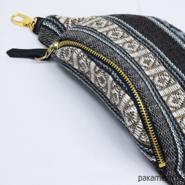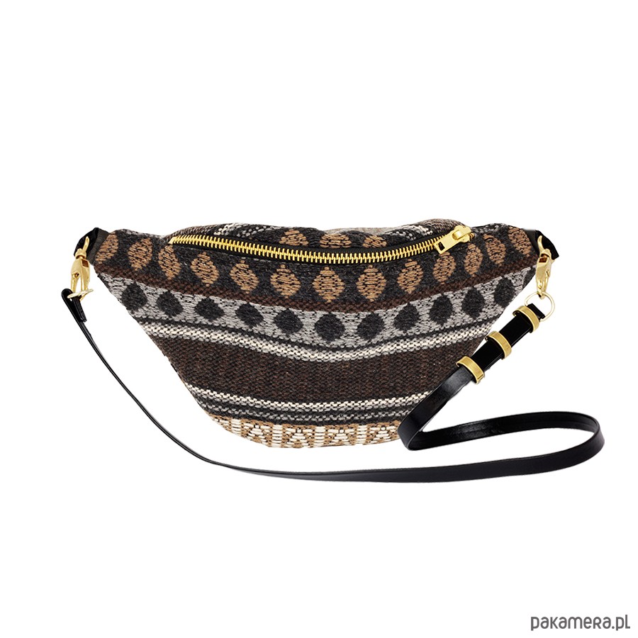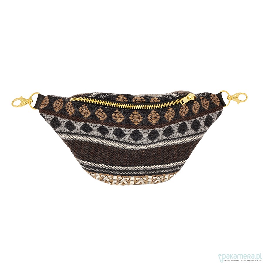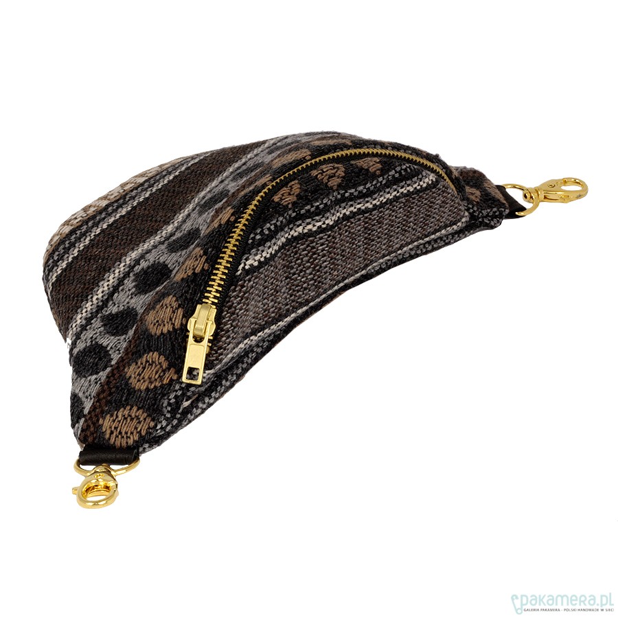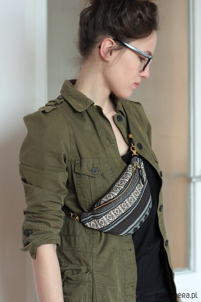 Torebka na pasek, czyli nerka. Ta jest wykonana z materiału o grubym splocie, tkanego w efektowny etniczny wzór w odcieniach szarości, grafitu, czerni oraz brązów i beżów. Niewielka, miękka i wygodna. Nerkę możesz nosić na paseczku, który otrzymujesz w komplecie lub zaczepiać bezpośrednio do szlufek Twoich ulubionych dżinsów za pomocą dołączonych karabińczyków ! Można ją zakładać na każdy inny cienki pasek i nosić w dowolny sposób. Nerkę można zamówić także w wersji z oksydowanymi lub srebrnymi karabińczykami, zamkiem i sprzączkami, a także w wersji męskiej na szerokim parcianym pasku. Uwaga: materiał, z którego jest szyta nerka ma specyficzny deseń, który sprawia, że poszczególne egzemplarze mają odmienny układ wzoru i mogą się różnić od przedstawionych na zdjęciach. Przybliżone wymiary nerki: 25cm x 12cm x 6,5cm; Paseczek w komplecie z nerką jest na obwód od 65 do 108cm.