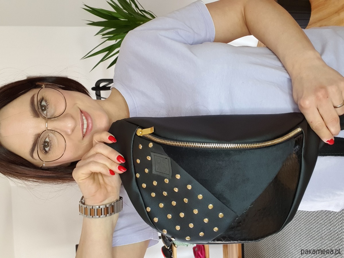 Nerka KING to klasyczna nerka / biodrówka w rozmiarze xl. Wykonana z bardzo dobrej jakości skóry ekologicznej w kolorze czarnym. Przód nerki to patchwork składający się z 3 trójkątów: czarna ekoskóra nabijana złotymi ćwiekami, czarny welur oraz czarna ekoskóra o strukturze skóry krokodyla. Zapinana na metalowy zamek, wszystkie okucia w kolorze złota. Z tyłu kieszonka na suwak. W środku wodoodporna podszewka w kolorze czarnym, kieszonka na tel oraz karabińczyk do kluczy.