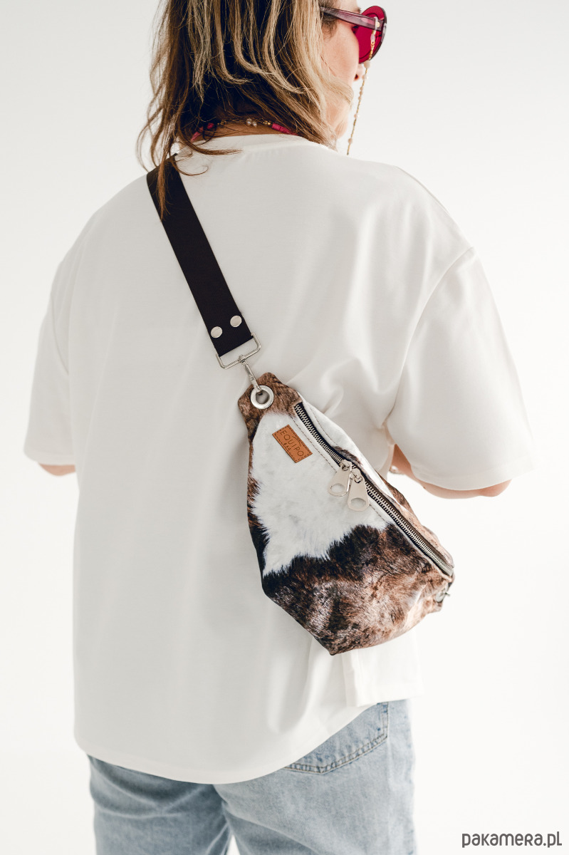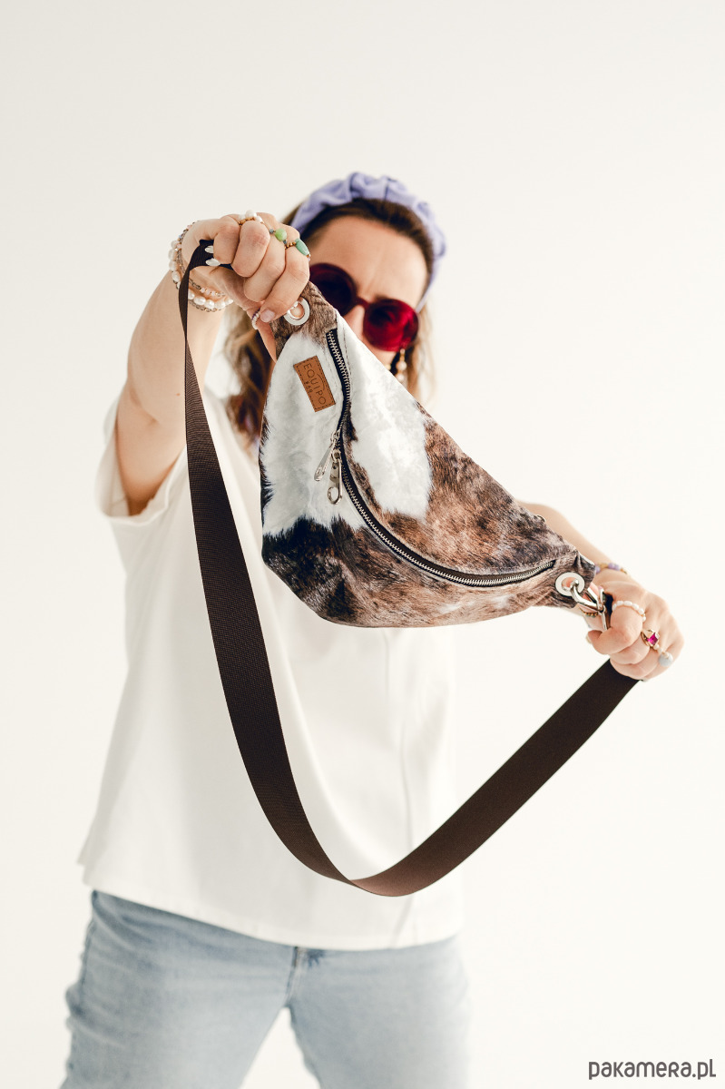 Welur, ortalion wnętrze, pas nośny 2,5cm ekoskóra, srebrny karabińczyk kaletniczy, wodoodporna