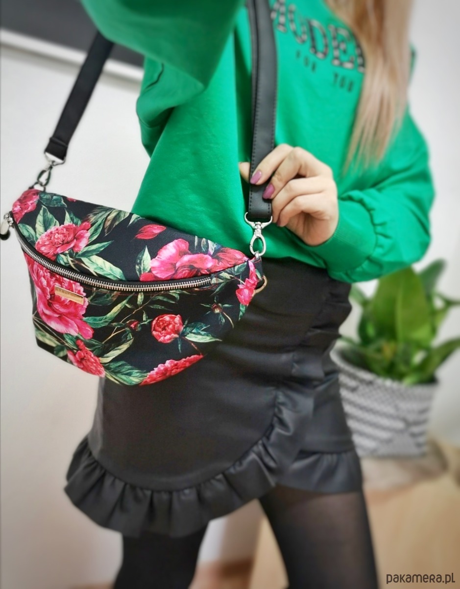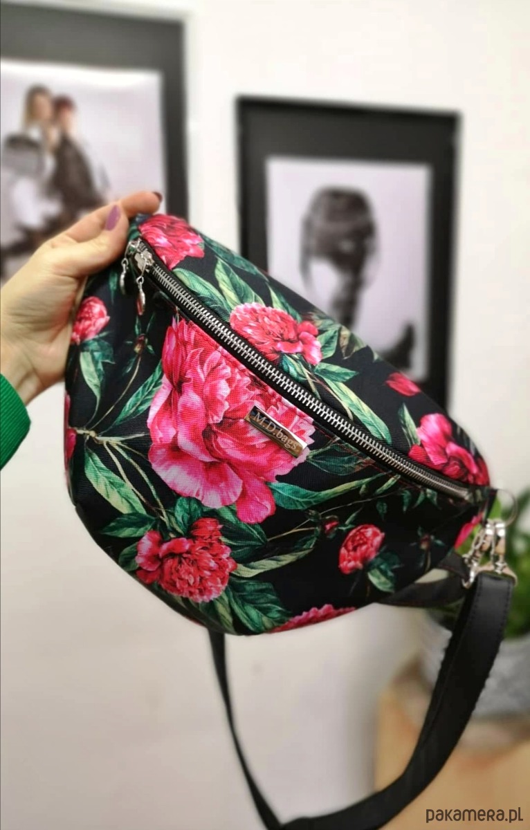Ta nerko torebka została uszyta z pięknie tkaniny wodoodpornej w piwonie oraz eko skóry. Kolory na żywo są obłędne.