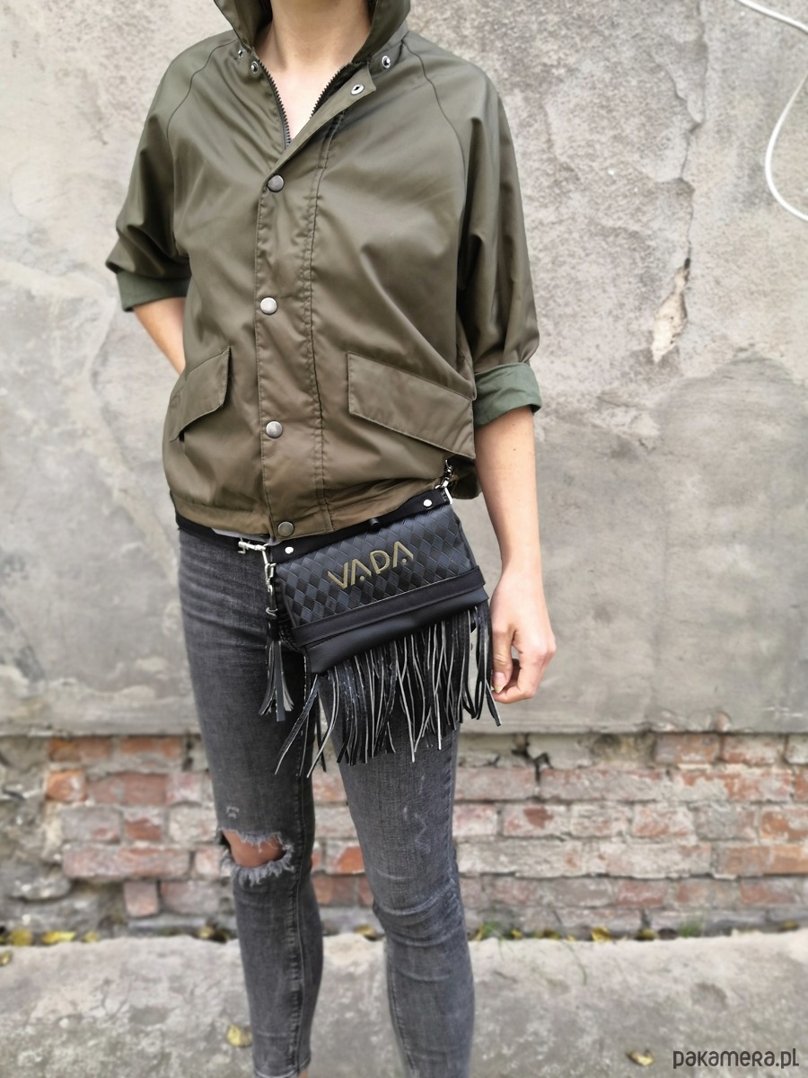 JESTEM SASZETKĄ JUNGLE KARBON / frędzle , którą możesz nosić na wiele sposobów, z paskiem lub bez jako kopertówkę/kosmetyczkę.