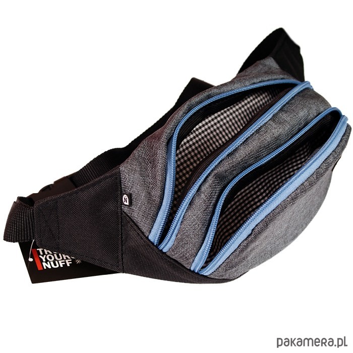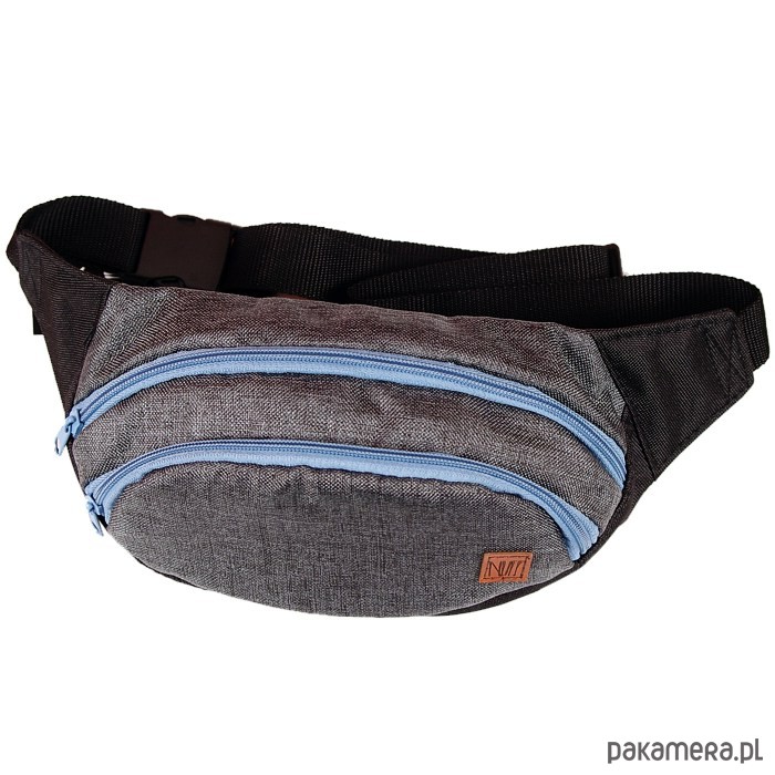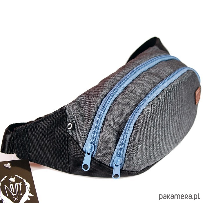 Saszetka Nuff wear, wykonana z lnu poliestrowego i cordury. Wyłożona pianką i podszewką w kratę. Dwie praktyczne komory zapinane na suwaki. Zapięcie na zamki błyskawiczne. Szeroki pasek regulowany, zapinany na solidny zatrzask. W punktach newralgicznych dodatkowe kopertowe przeszycia wzmacniające. Płynna regulacja obwodu w pasie. Z przodu metka typu "skórka" Nuff. Z boku wszywka z logo Nuff Wear. Wymiary: 28 x 12 x 9 cm. Obwód do 125 cm. Kolor: szary + niebieski. Produkt Polski.