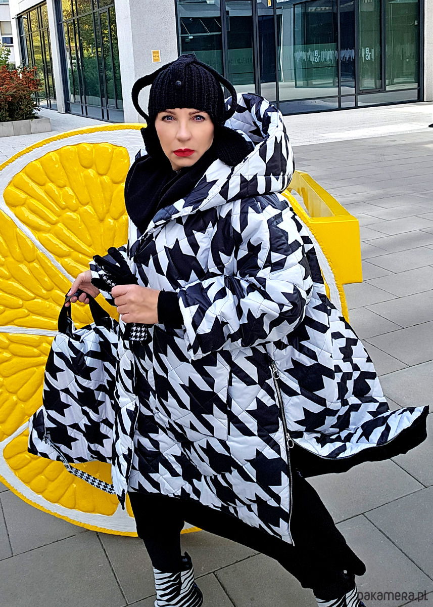 To ponadczasowa forma. Kurtka wykonany jest z ortalionu w duży wzór w pepitkę z czarną wiskozową podszewką