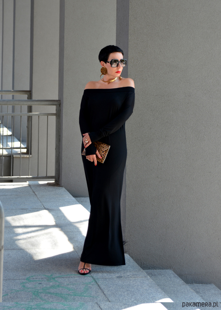 Sukienka o prostym kroju i odkrytych ramionach z długim rękawem zakończonym rękawiczką