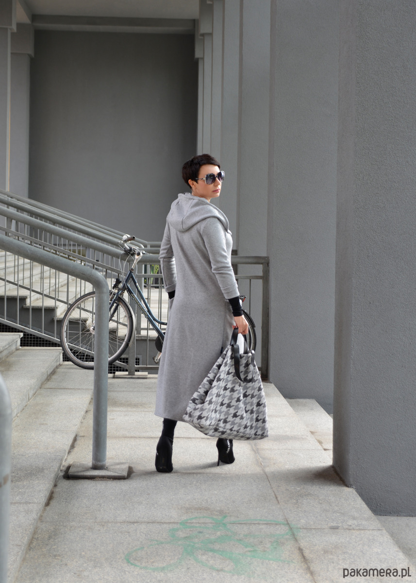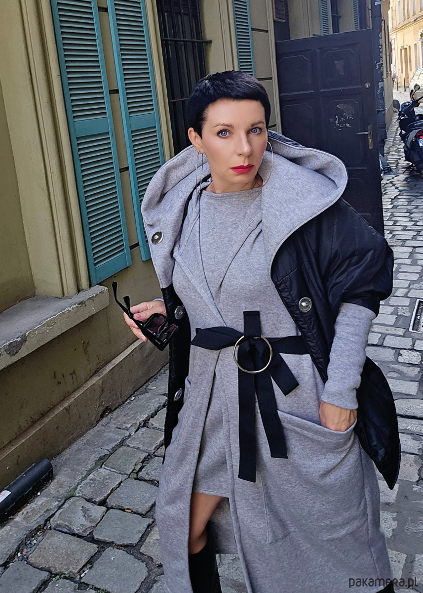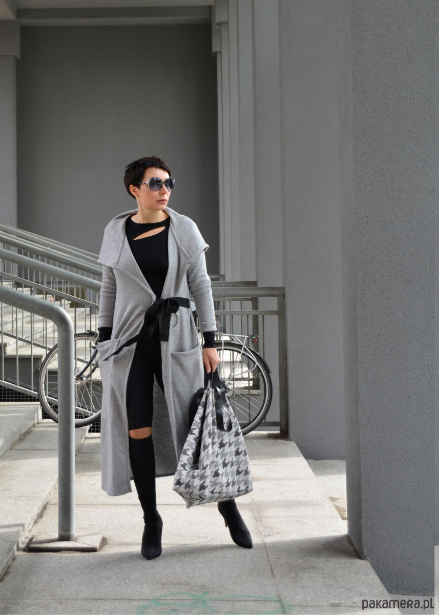 Długi szary kardigan z kapturem wiązany. Kardigan posiada duże kieszenie i ozdobne koło