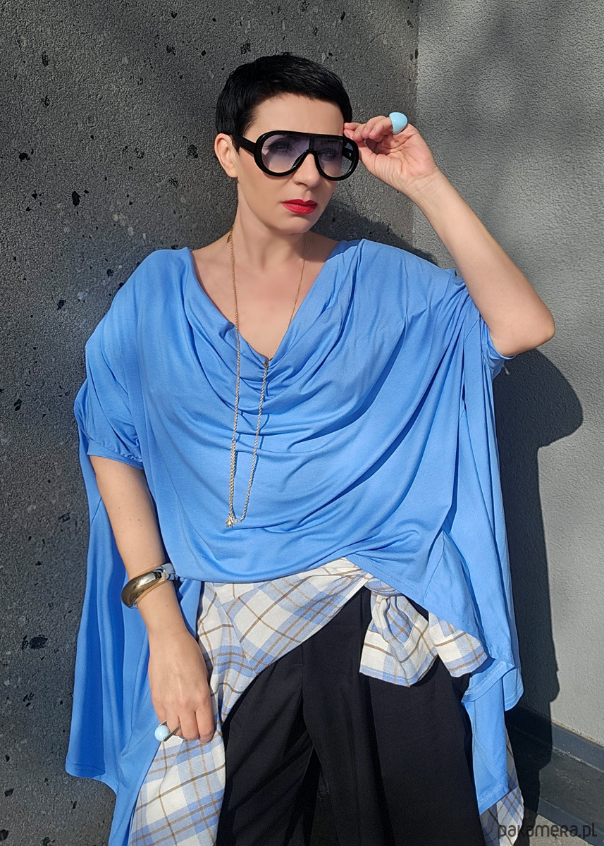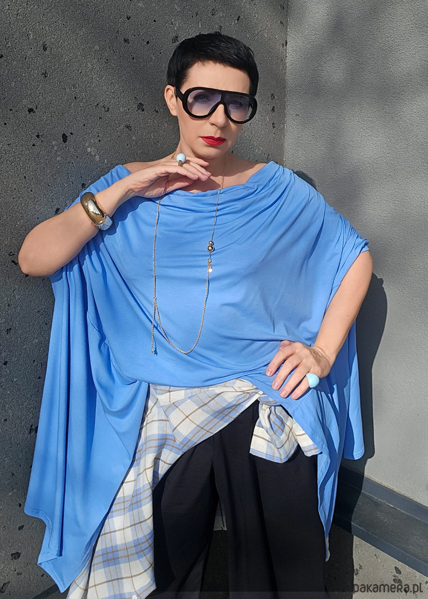 geometryczna bluzka/tunika w modnym kolorze ice blu z dekoltem woda który możesz nosić na 3 sposoby