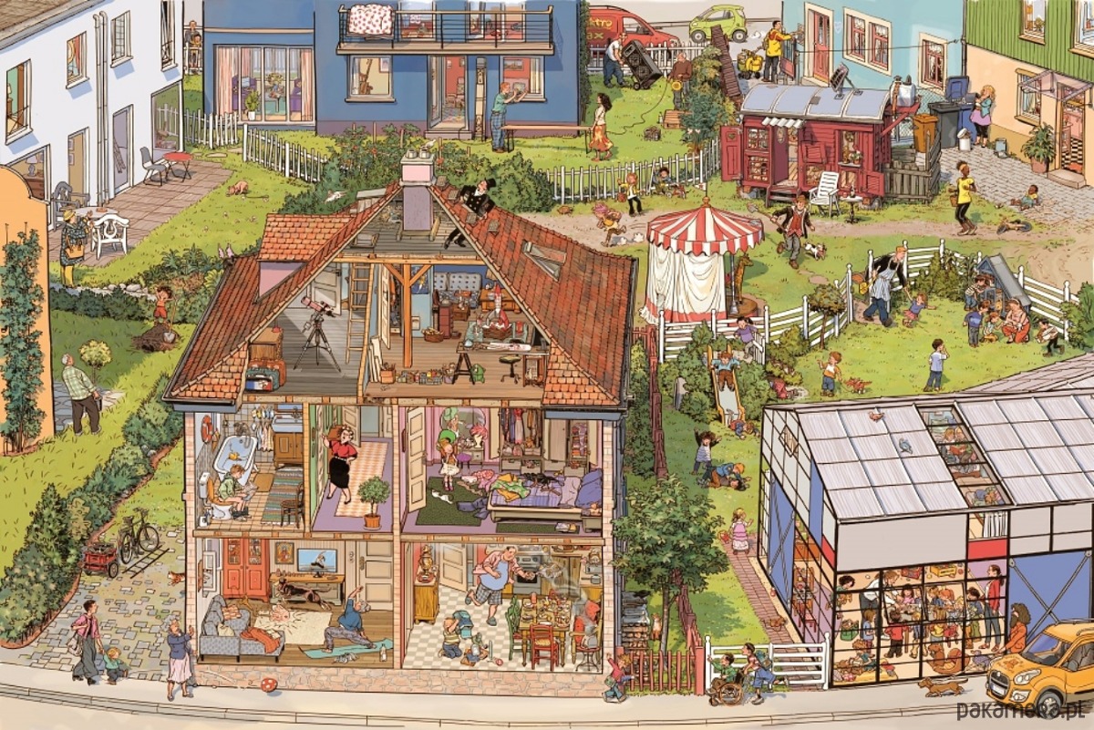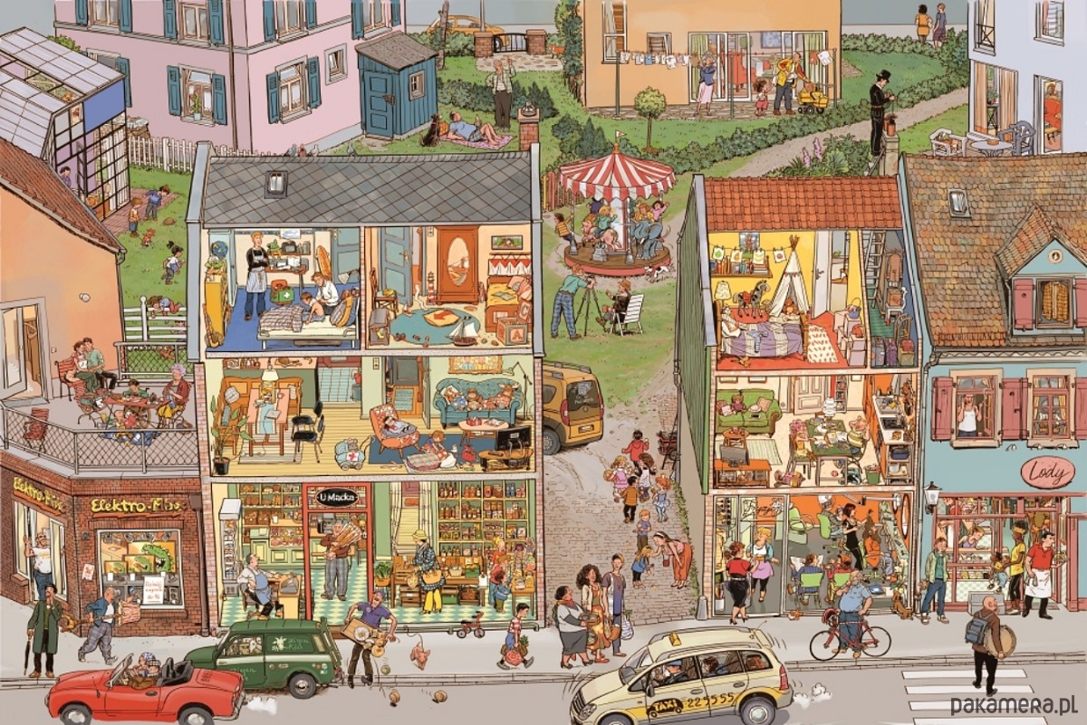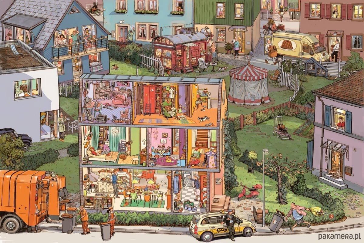 Jak wygląda pokój dziecięcy na poddaszu, a jak rodzinna kuchnia na parterze? Gdzie straszą duchy, a gdzie opala się kominiarz? Dzięki tej książce możecie zajrzeć do wielu mieszkań i podejrzeć życie codzienne ich mieszkańców. Poszukajcie, jak mieszkają Gosia i Olek, Kajetan i Alicja, Asia, Filip i Mruczuś :-)