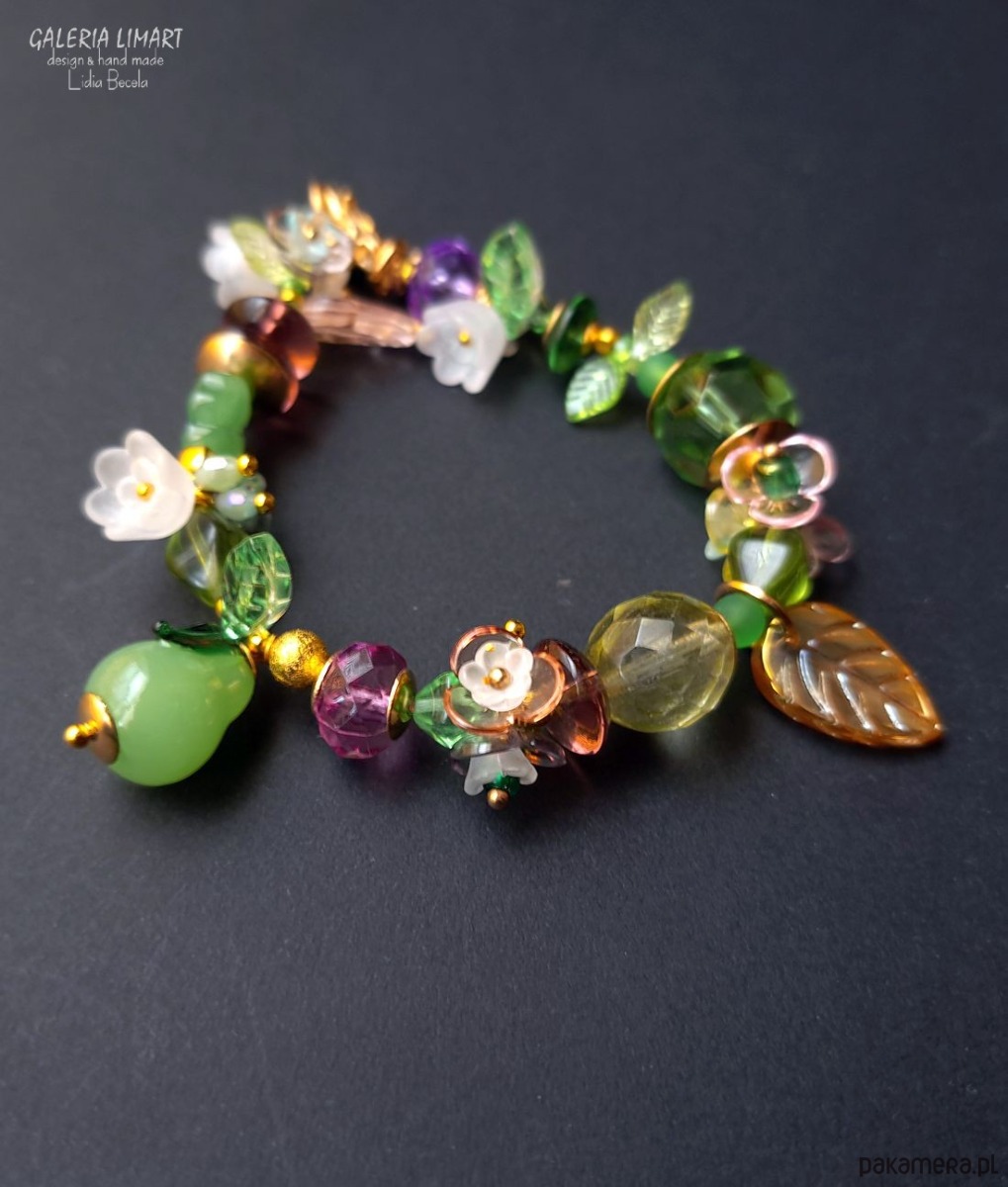 Uwielbiam tworzyć piękne komplety z mixu przeróżnych, ale bardzo starannie dobranych kolorystycznie i wielkościowo elementów ozdobnych w tym przypadku takich jak: piękne szkło, kryształy, mosiądz, akryl idealnie skomponowanych kolorystycznie. Bransoletka jest w sam raz na obwód nadgarstka 15-17 cm.