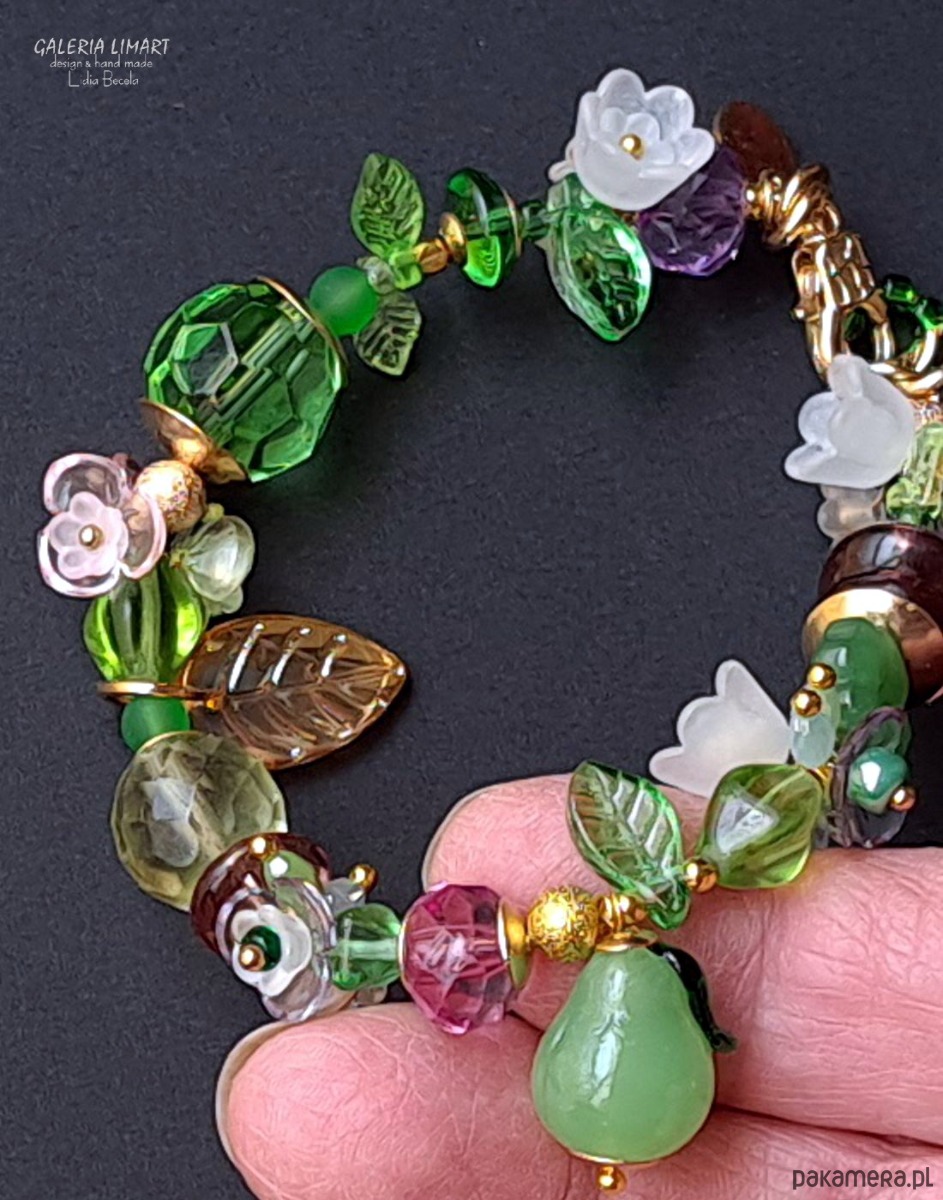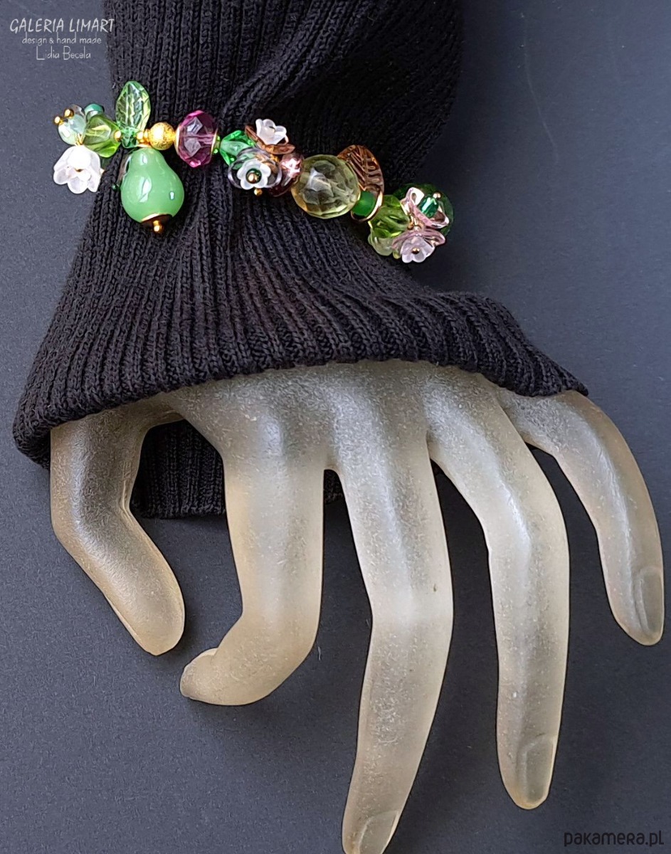 Uwielbiam tworzyć piękne eklektyvczne komplety z mixu przeróżnych, ale bardzo starannie dobranych kolorystycznie i wielkościowo elementów ozdobnych w tym przypadku takich jak: piękne szkło, kryształy, mosiądz, akryl idealnie skomponowanych kolorystycznie. Bransoletka jest w sam raz na obwód nadgarstka 15-17 cm.