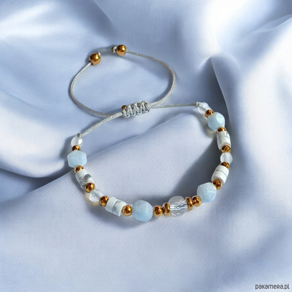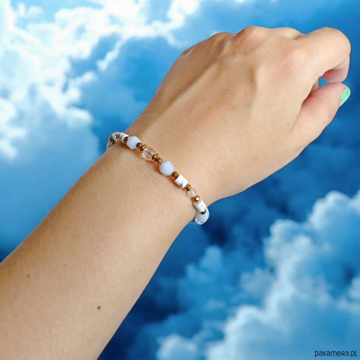 NIEBIAŃSKA bransoletka: kryształ górski, akwamaryn, howlit, agat, hematyt