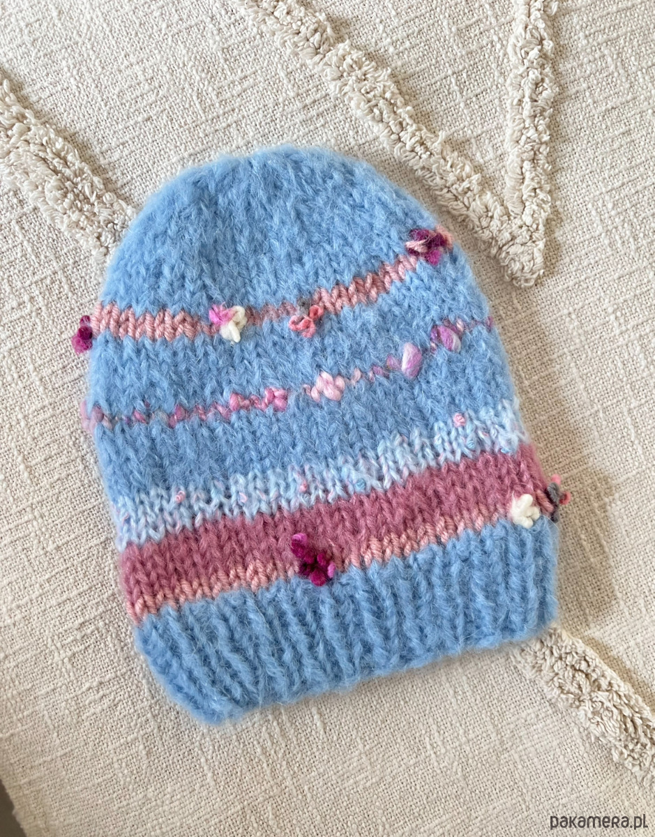 Czapka z delikatnej, miękkiej włóczki. baza to 74% alpaka 25% merino 4% poliamid. W ozdobnych paskach merino, alpaka, akryl.