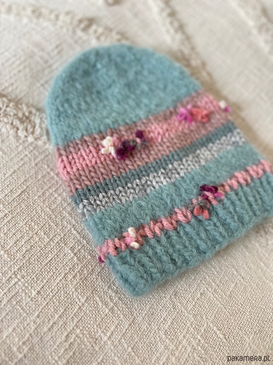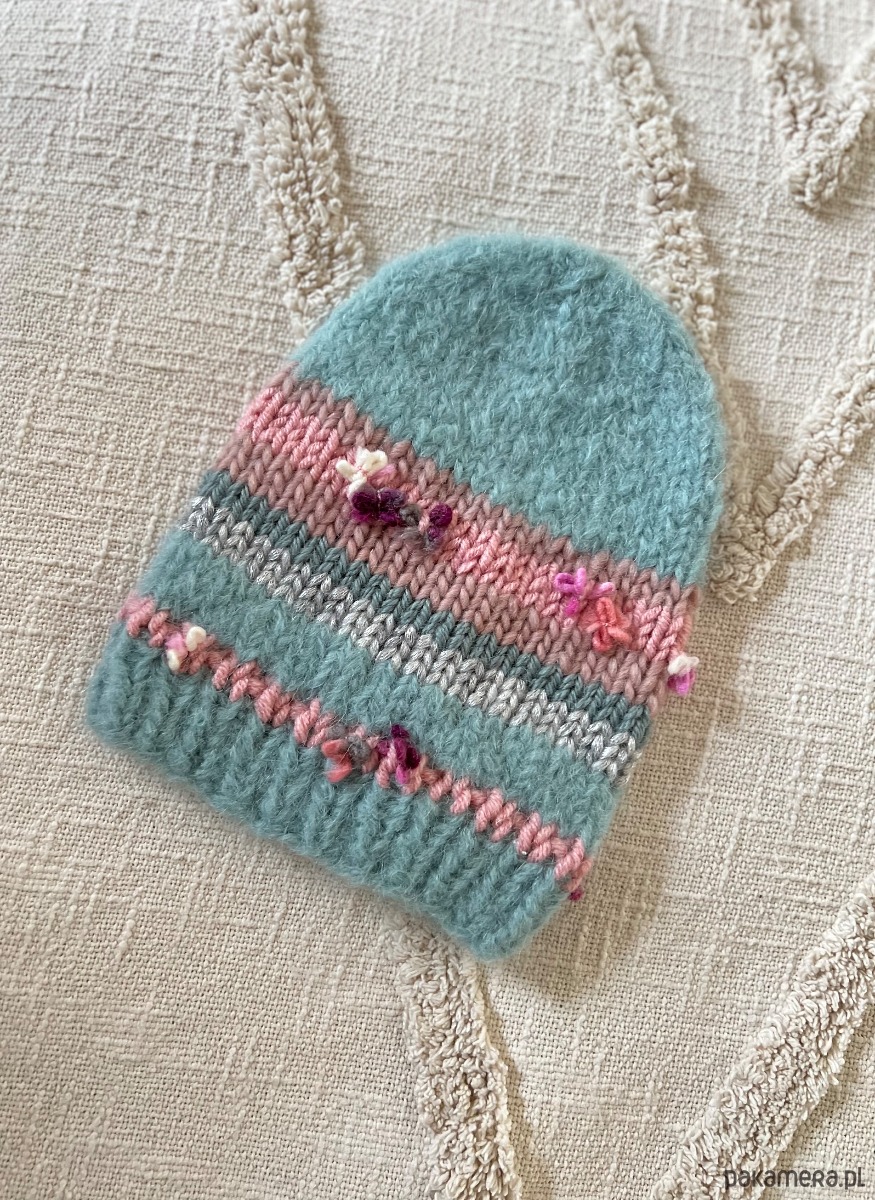 Czapka z delikatnej, miękkiej włóczki. baza to 74% alpaka 25% merino 4% poliamid. W ozdobnych paskach merino, alpaka, akryl.