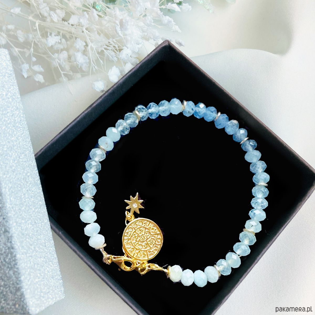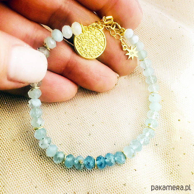 Piękna bransoletka z kamieni Akwamarynów ,w pięknych odcieniach błękitu. Wykonana ręcznie z kamieni , zawieszki ze stylizowaną monetą oraz małej gwiazdki z cyrkonią. Idealna do jeansów jak i eleganckiej stylizacji.