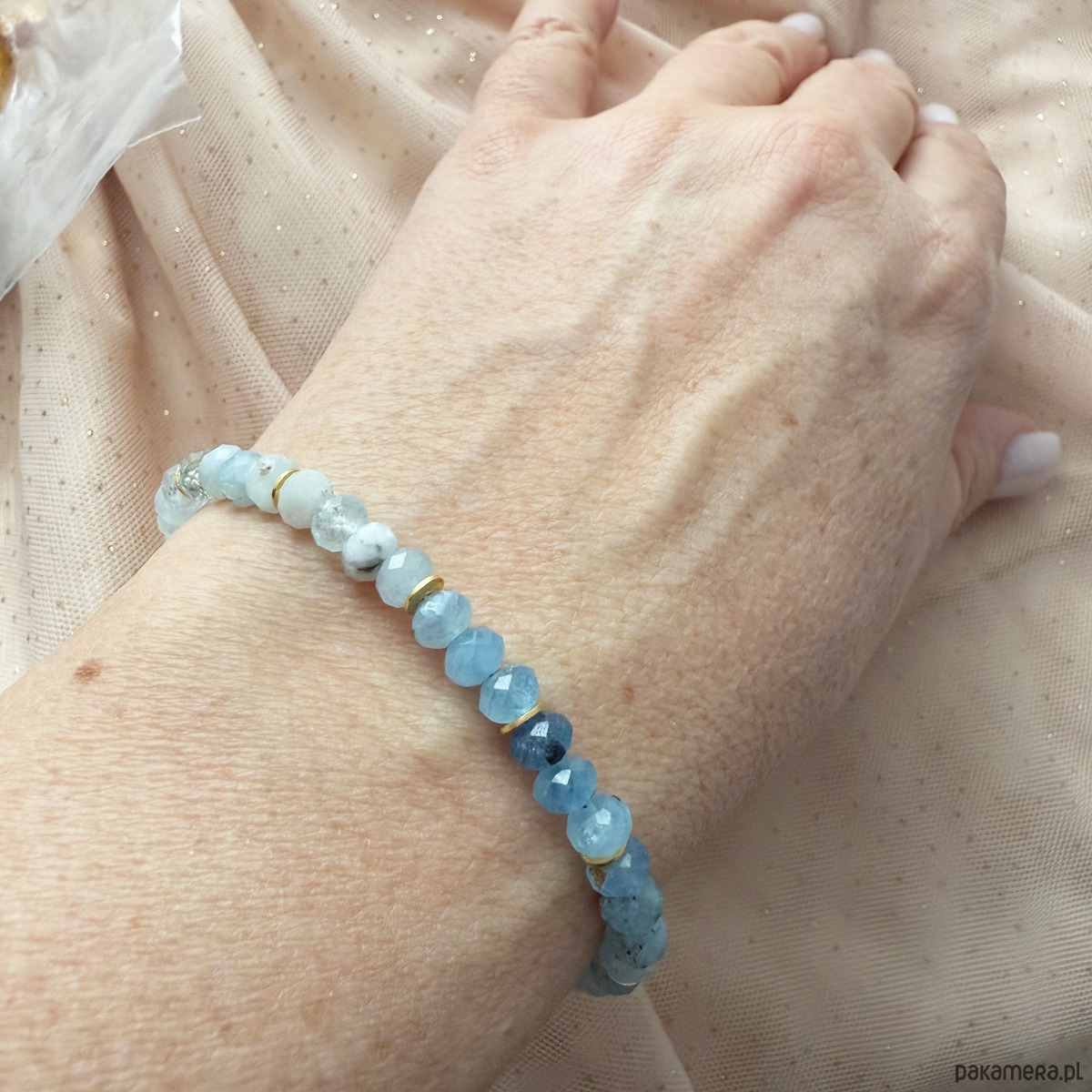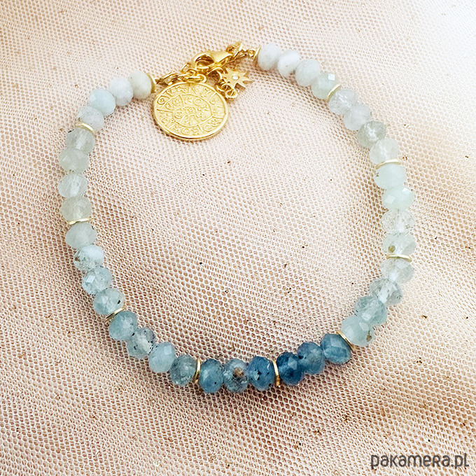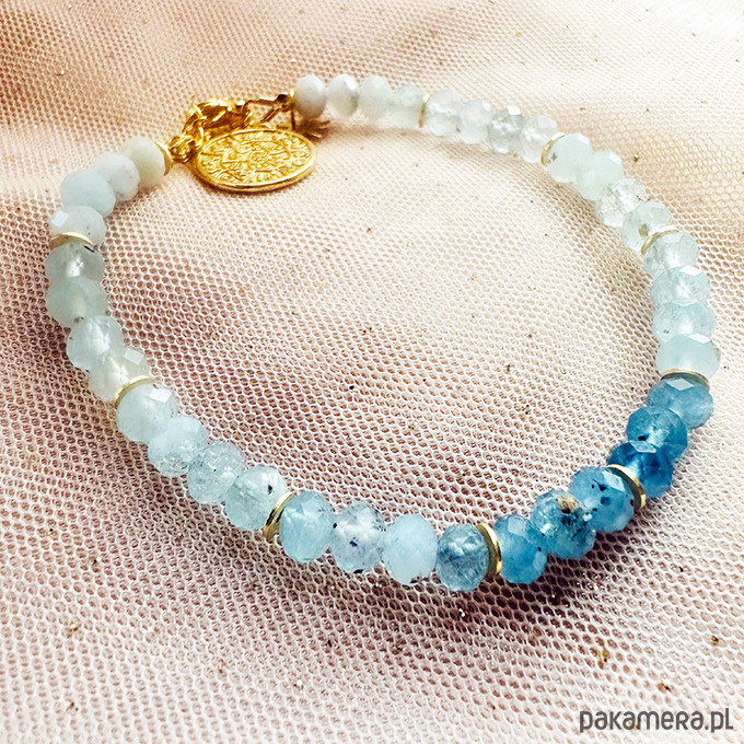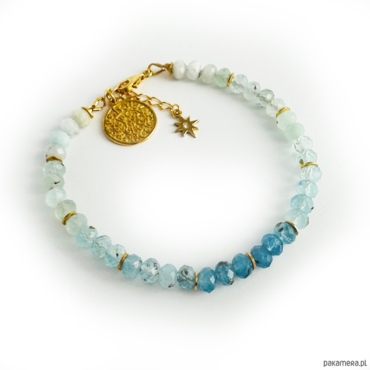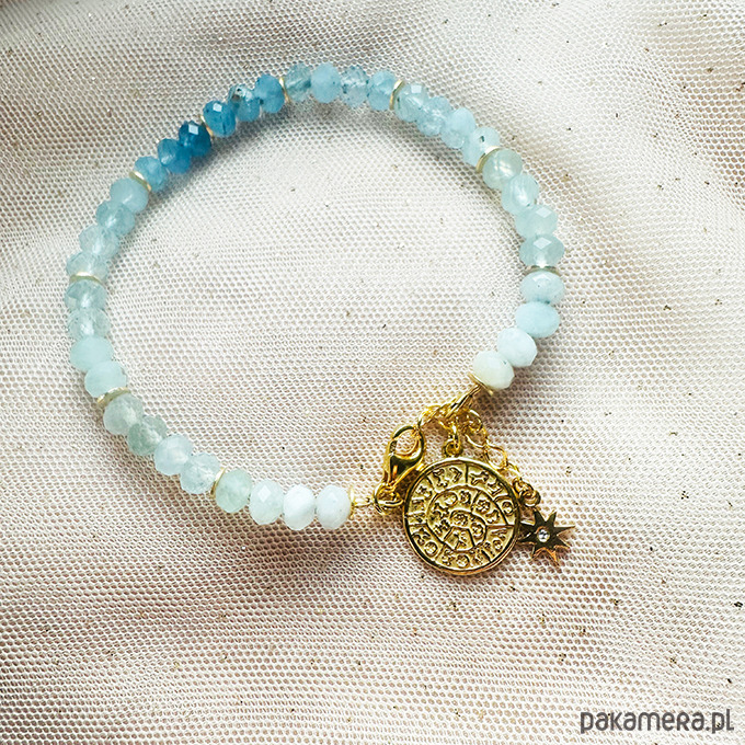 Piękna bransoletka z kamieni Akwamarynów ,w pięknych odcieniach błękitu. Wykonana ręcznie z kamieni , zawieszki ze stylizowaną monetą oraz małej gwiazdki z cyrkonią. Idealna do jeansów jak i eleganckiej stylizacji.
