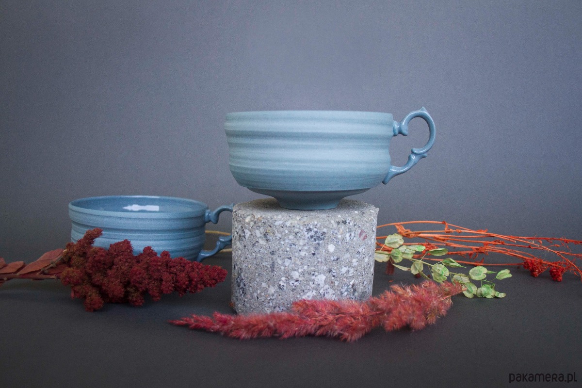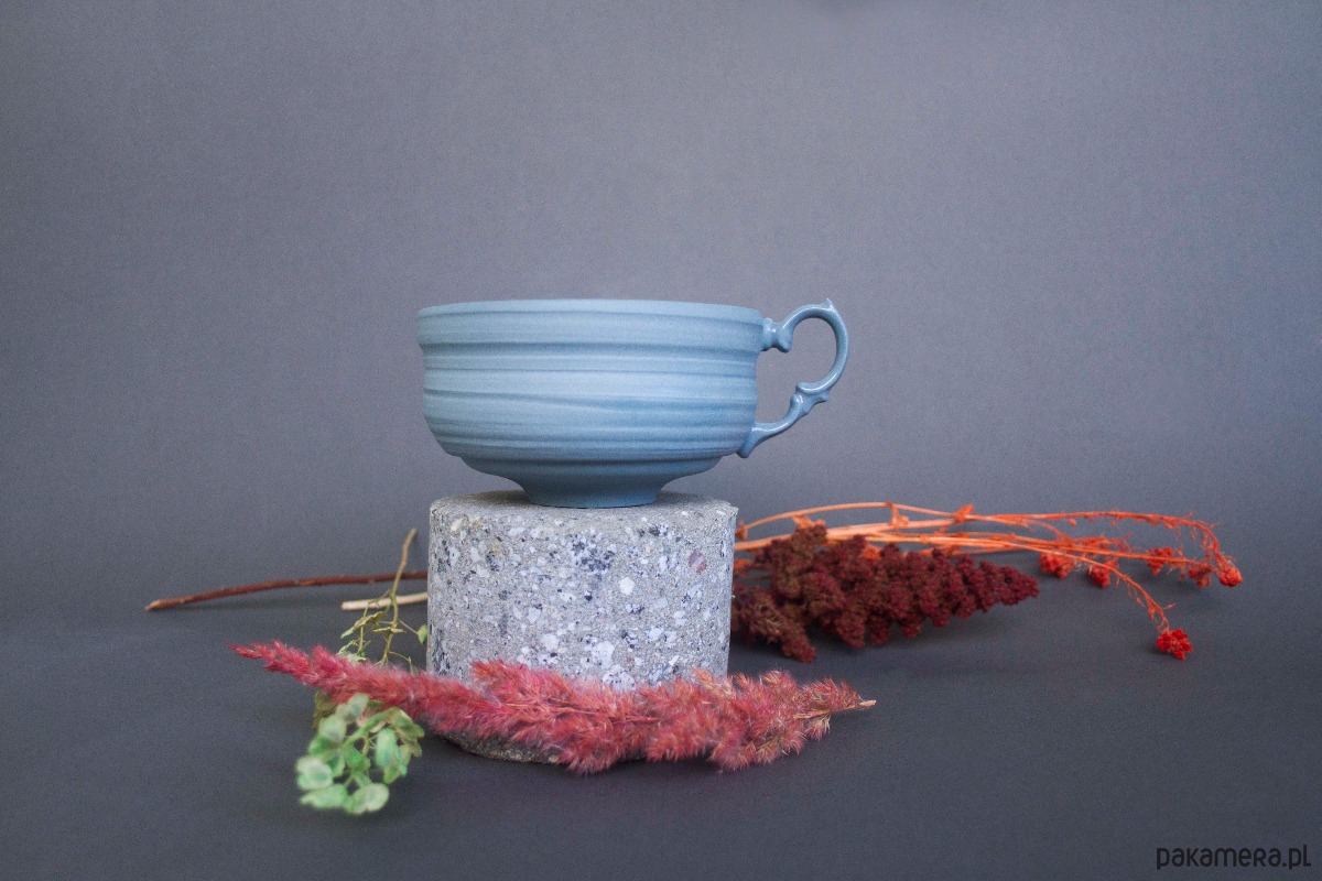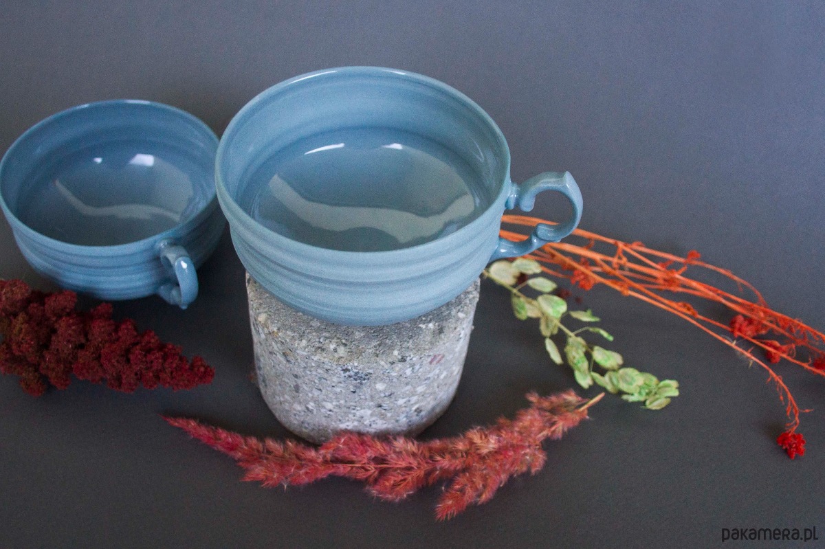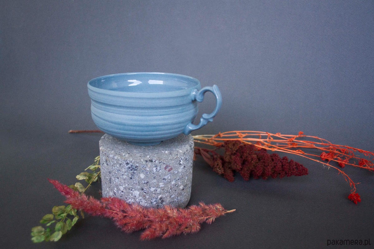 Ręcznie robiona filiżanka z kojąco niebieskiej kamionki.