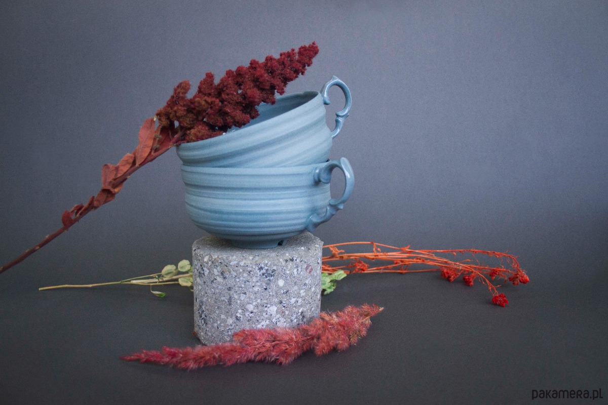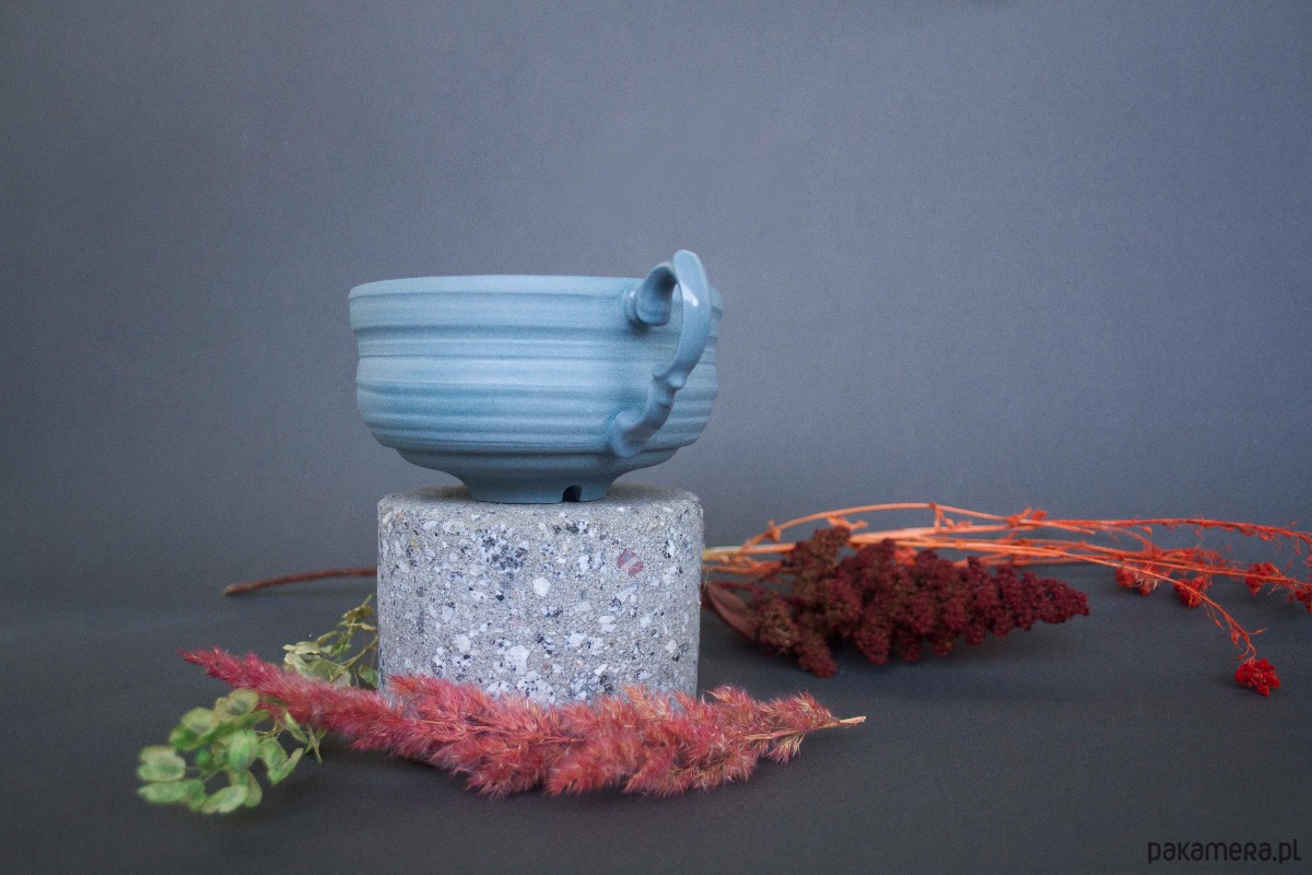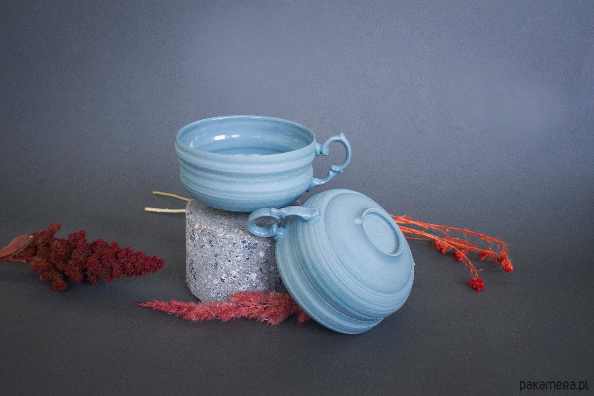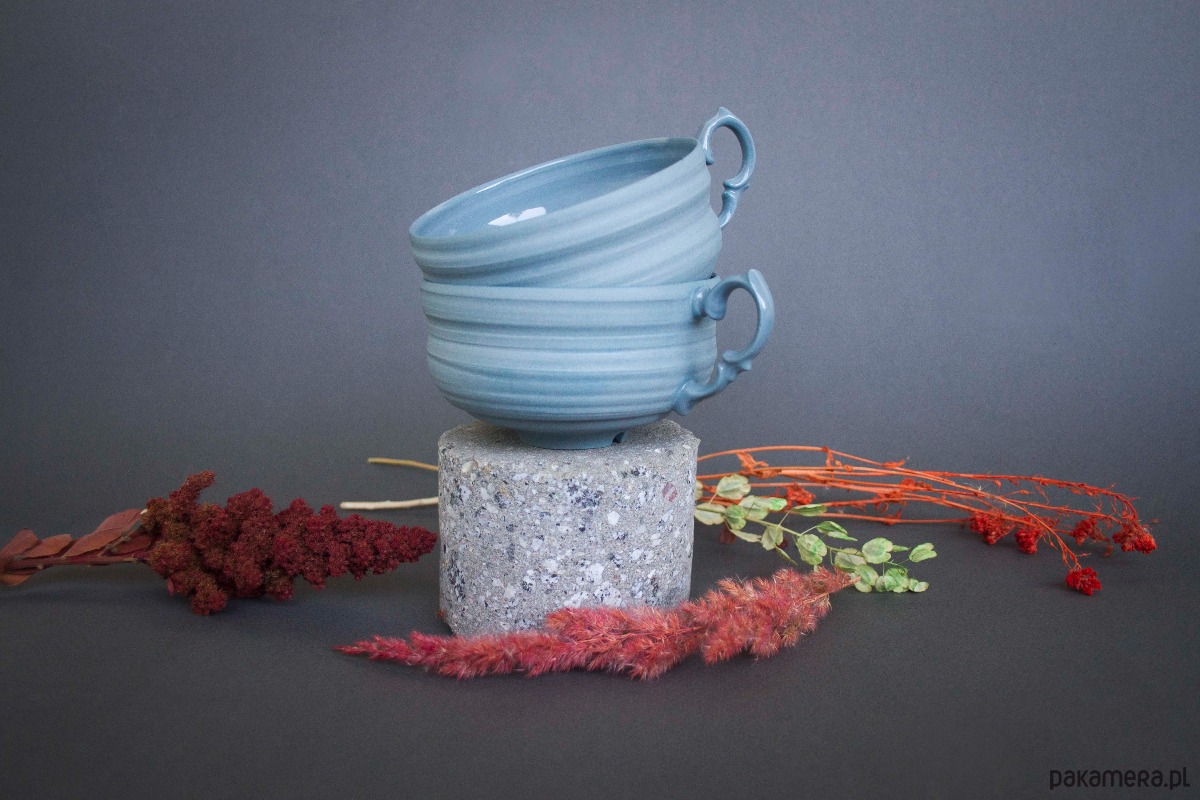 Ręcznie robiona filiżanka z kojąco niebieskiej kamionki.