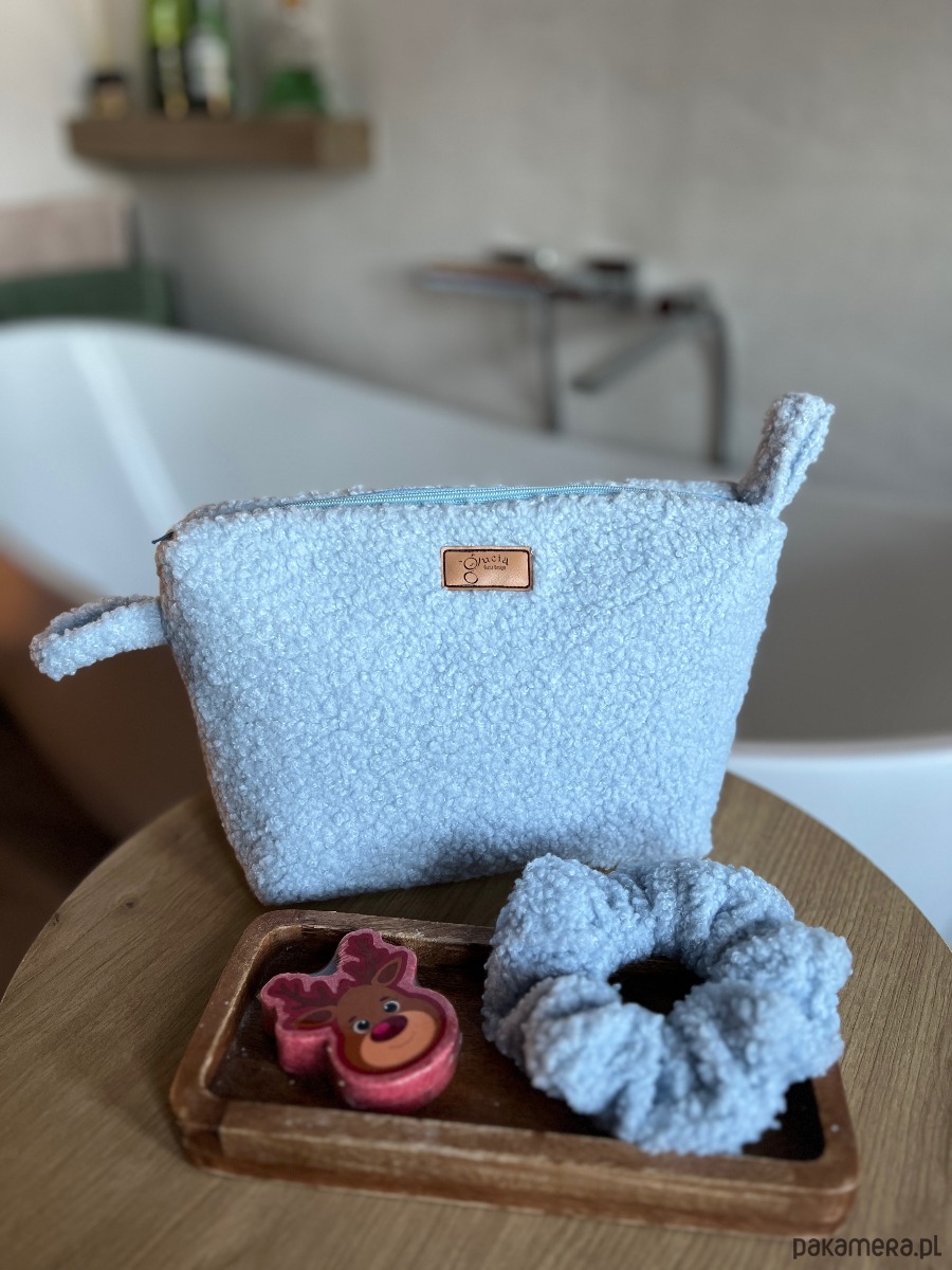 Miękka kosmetyczka uszyta z jasnoniebieskiego materiału typu baranek, stworzona z myślą o codziennym użytkowaniu i zimowym, przytulnym klimacie. W komplecie znajduje się dopasowana gumka do włosów (scrunchie), dzięki czemu zestaw tworzy spójną i estetyczną całość.