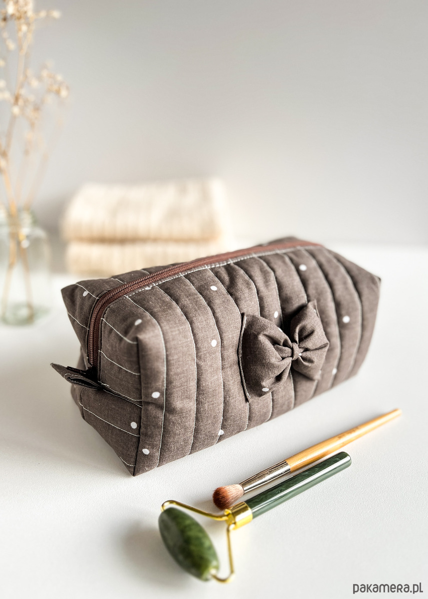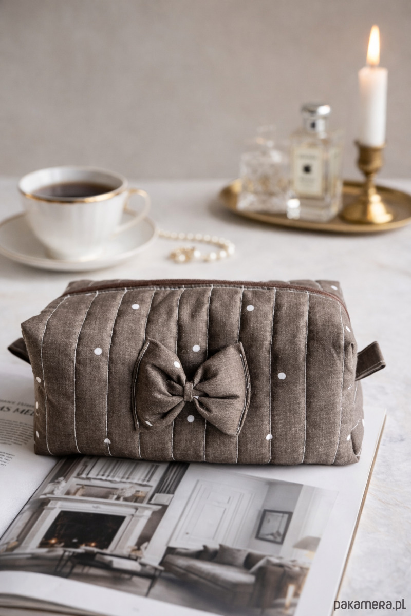 Stylowa i kobieca kosmetyczka, która łączy funkcjonalność z eleganckim wyglądem. Uszyta z tkaniny w subtelny wzór, ozdobiona dekoracyjną kokardą, pięknie prezentuje się zarówno w torebce, jak i na toaletce.
