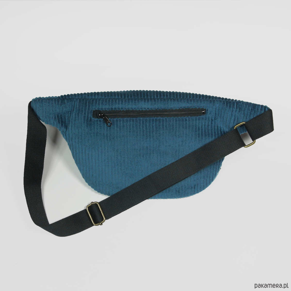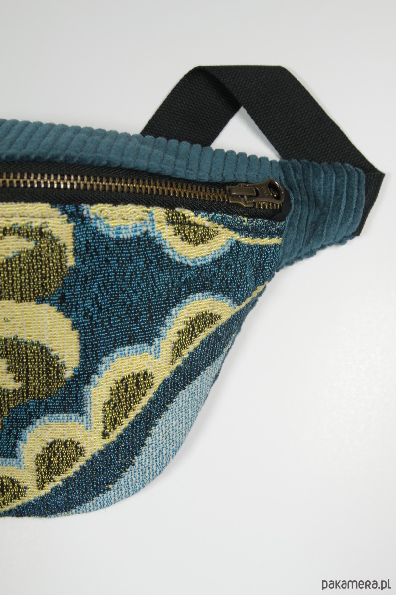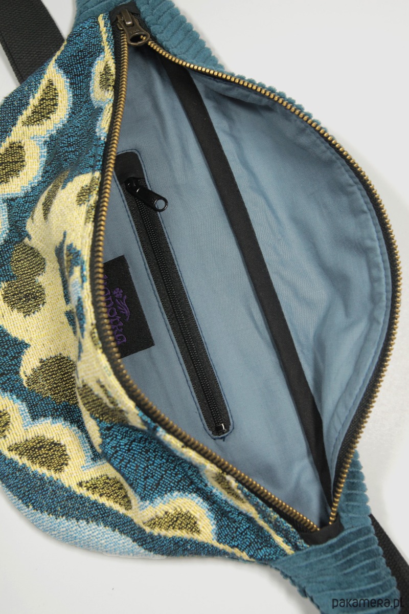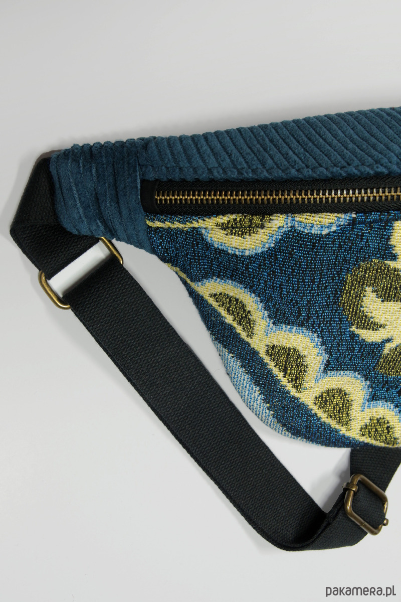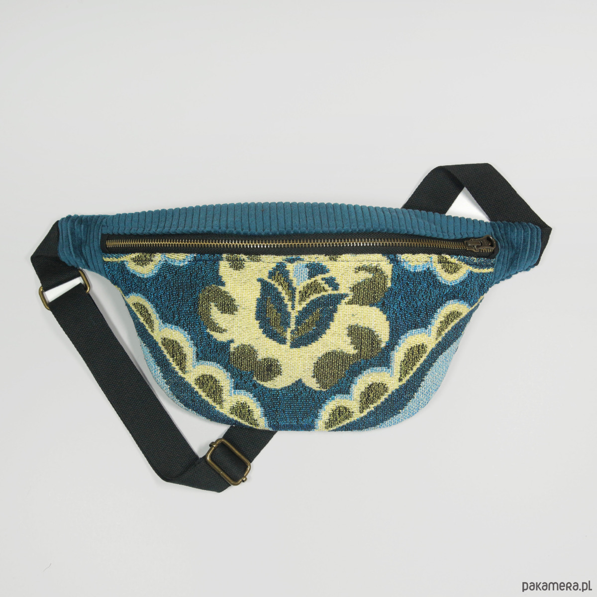 "Wygodna i pakowna nerka z regulowanym paskiem. Można nosić zarówno na ramieniu, jak i na biodrach Przód uszyty jest z pięknej żakardowej tkaniny z okresu PRL-u, z kwiatowym wzorem. Tył z bawełnianego sztruksu w niebieskim kolorze. Zapinana na porządny metalowy zamek firmy YKK. W środku oraz na tyle są dodatkowe kieszonki zapinane też na suwak. Pasek miękki i wytrzymały, z parcianej taśmy bawełnianej. W środku wykończone bawełnianą podszewką w kolorze błękitnym. Nerka jest miękka, dlatego dobrze dopasowuje się do ciała. Elementy kaletnicze pochodzą od polskiego producenta, są metalowe i wysokiej jakości.