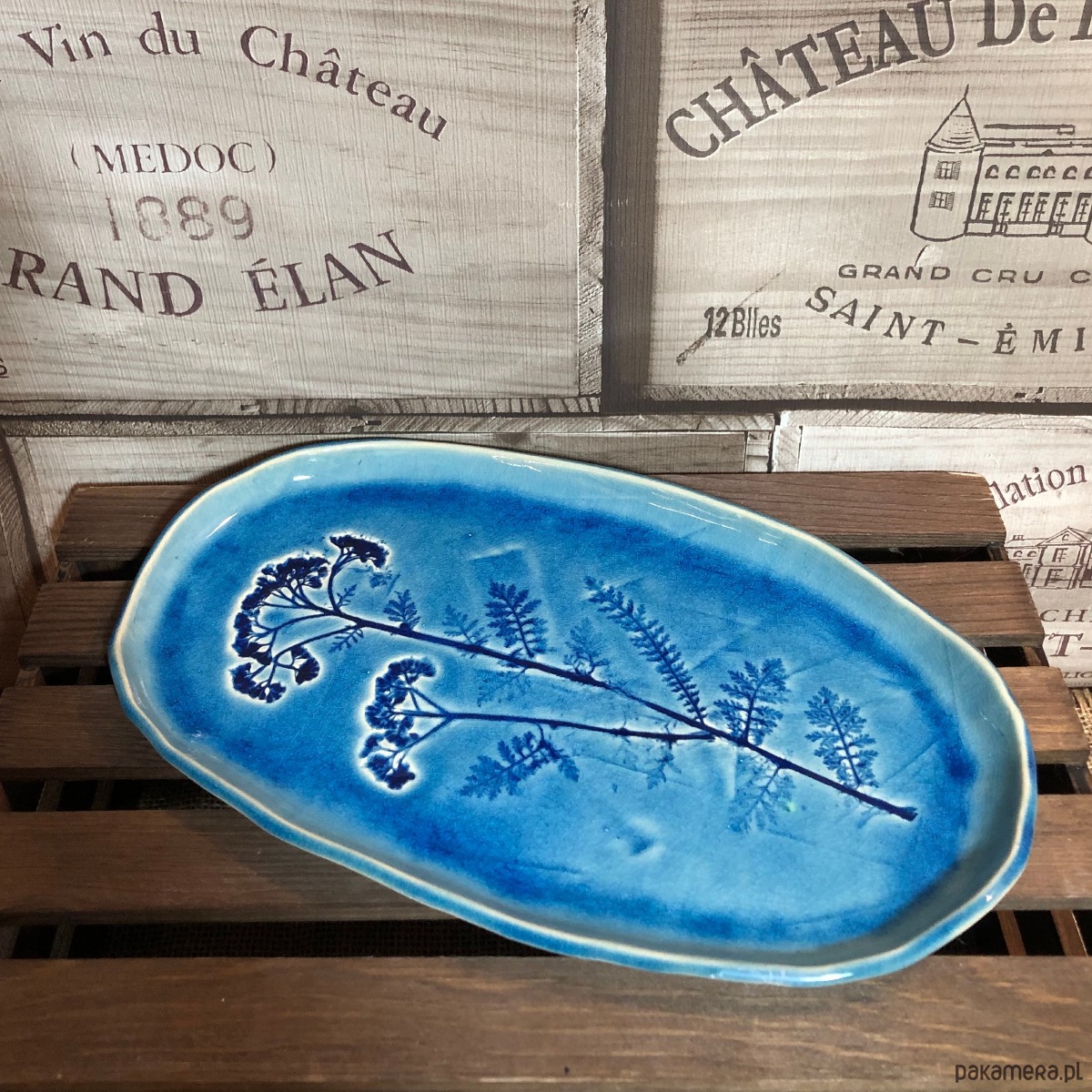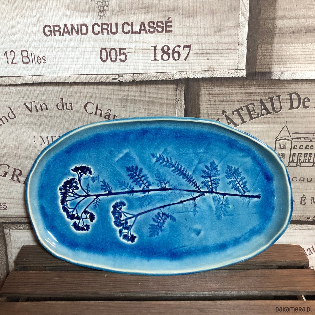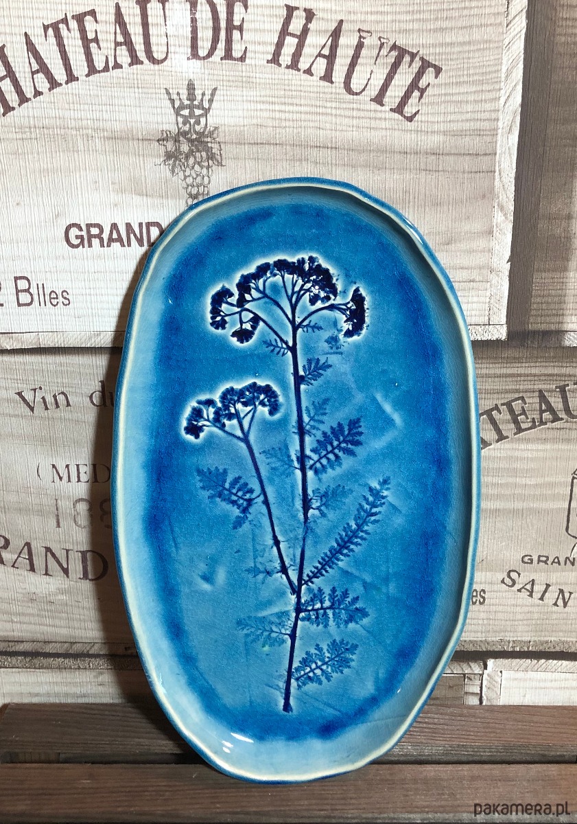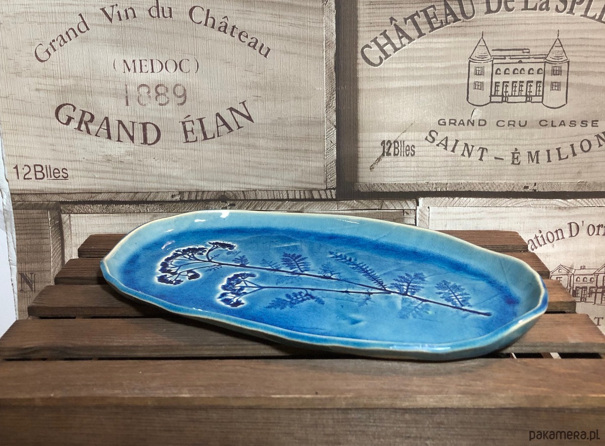 Patera w kolorze głębokiego turkusu z odbitym naturalnym polnym kwiatem.