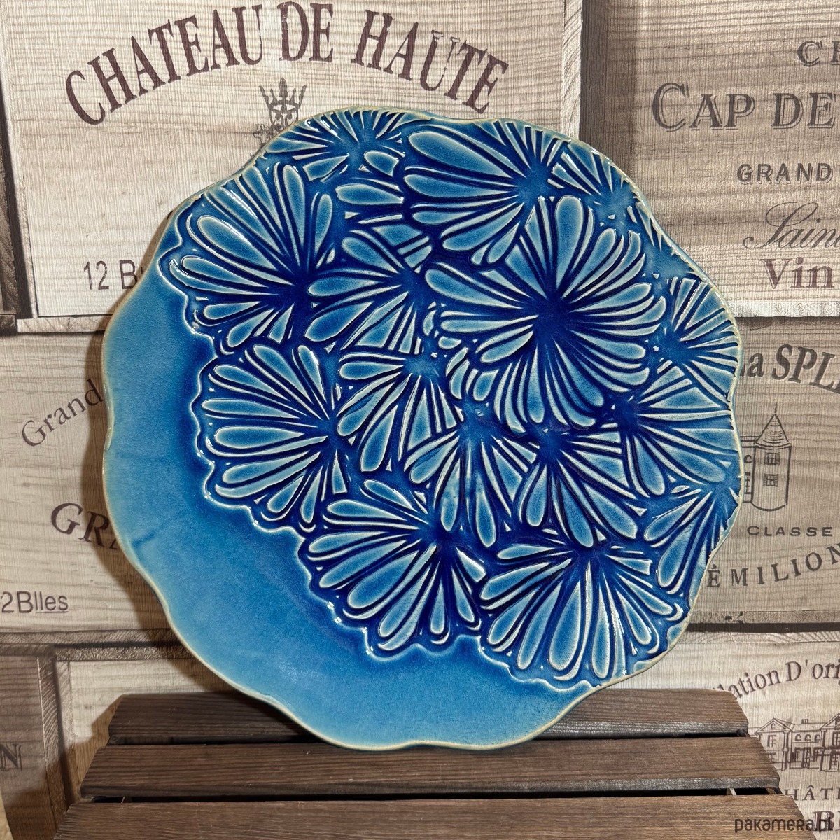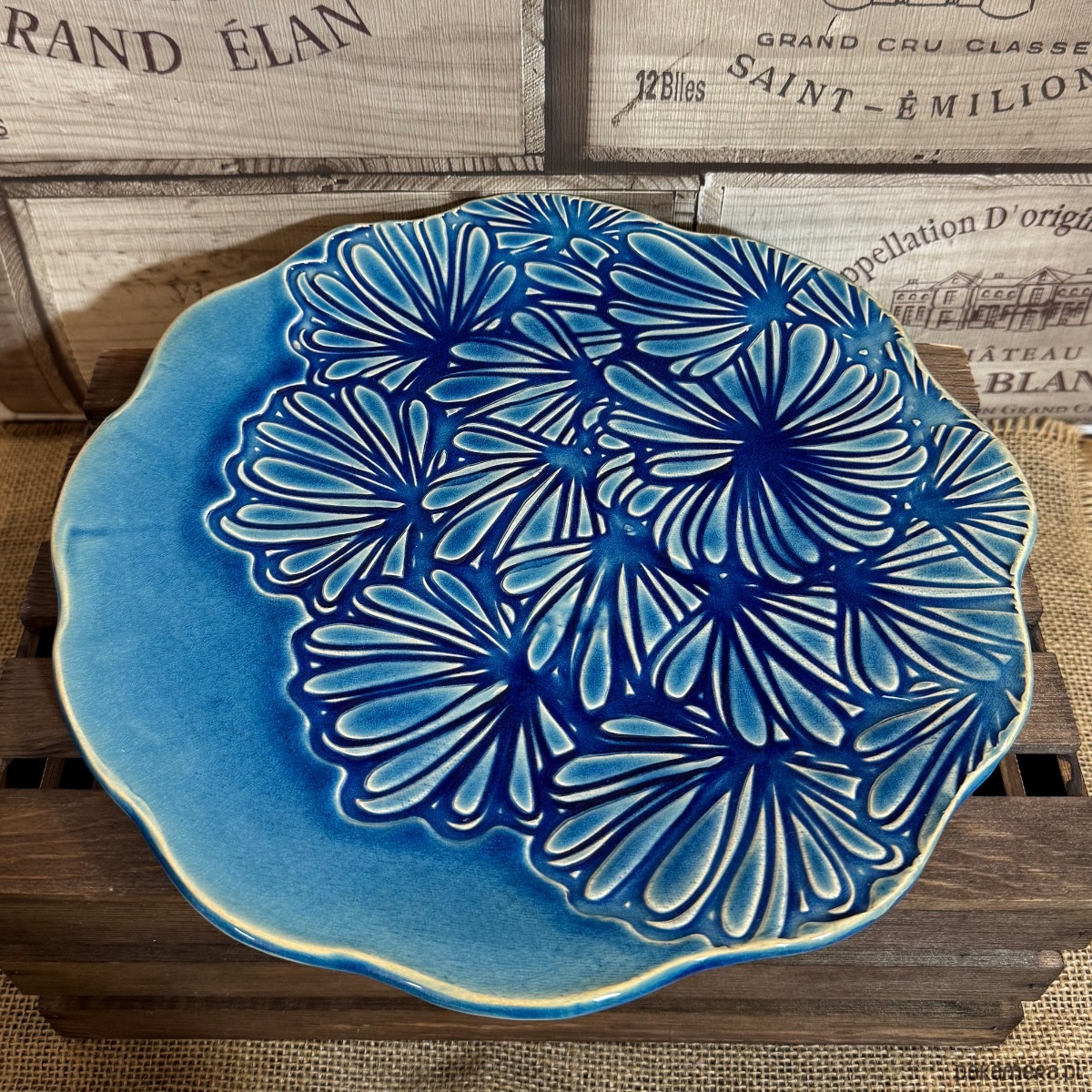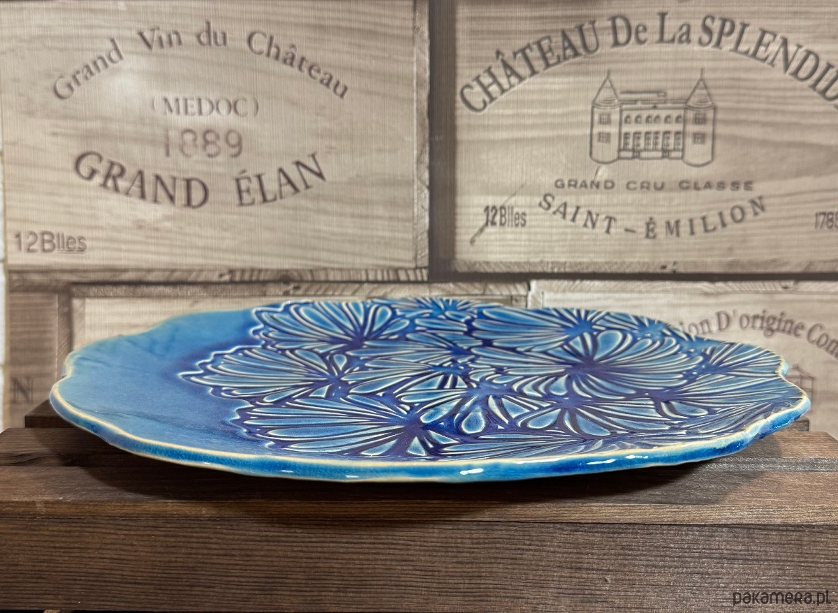 Patera/talerz w kolorze głębokiego turkusu z odbitym motywem kwiatowym.