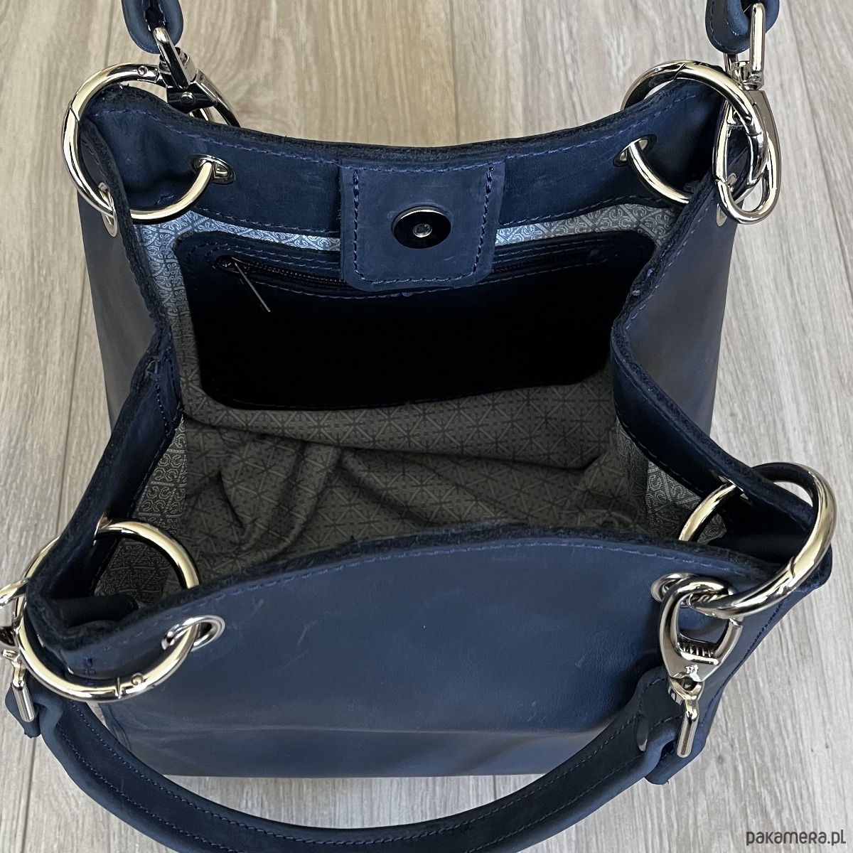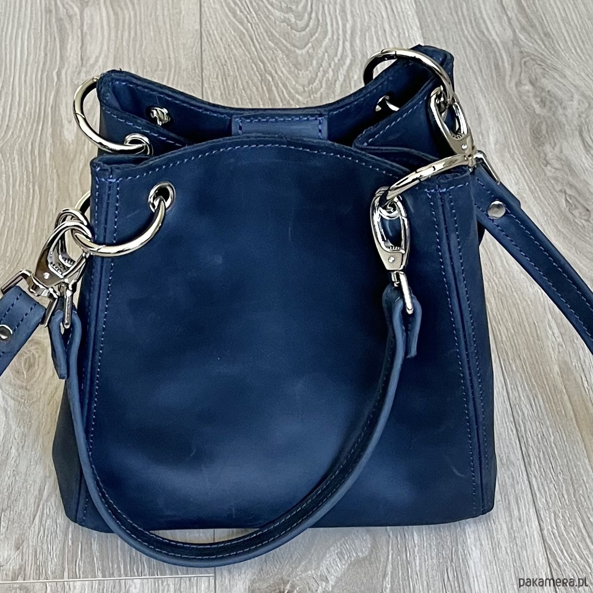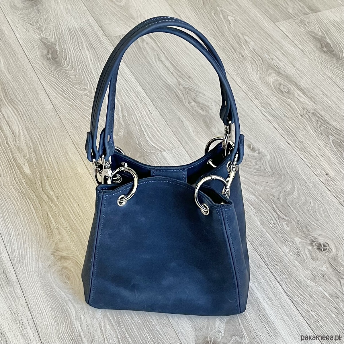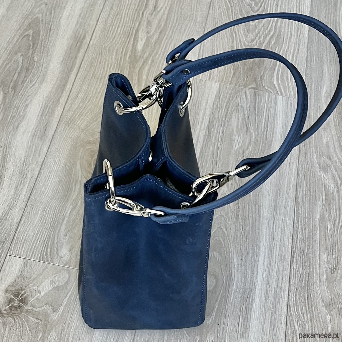 Niebieska torebka damska wyposażona w dwie odpinane skórzane rączki oraz długi regulowany odpinany skórzany pasek.