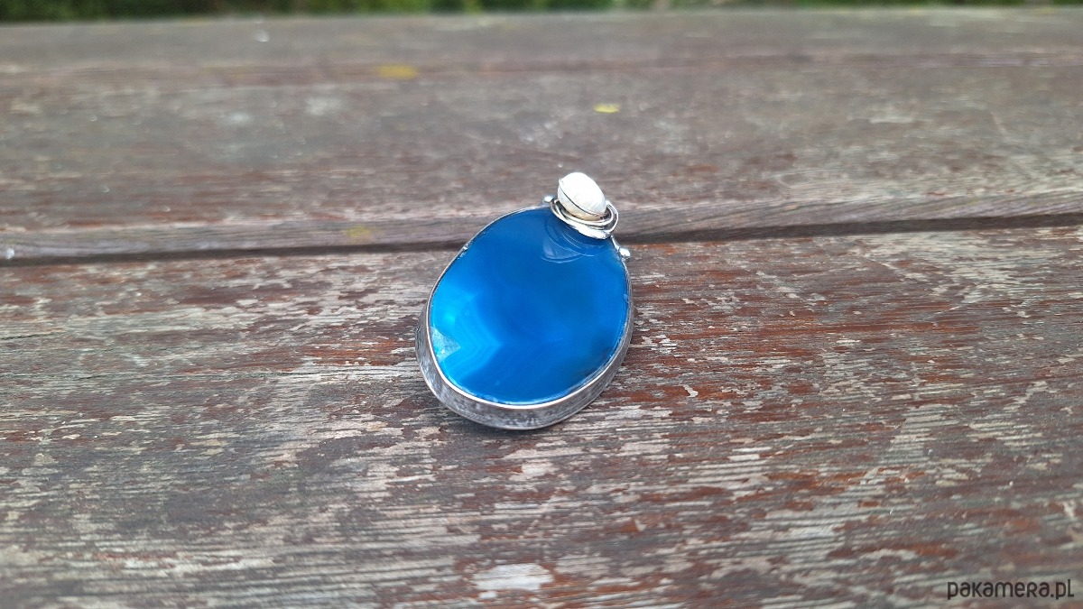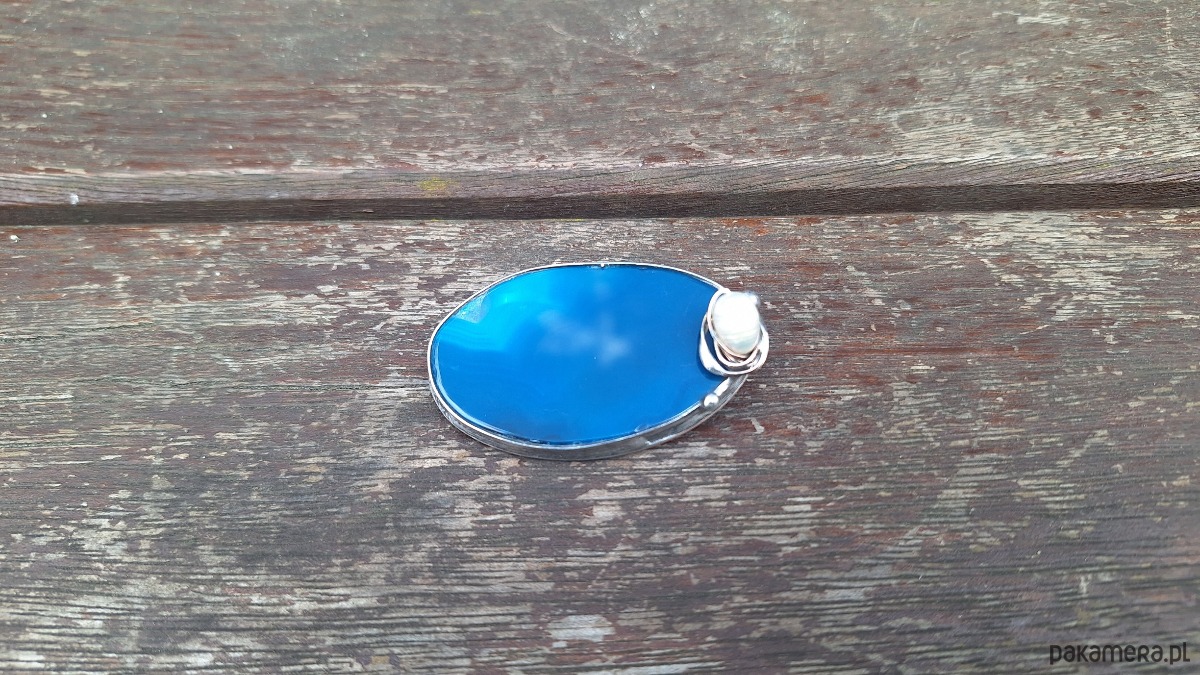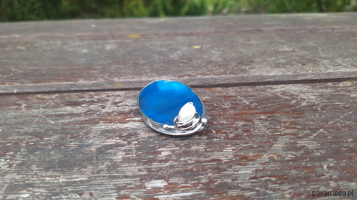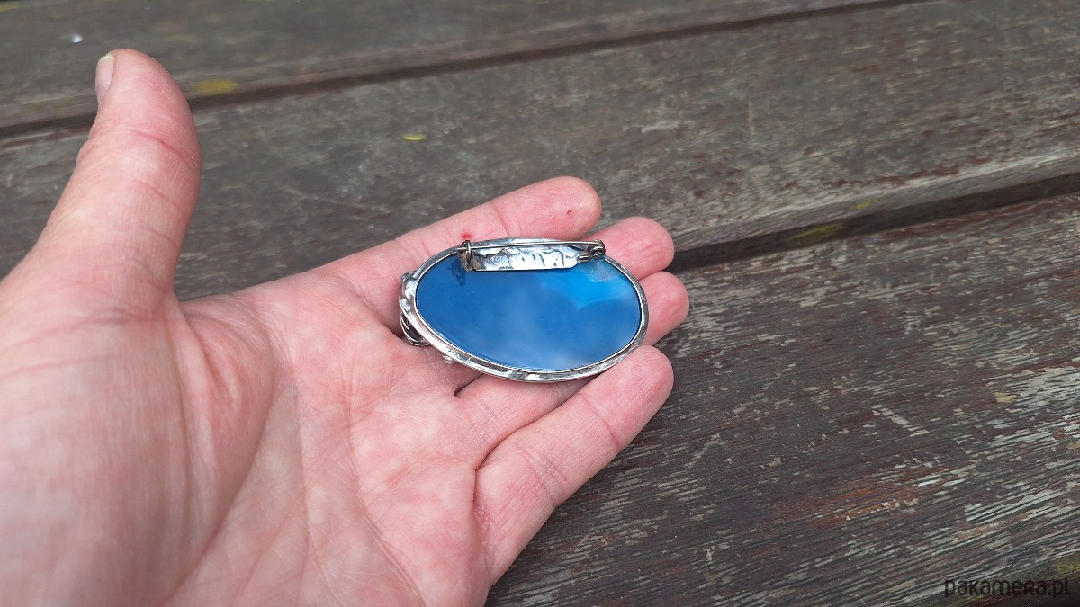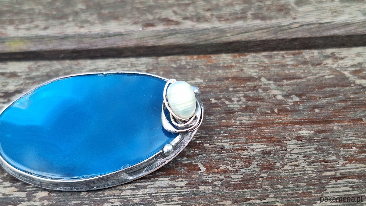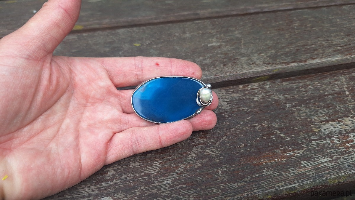 Broszka wykonana z miedzi, cyny, perły i agatu. Wymiary ok. 5.5 na 3 m. Zapięcie metalowe.