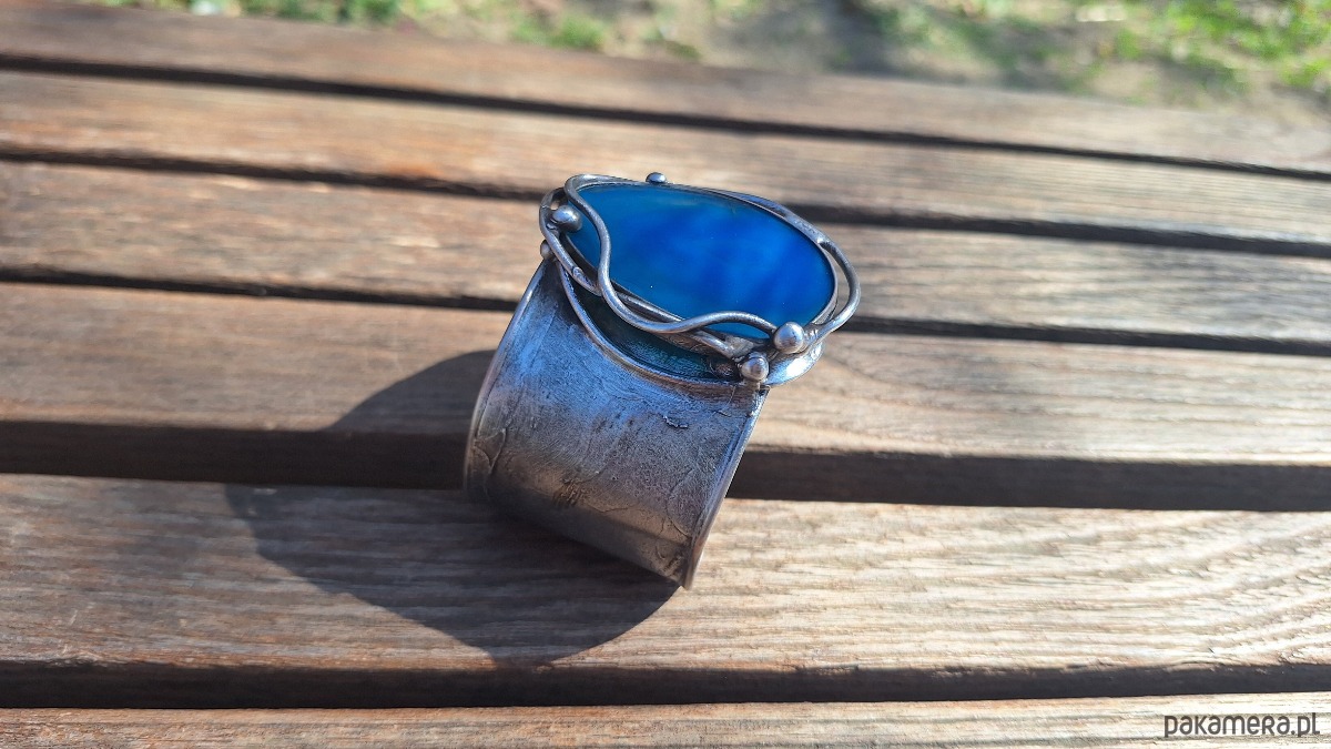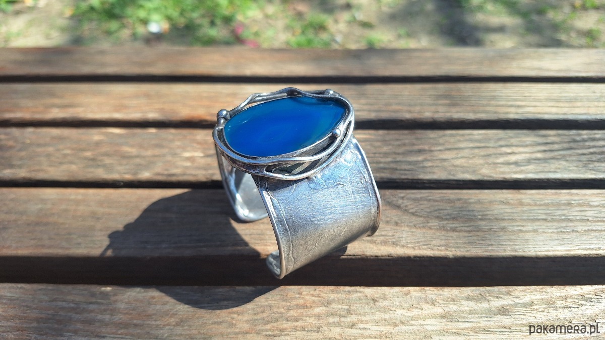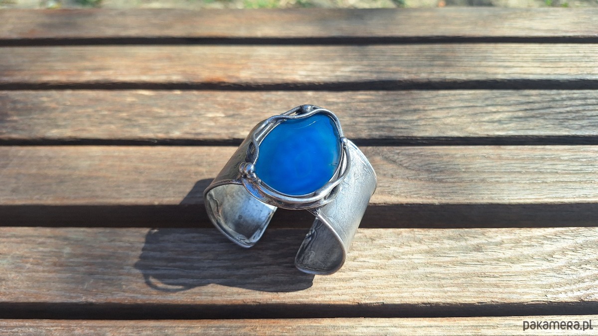 Bransoletka wykonana z miedzi, cyny i agatu. Szerokość ok. 4 cm. Regulowana.