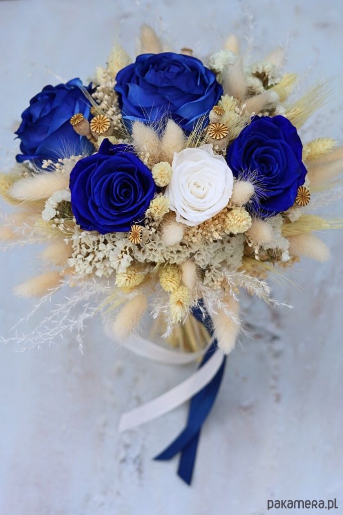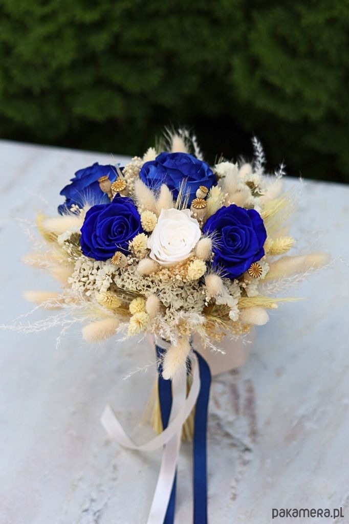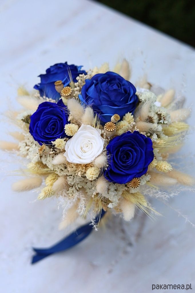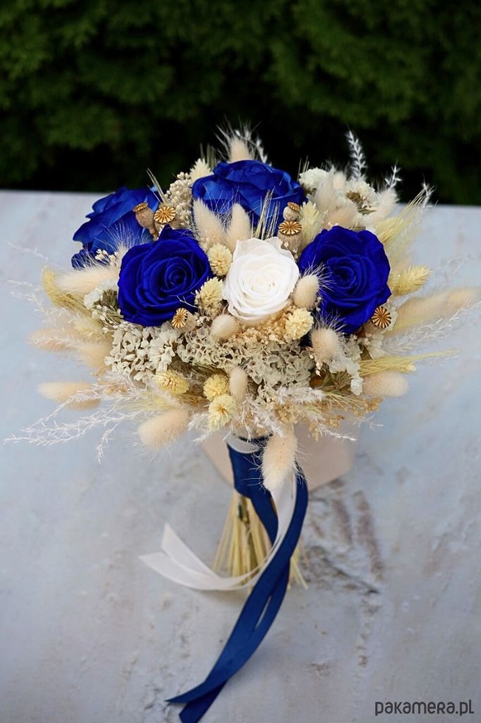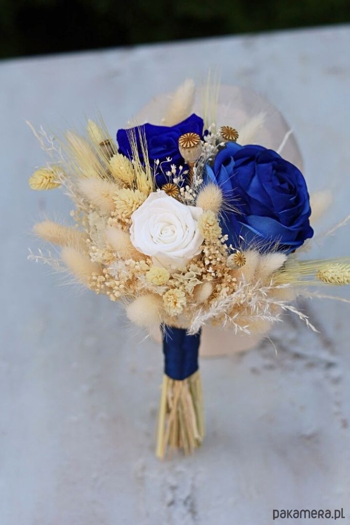 Bukiet ślubny w kolorze szafirowym to wyjątkowa kompozycja, która zachwyca swoją elegancją i wyjątkowym zestawieniem kolorów. W bukiecie znajdują się: szafirowe i białe wieczne róże, kremowe suszone trawy i kwiaty, wysokiej jakości kwiaty z tkaniny.
