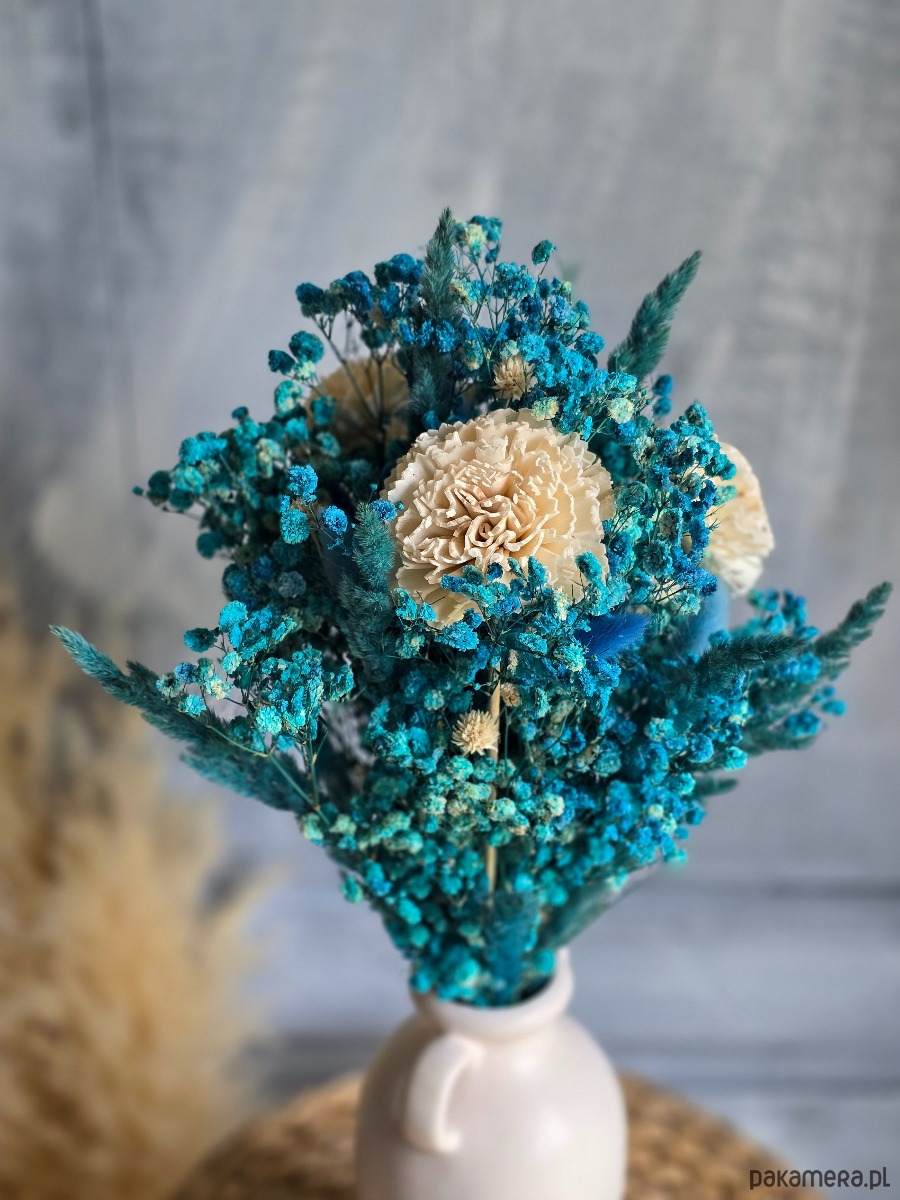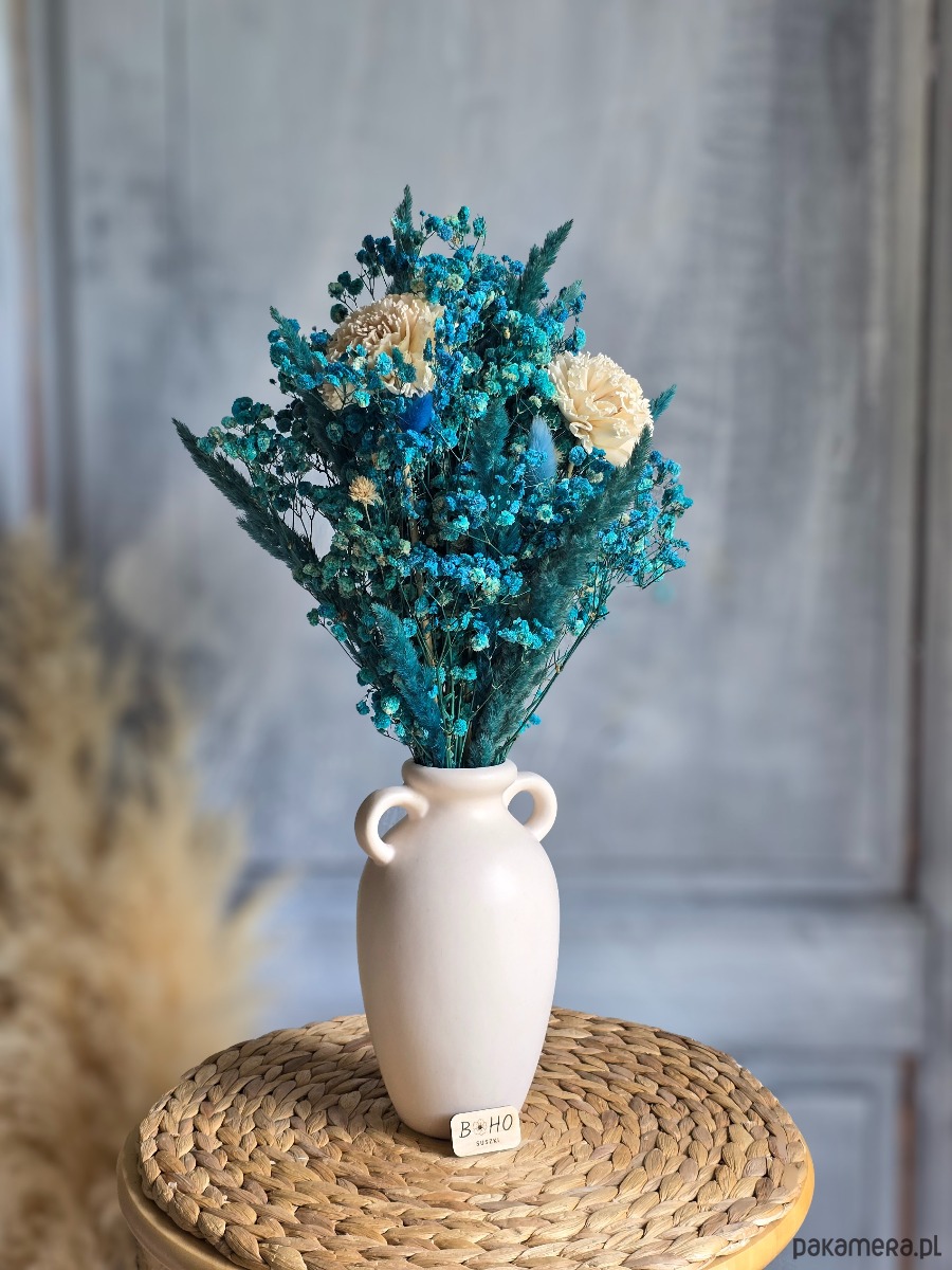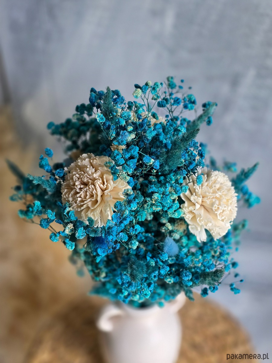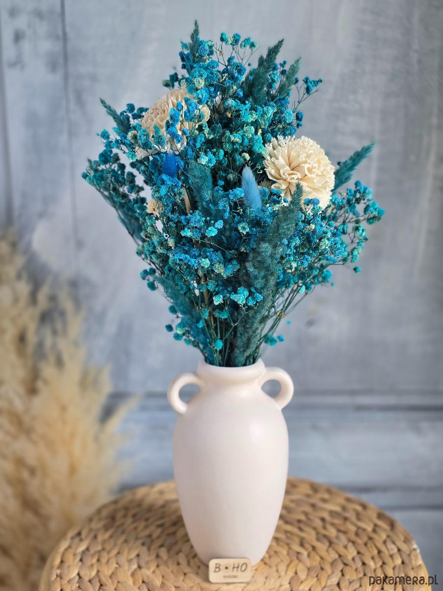 💐 Bukiet składa się z niebieskiej gipsówki, kwiatów shola oraz suszonych roślin. Doskonały wybór na dekorację wiosenną i letnią, a także jako całoroczna ozdoba wnętrza. Sprawdzi się również jako prezent na baby shower, czy miły upominek dla bliskiej osoby.