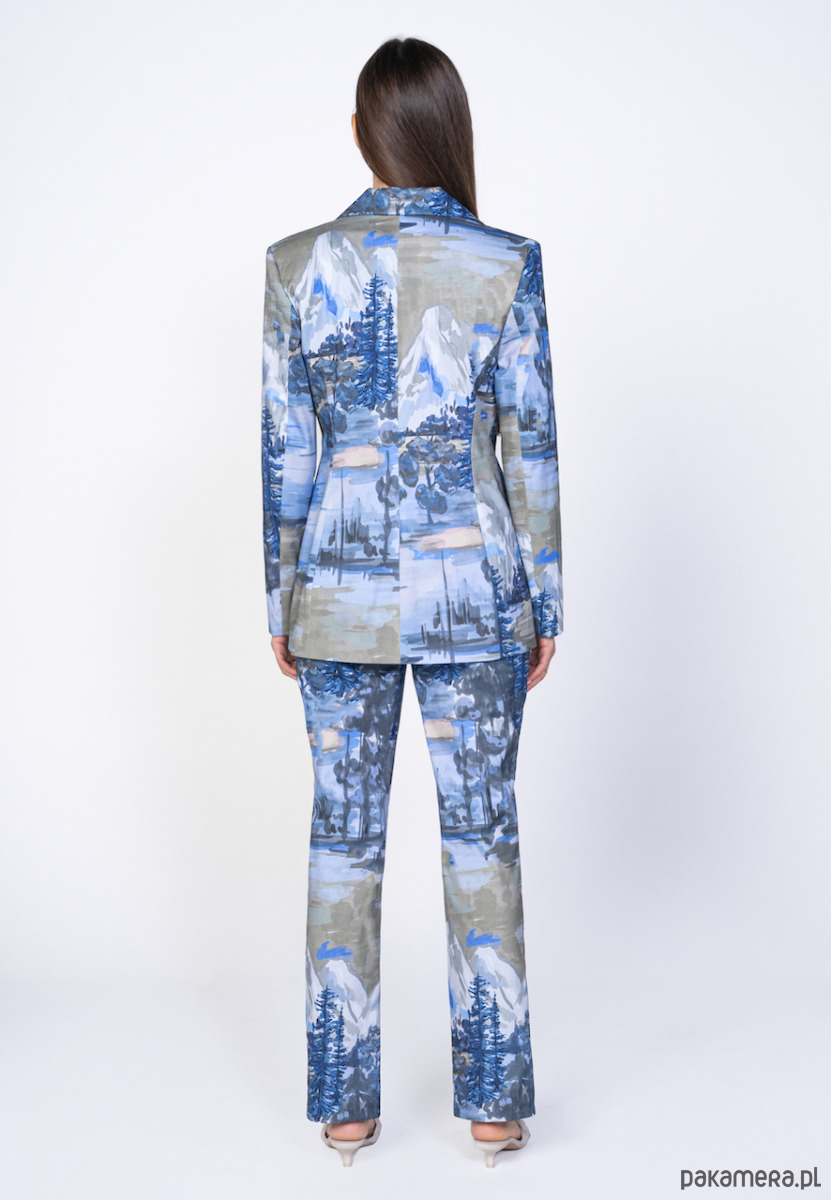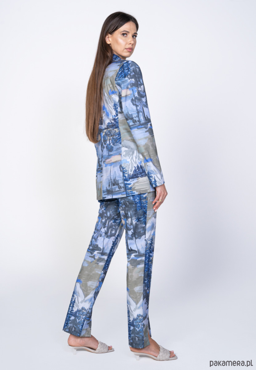 W skład zestawu wchodzi zapinana na 2 guziczki marynarka oraz spodnie z rozcięciem na dole zapinane na zamek błyskawiczny.