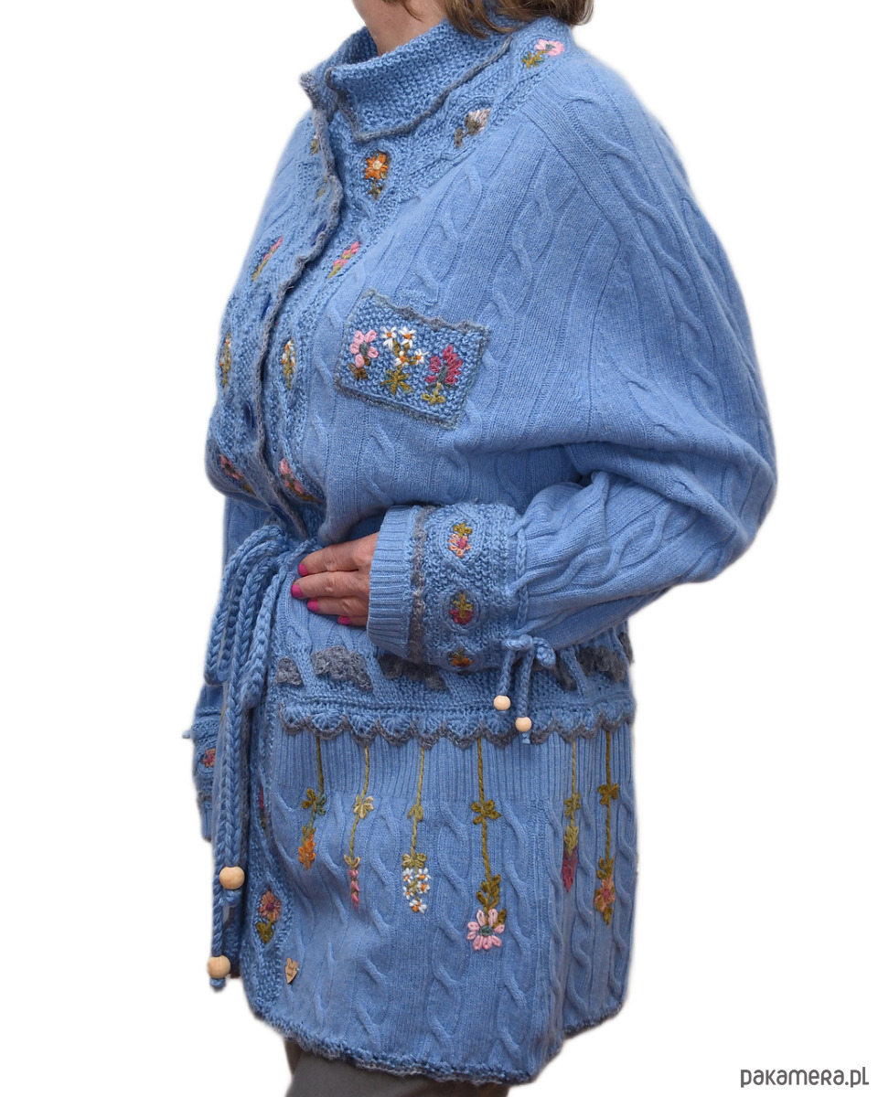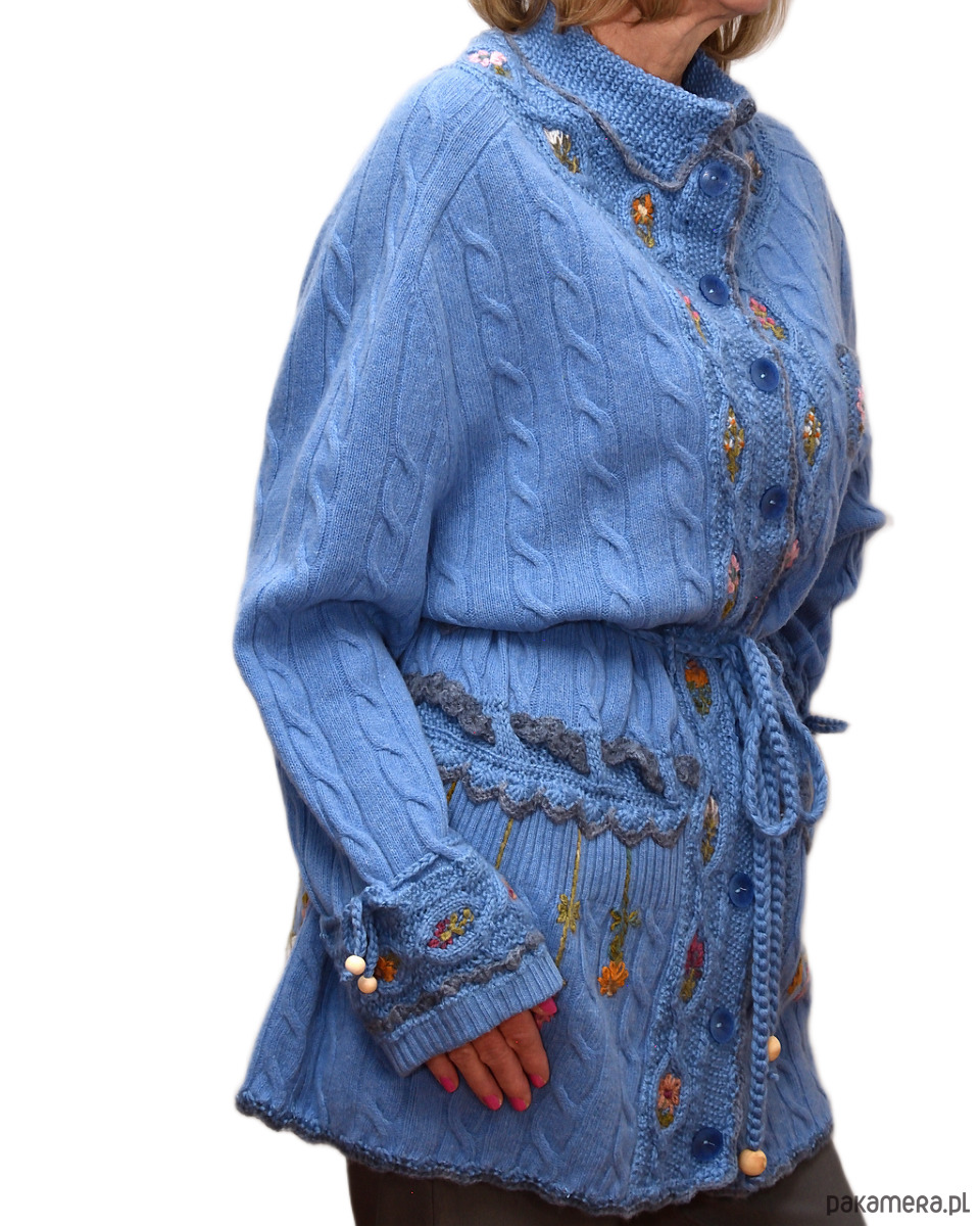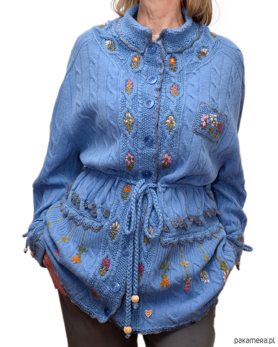 Niebieski kardigan haftowany ręcznie, rozmiar XL/XXL