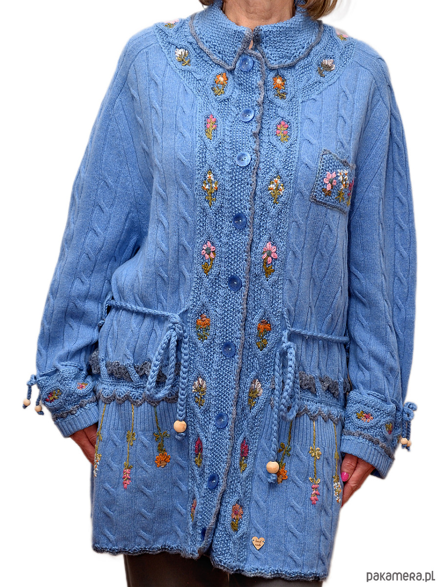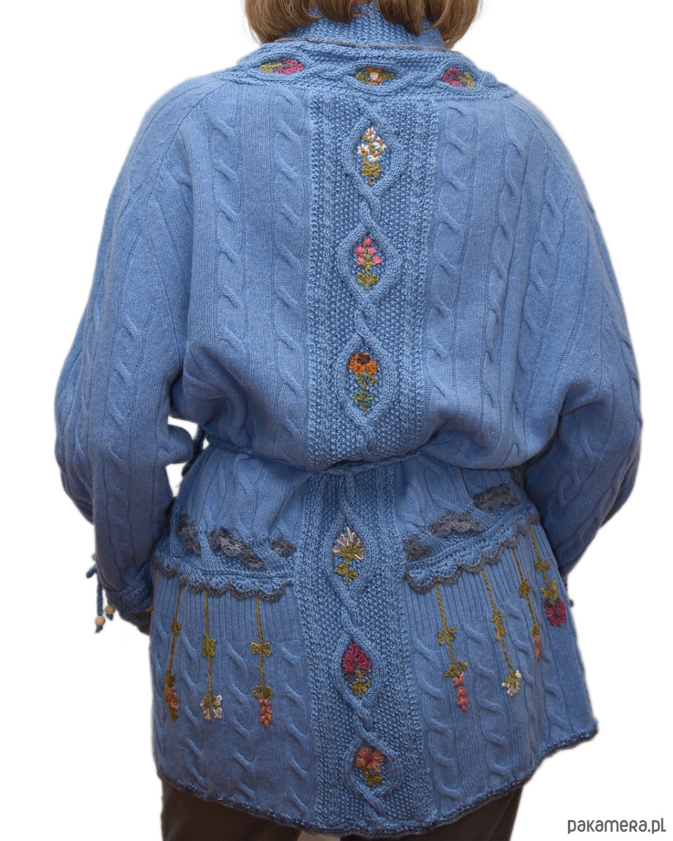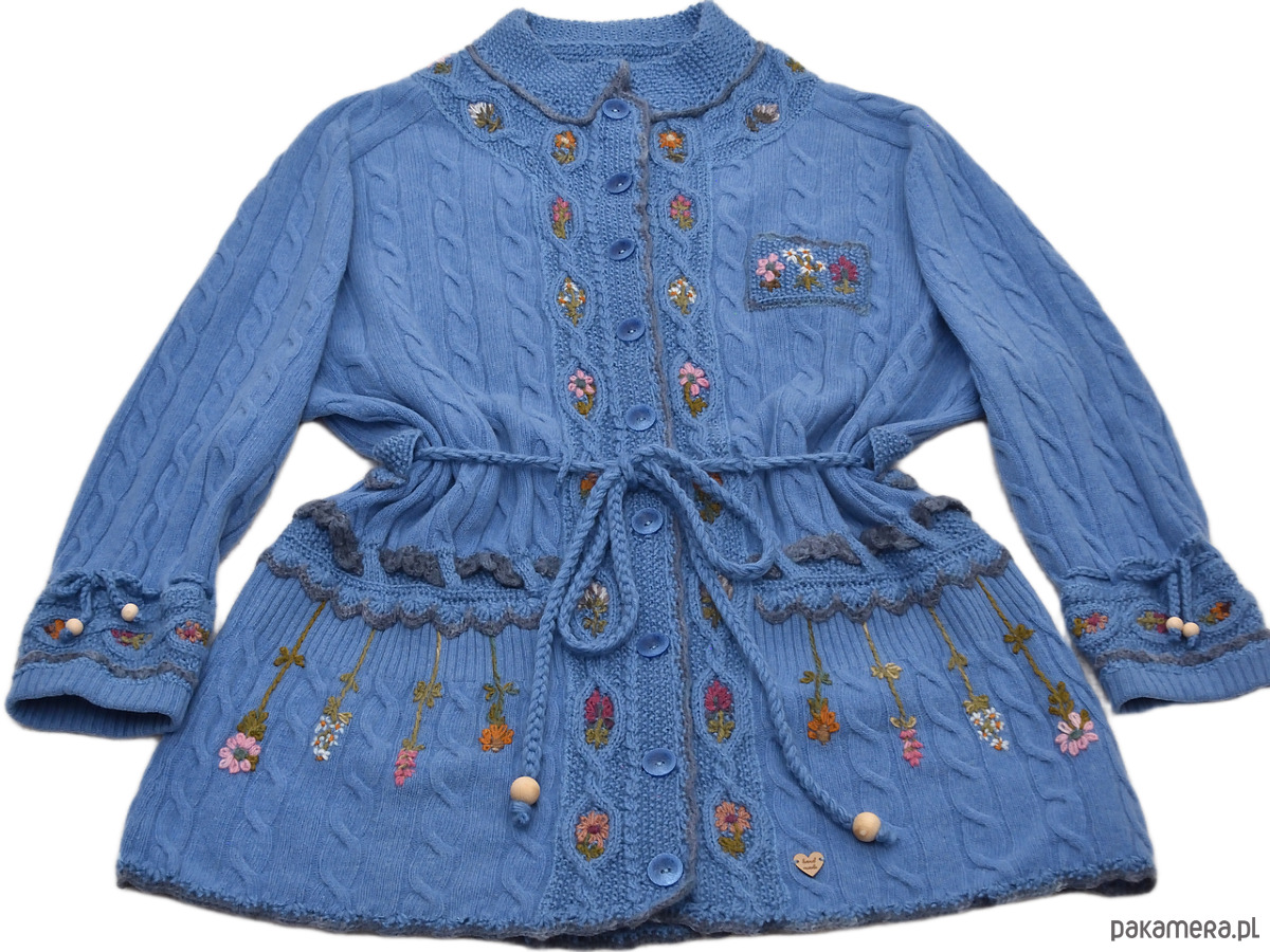 Niebieski kardigan haftowany ręcznie, rozmiar XL/XXL