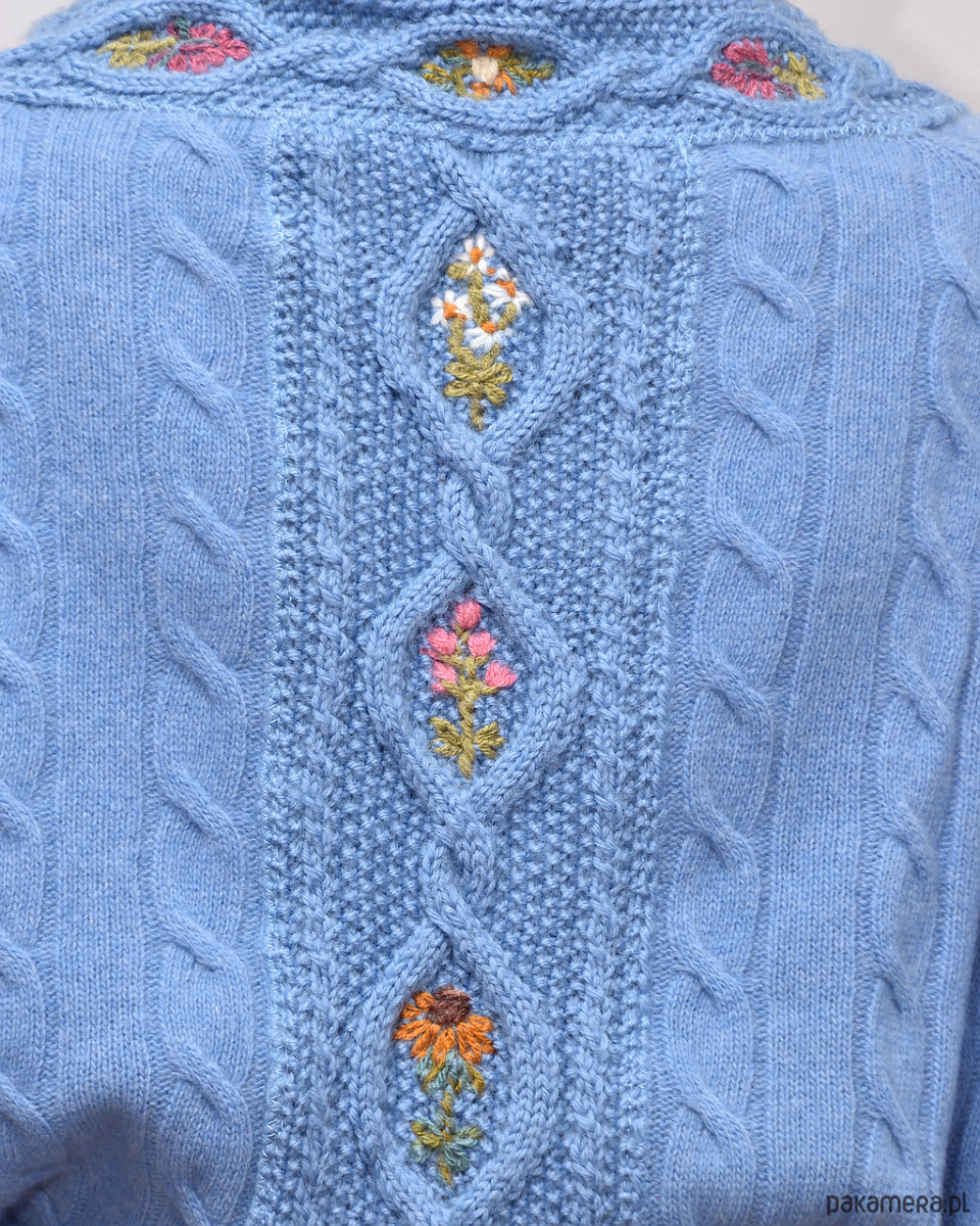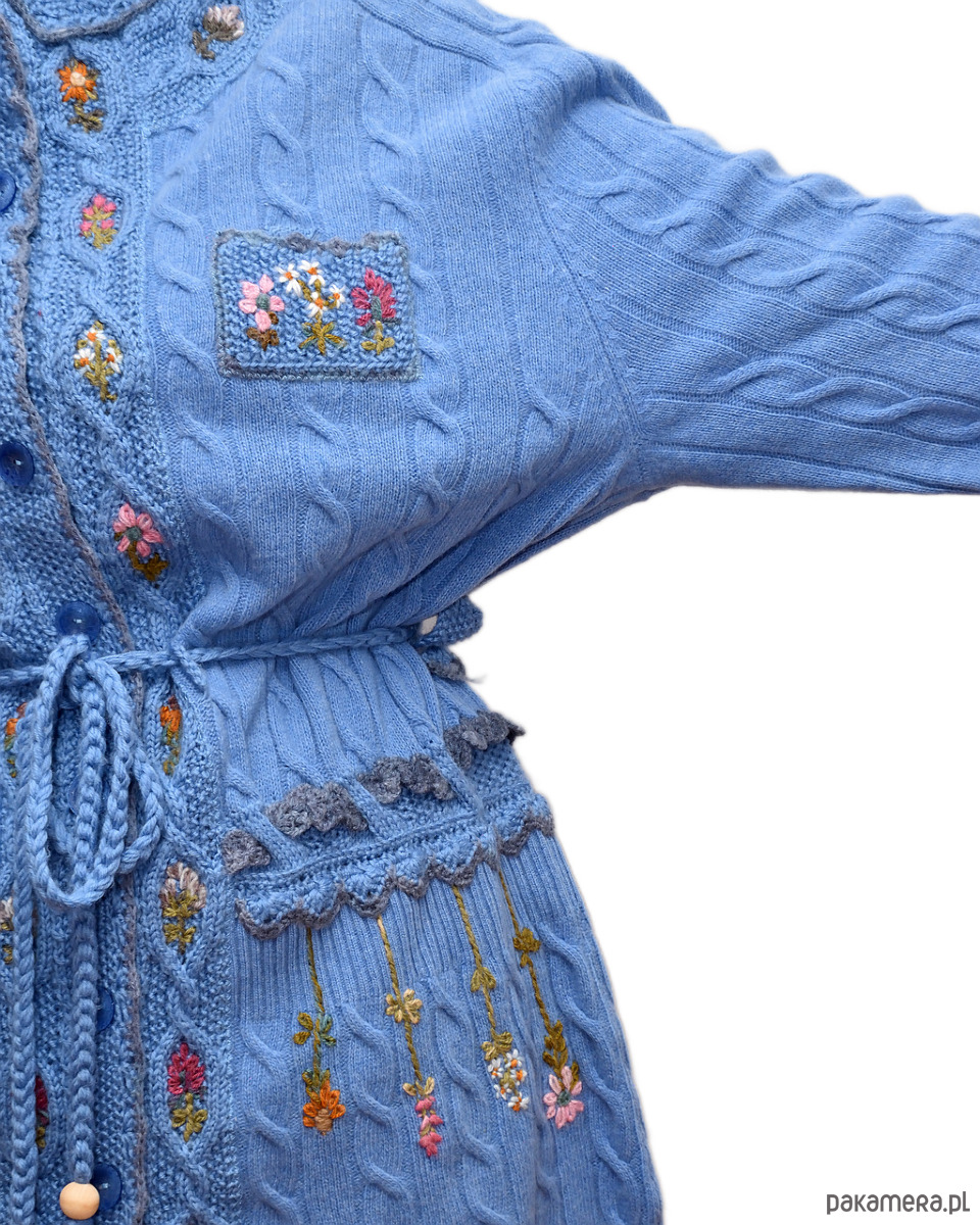 To sweter, który pozwoli Ci wyróżnić się na tle innych stylizacji. Nawiązujący wyglądem do stylu vinted, doda koloru, energii i uroku Twojej garderobie. Subtelne polne kwiaty, wyhaftowane ręcznie w okienkach strukturalnych rombów i na dole swetra oraz szydełkowe wykończenia, nadają mu unikatowy charakter. Wiązanie w talii podkreśla atuty sylwetki.